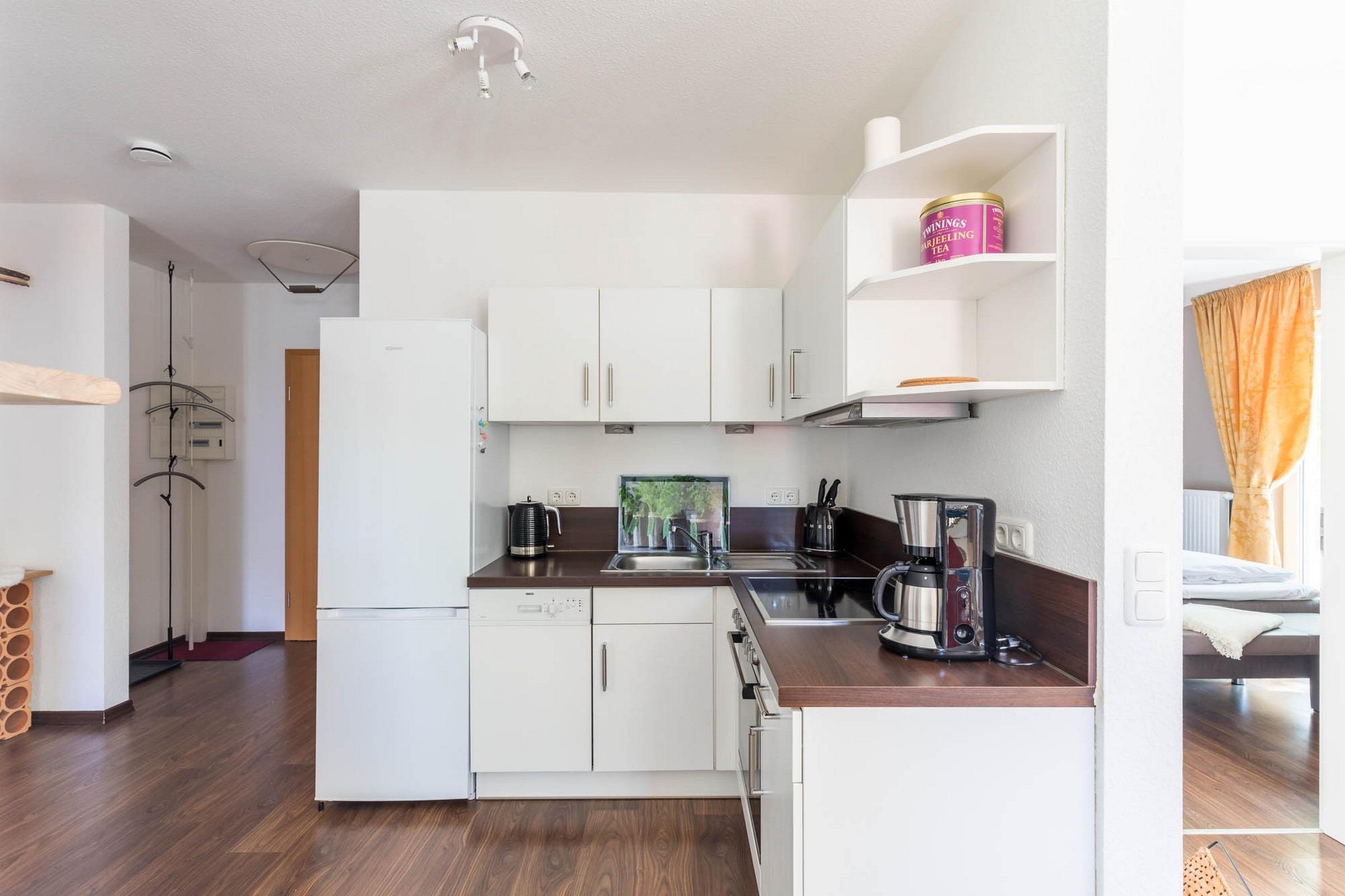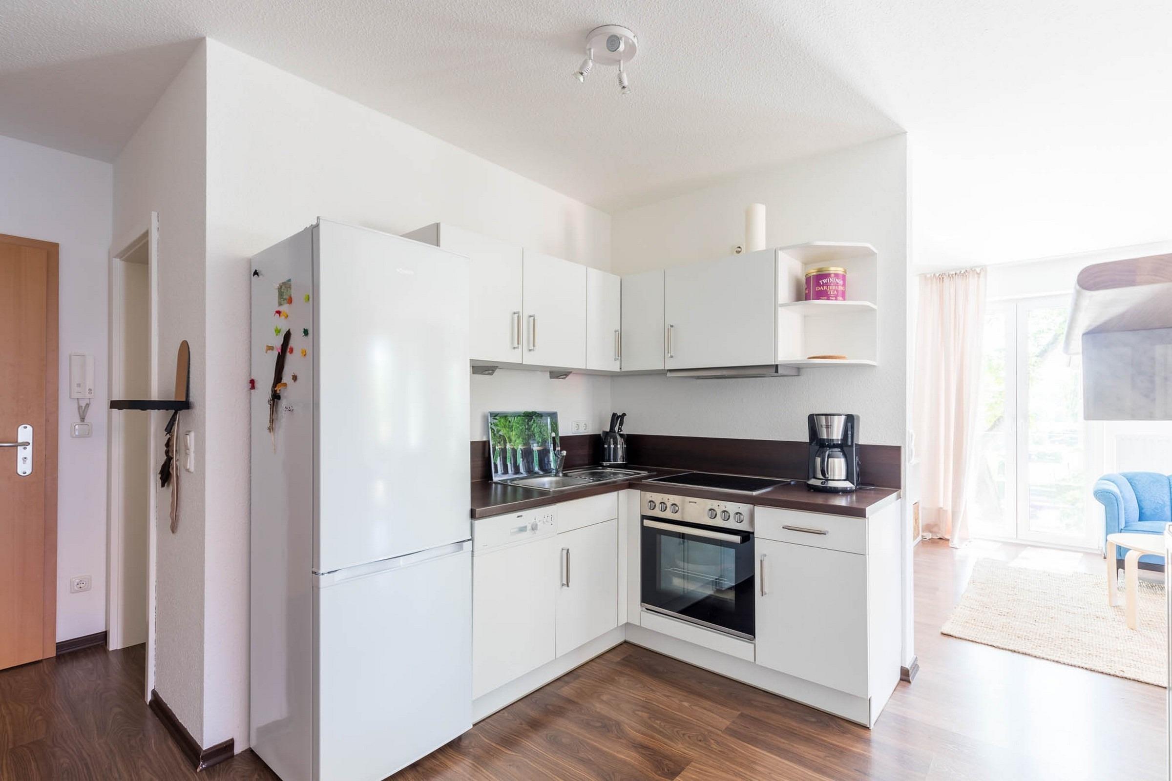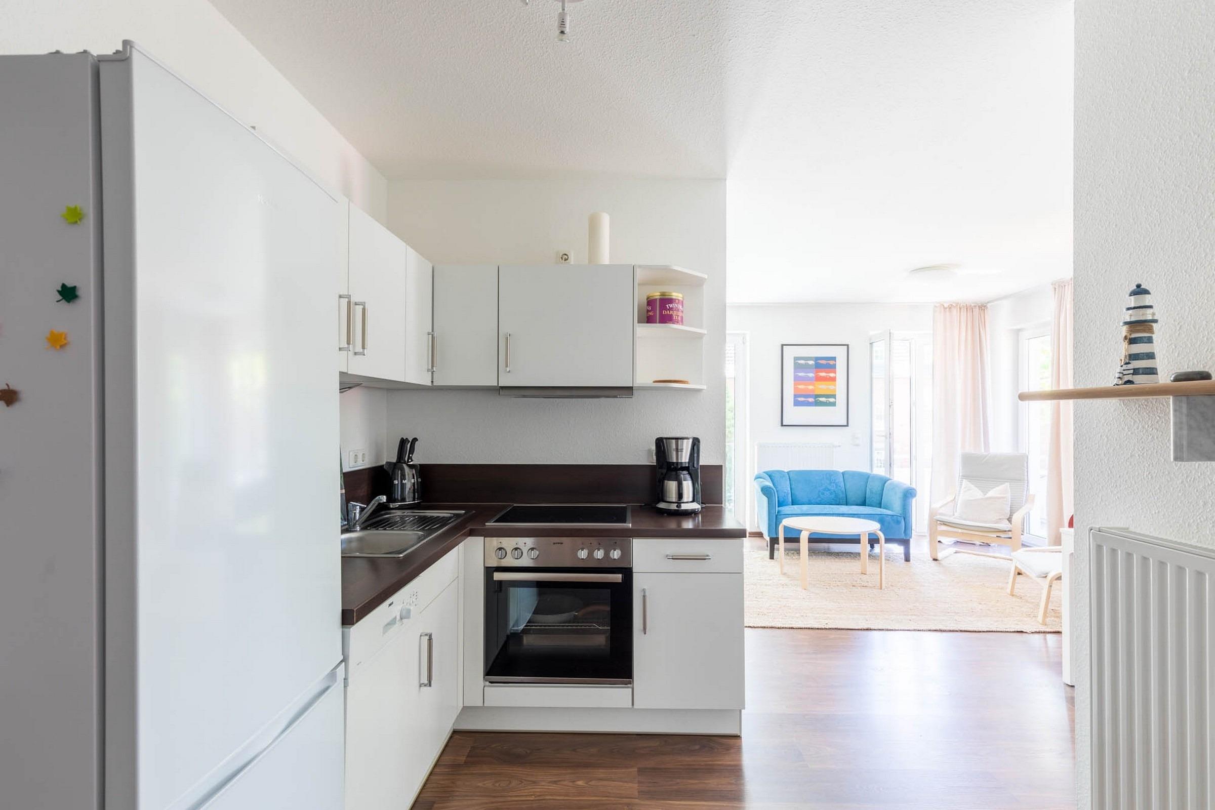 Die moderne, offene Küche ist mit allem eingerichtet, was man benötigt, um kulinarische Gaumenfreuden zu zaubern, z. B. Herd und Backofen sowie Spülmaschine.