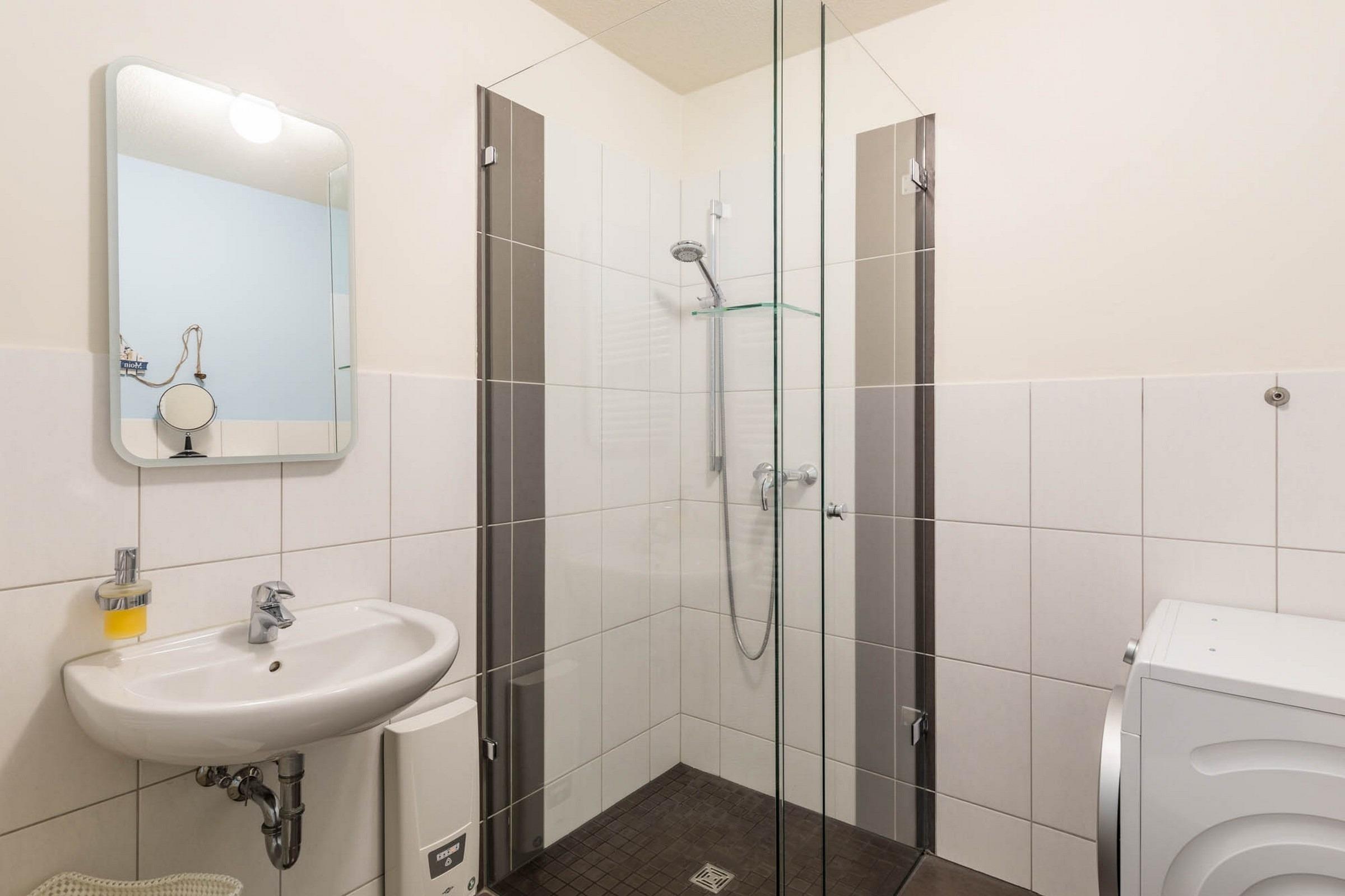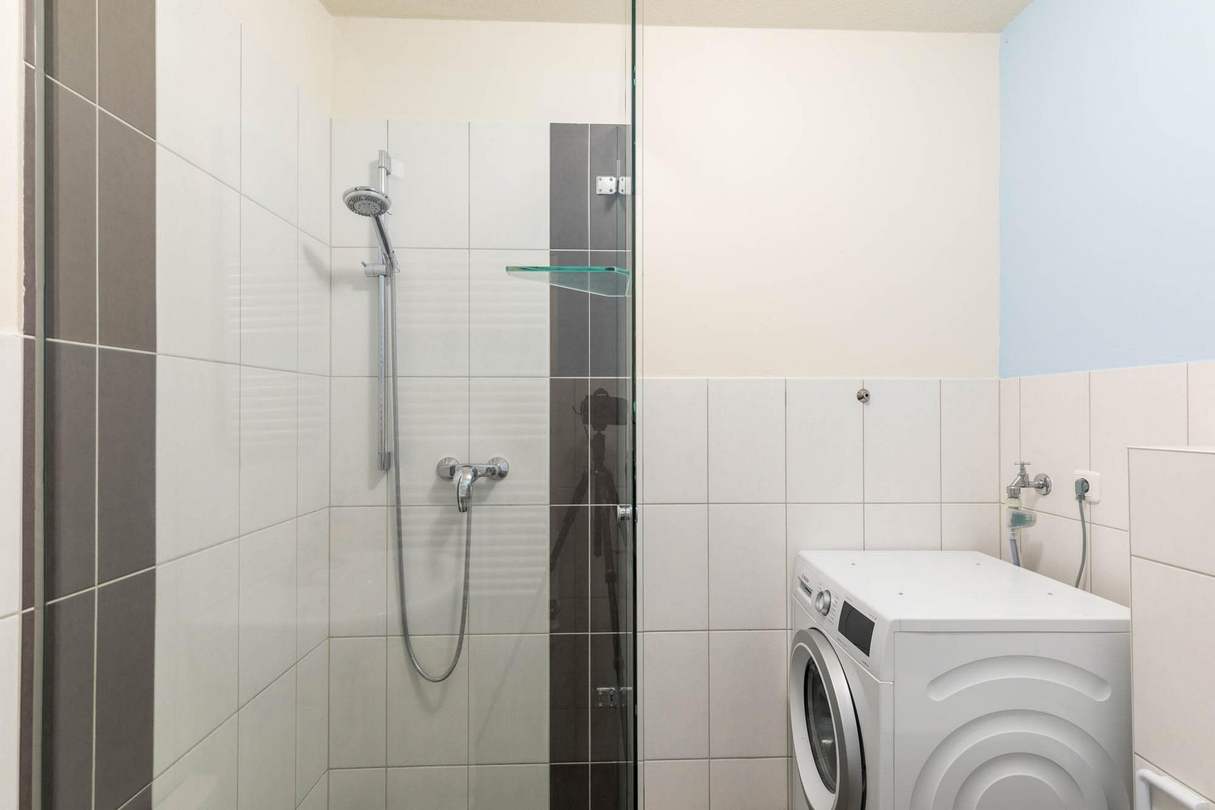 Ergänzt wird die Ausstattung durch ein modern eingerichtetes Duschbad mit ebenerdiger Dusche, Waschmaschine und einen möblierten Eckbalkon nach Südwesten.