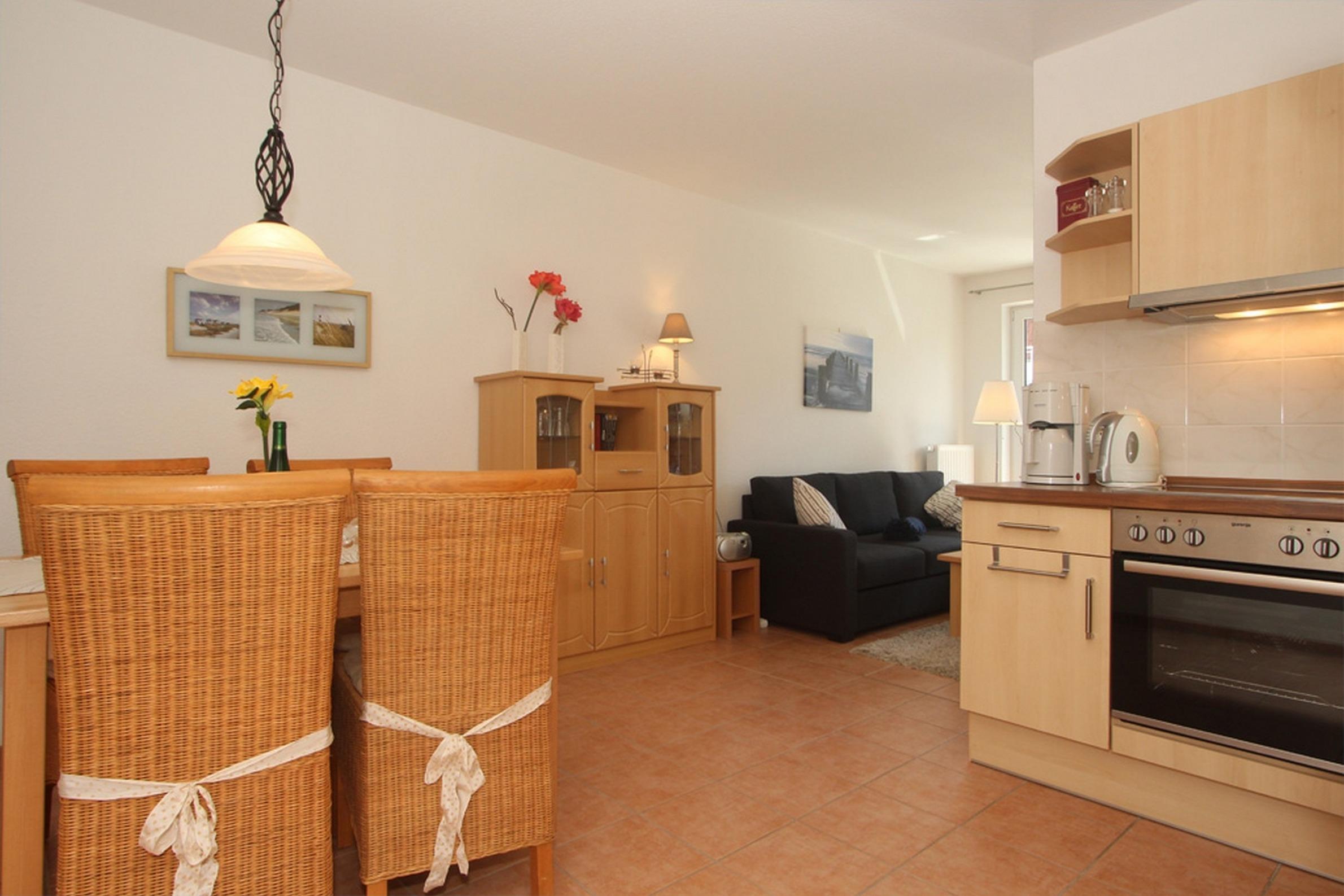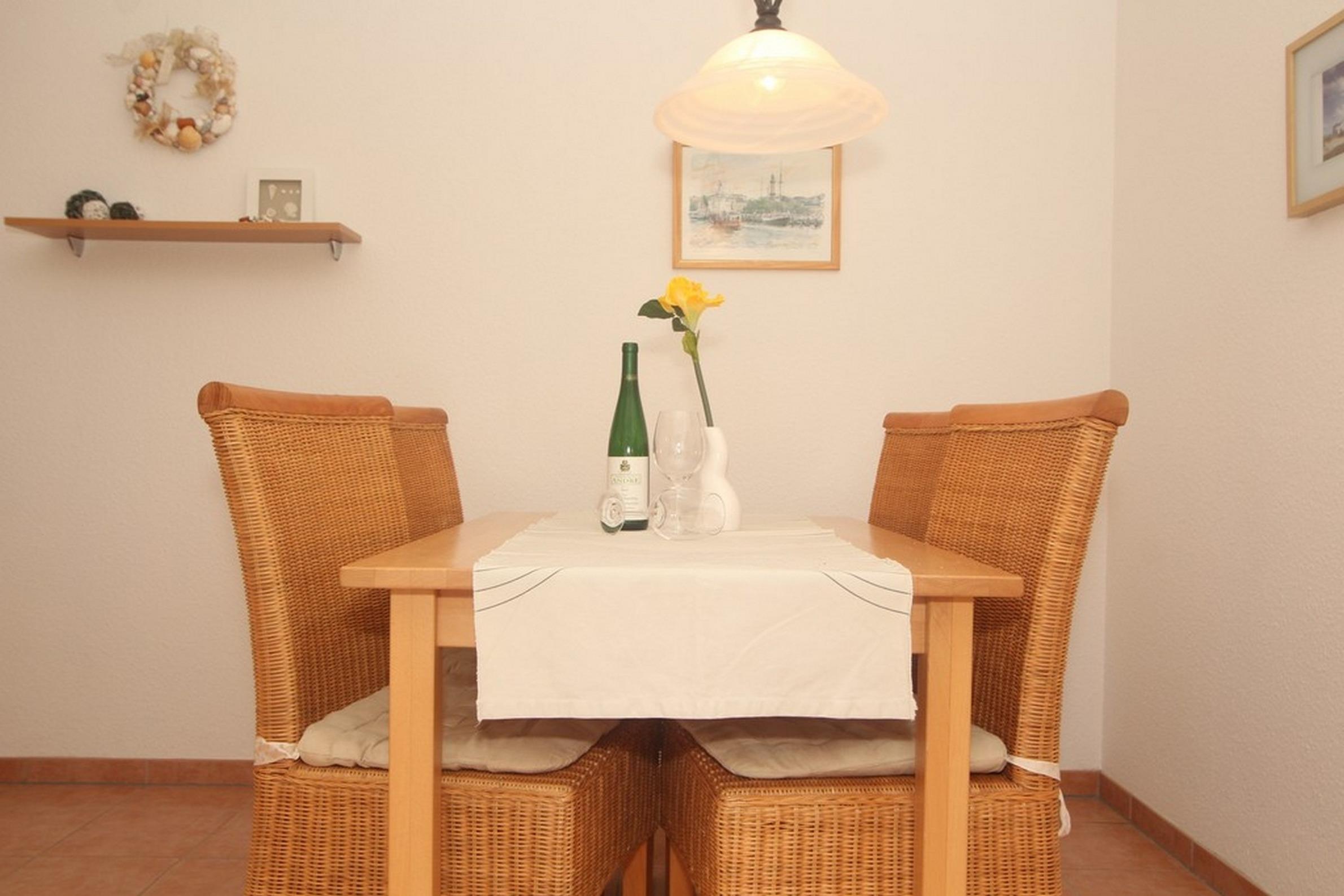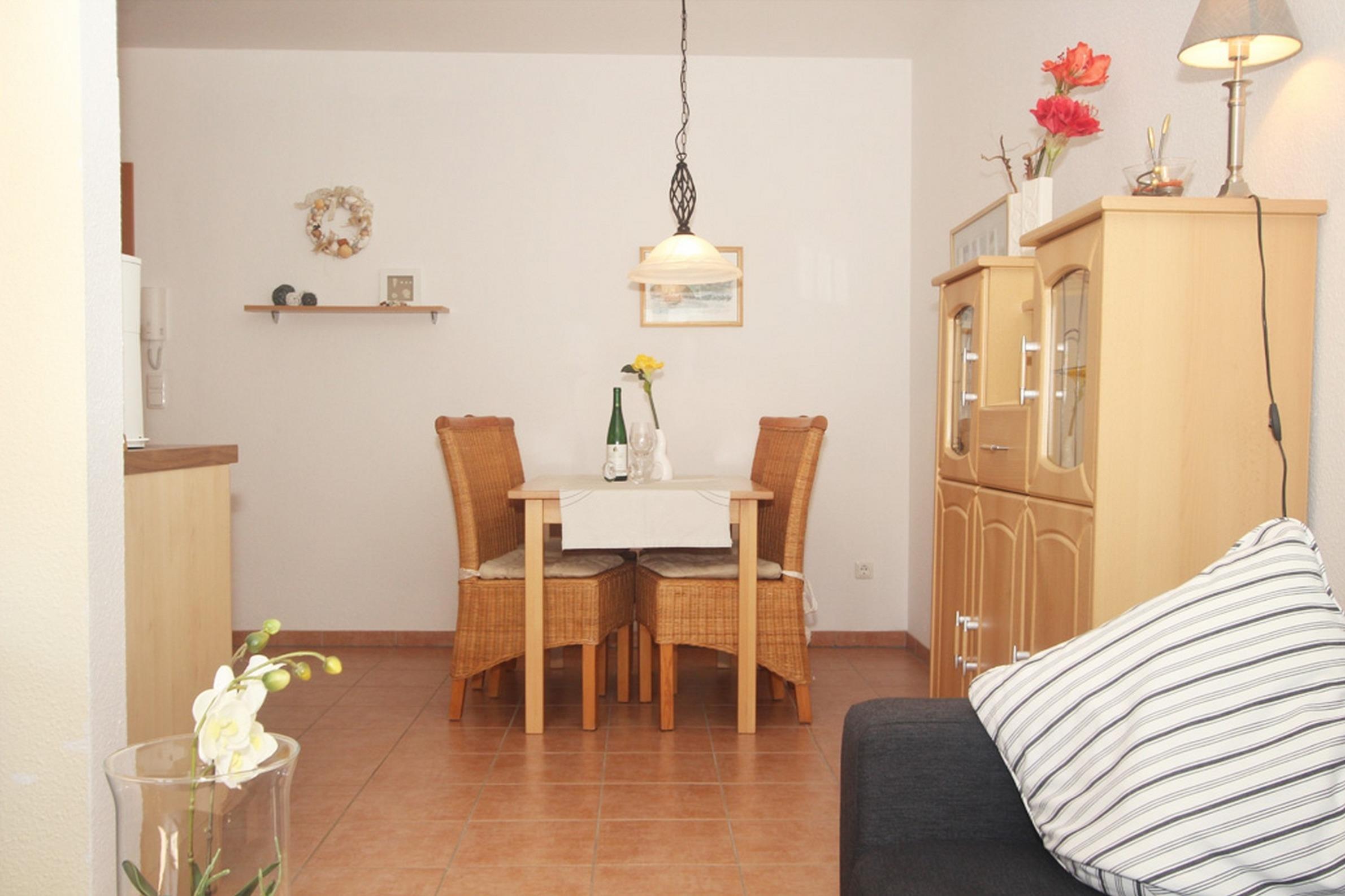 Sie verfügt über einen Wohn- und Essbereich, der hell und freundlich eingerichtet ist. In der Ferienwohnung stehen Flatscreen-TV, DVD Player und Radio mit CD-Player zur Verfügung. Falls Bedarf besteht kann im Wohnzimmer mit der Schlafcouch eine dritte Schlafgelegenheit genutzt werden.