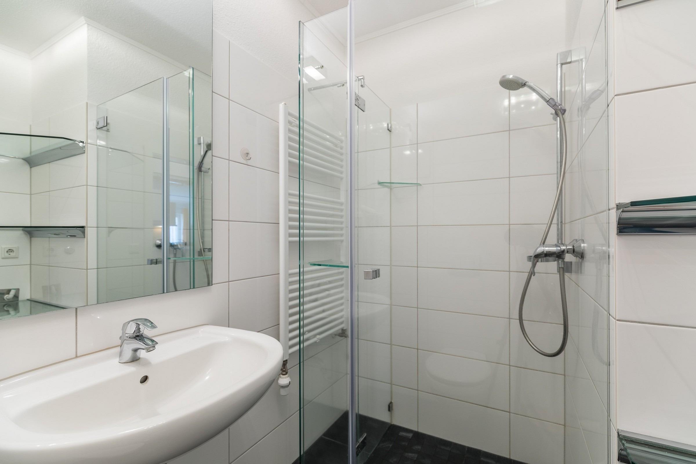 Das Badezimmer ist mit einer ebenerdigen Dusche, WC und Fußbodenheizung ausgestattet.