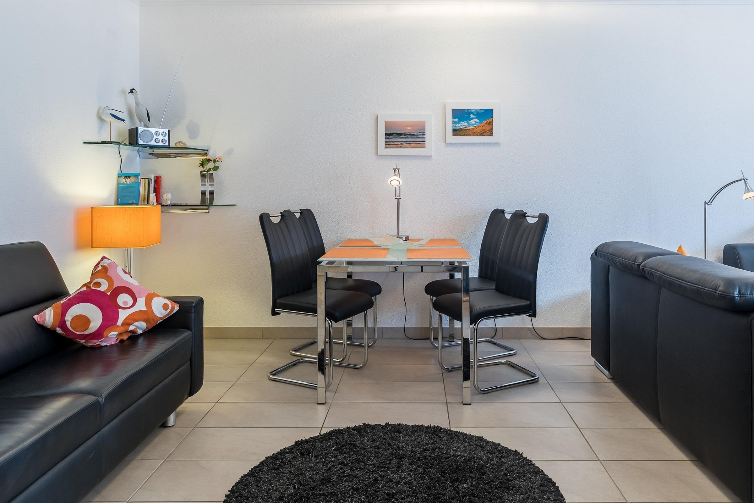 Der offene Wohn- und Essbereich ist mit separater Essecke und einer gemütlichen Wohnlandschaft komfortabel eingerichtet. Zur Unterhaltung befindet sich hier ein moderner SAT-TV mit Flatscreen. Von hier aus erreichen Sie auch den möblierten Balkon in Süd-West-Lage.