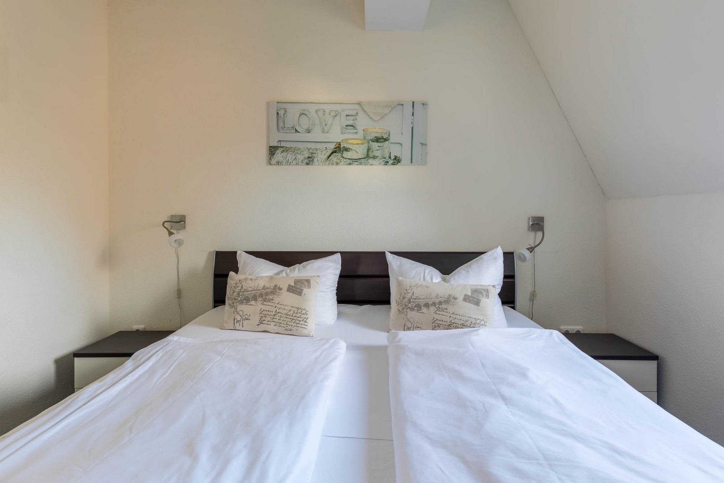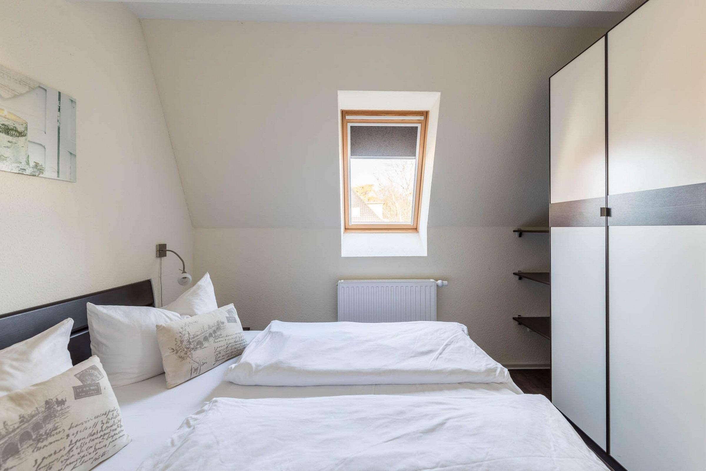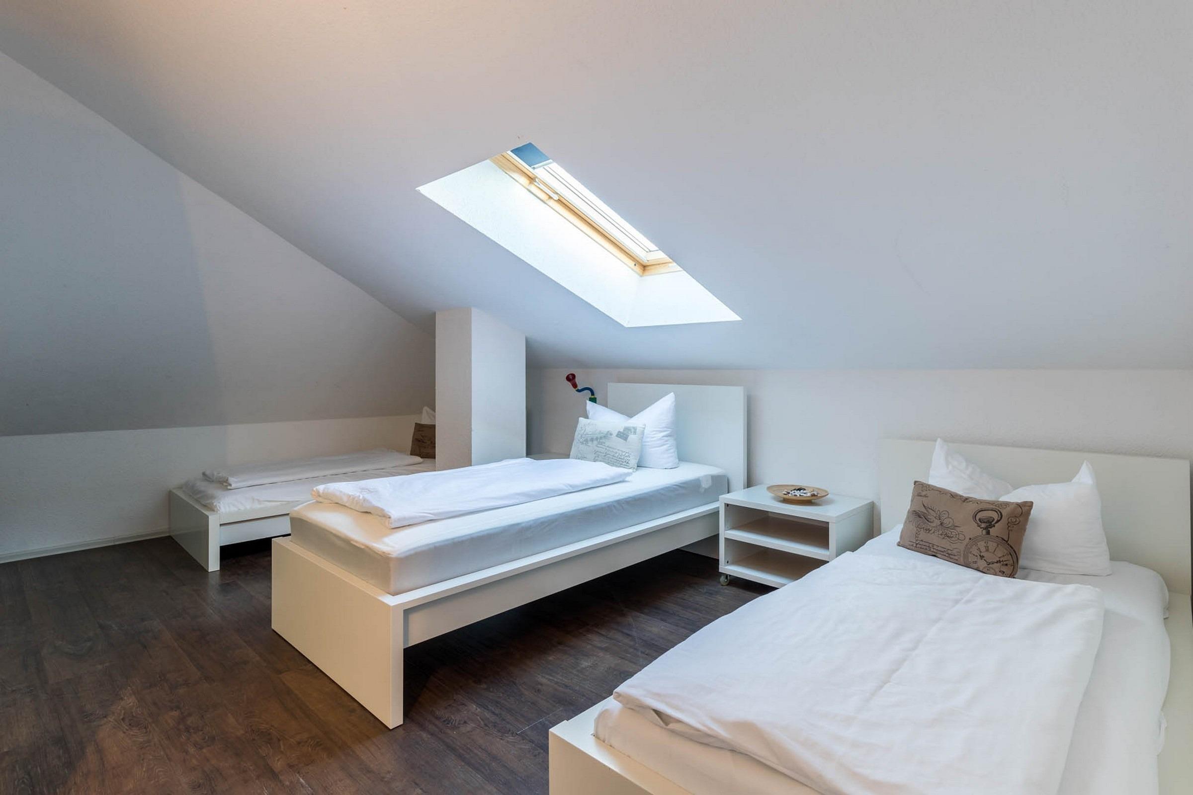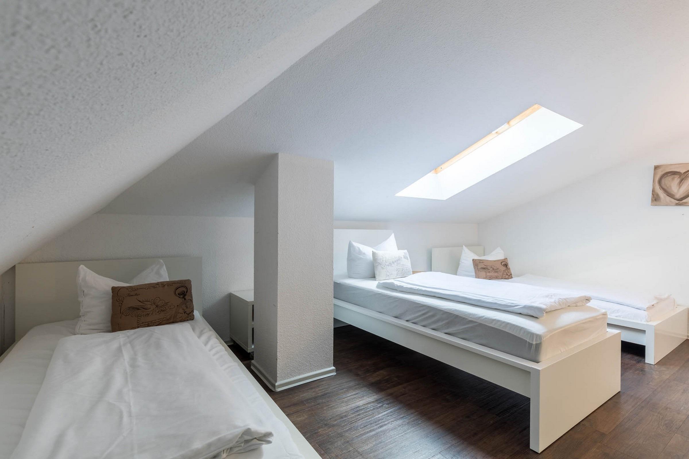 In dem Gäste-/ Kinderzimmer in der zweiten Wohnebene, im DG stehen drei Einzelbetten und ein Kleiderschrank. Hier befindet sich auch ein weiterer Fernseher mit DVD-Player.