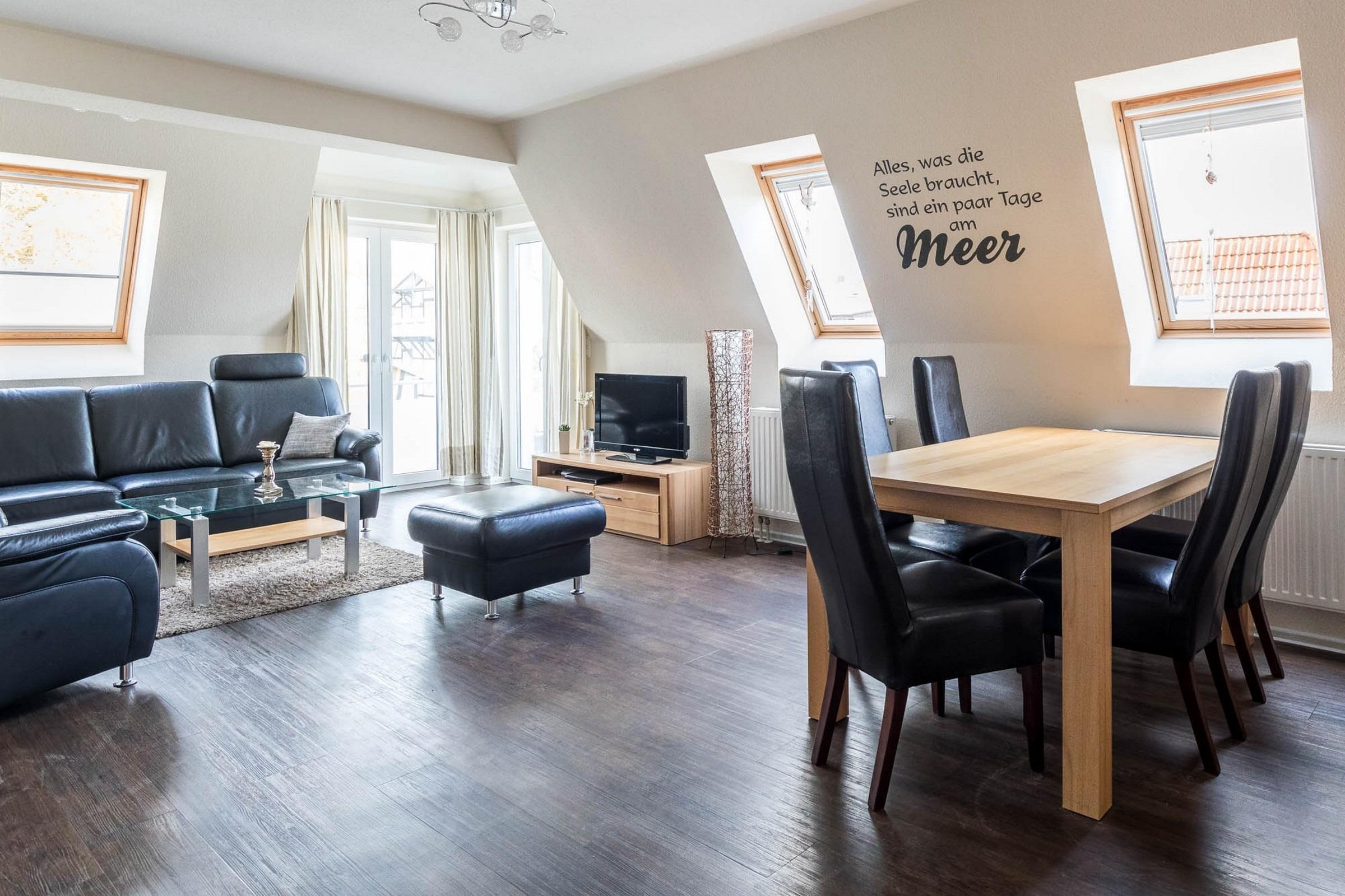 In der ersten Wohnebene gibt es einen hellen, offenen Wohn- und Essbereich sowie eine gemütliche Ess- und Sofaecke. Fernseher und CD-Player stehen hier u.a. für Sie zur Verfügung. Den möblierten Balkon können Sie vom Wohnbereich aus begehen.