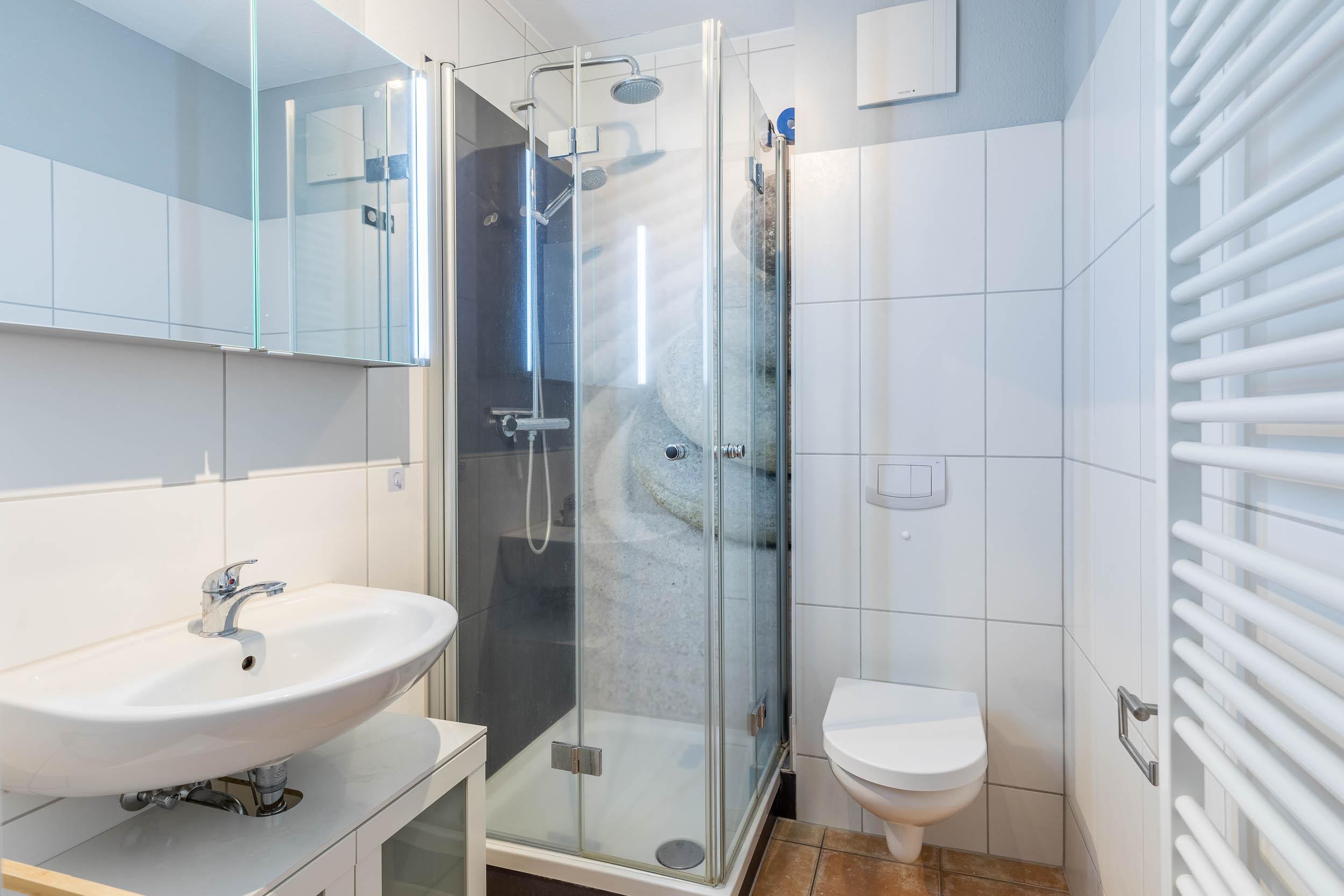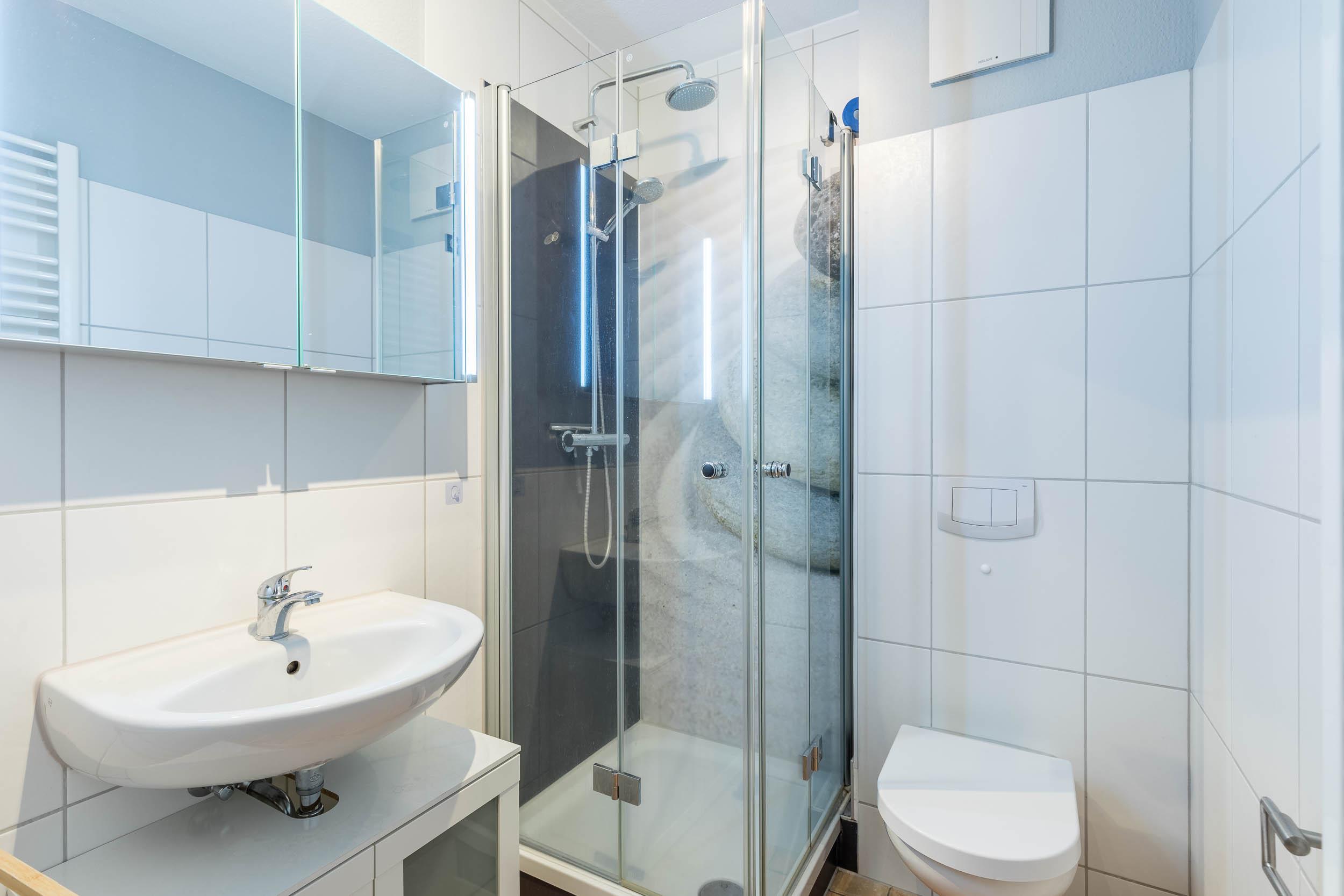 Modernes Badezimmer mit Extras: Das Badezimmer verfügt über eine Dusche und ein WC sowie eine Waschmaschine, die Ihnen kostenfrei zur Verfügung steht.