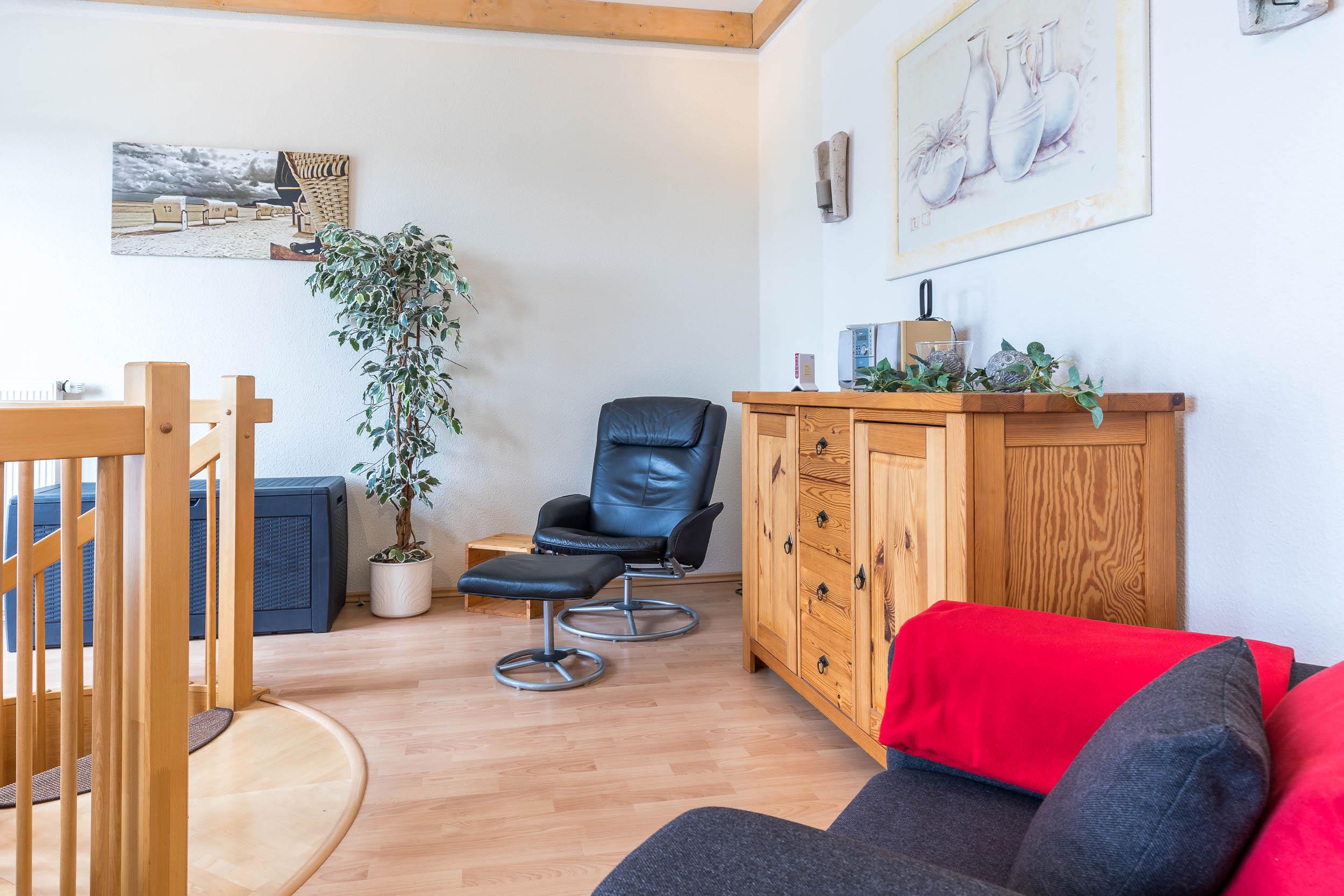 Wohnbereich mit Flair: Im Dachgeschoss erwartet Sie ein heller und offen gestalteter Wohnbereich als offene Galerie. Finden Sie Ihren Lieblingsplatz auf der großen Couchlandschaft und genießen Sie das Ambiente zum Wohlfühlen, Lesen und Träumen.