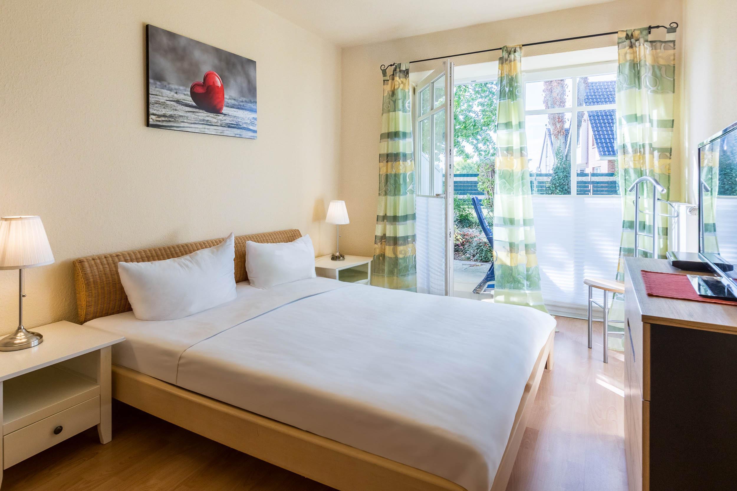 Das Schlafzimmer ist mit einem komfortablen Doppelbett, Kommode und einem zweiten Fernseher ausgestattet.