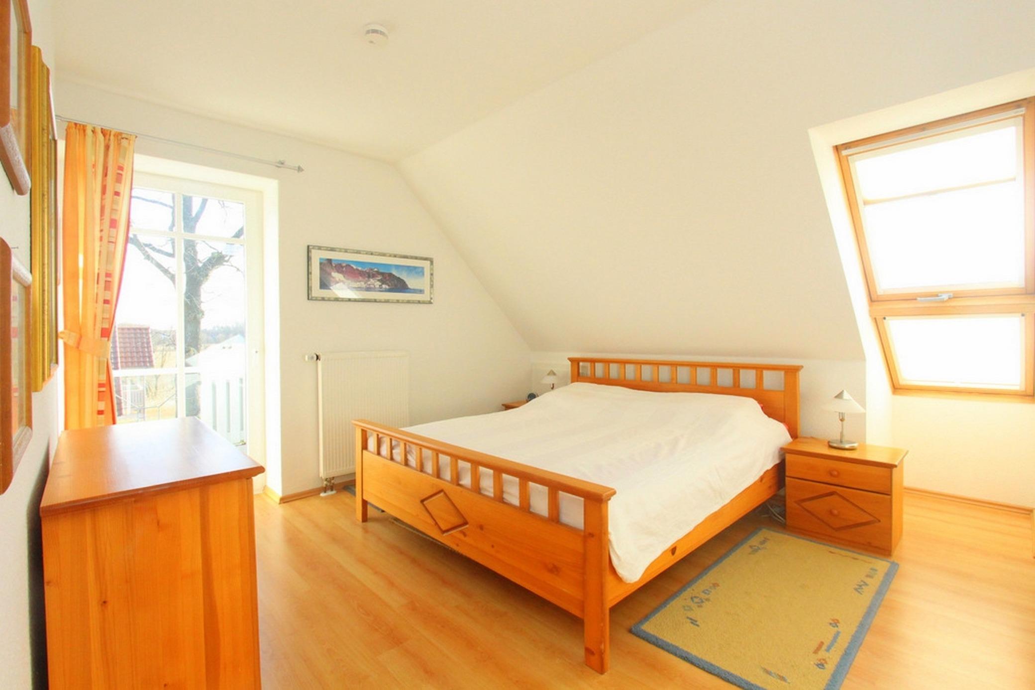 Das separate Schlafzimmer auf dieser Etage mit Doppelbett und einem großen Einbaukleiderschrank ist hell und freundlich möbliert.