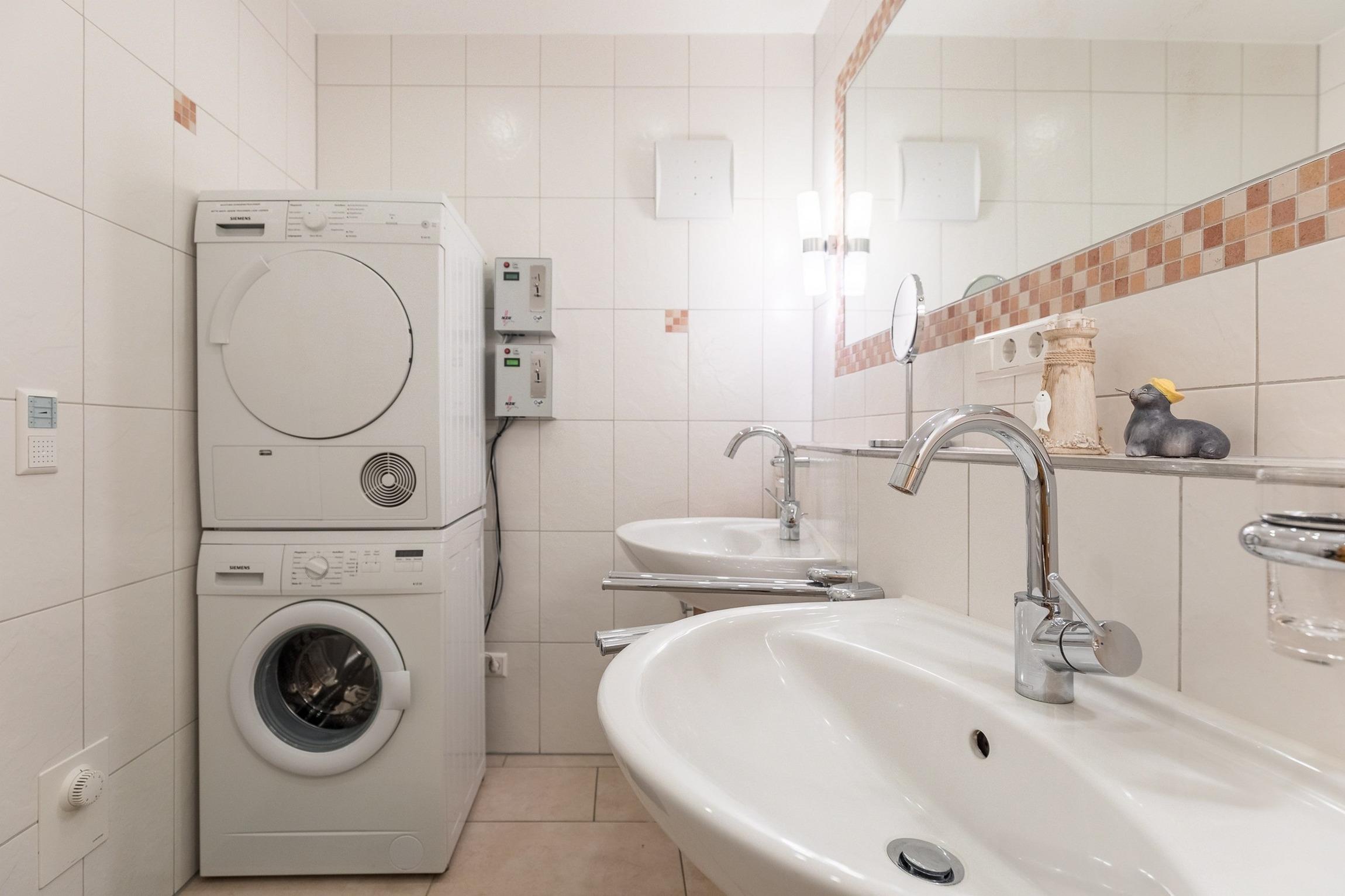 Praktischerweise ist das Badezimmer neben einer Dusche mit zwei Waschbecken ausgestattet - optimal für eine Familie. Waschmaschine und Trockner sind hier ebenfalls vorhanden und können gegen Gebühr in Anspruch genommen werden.