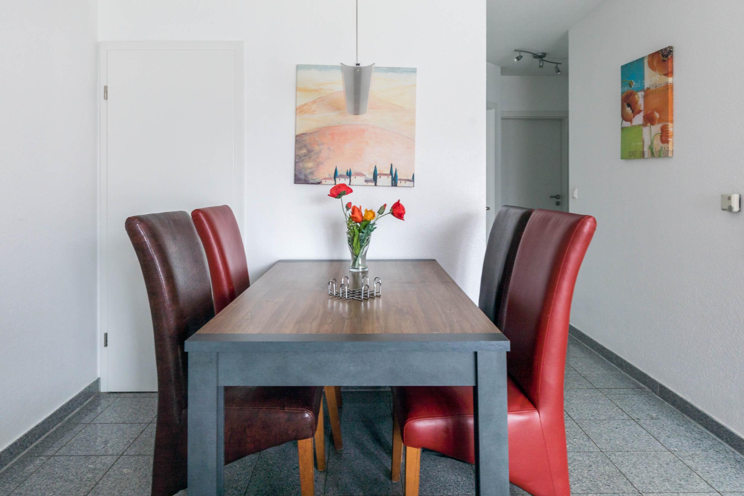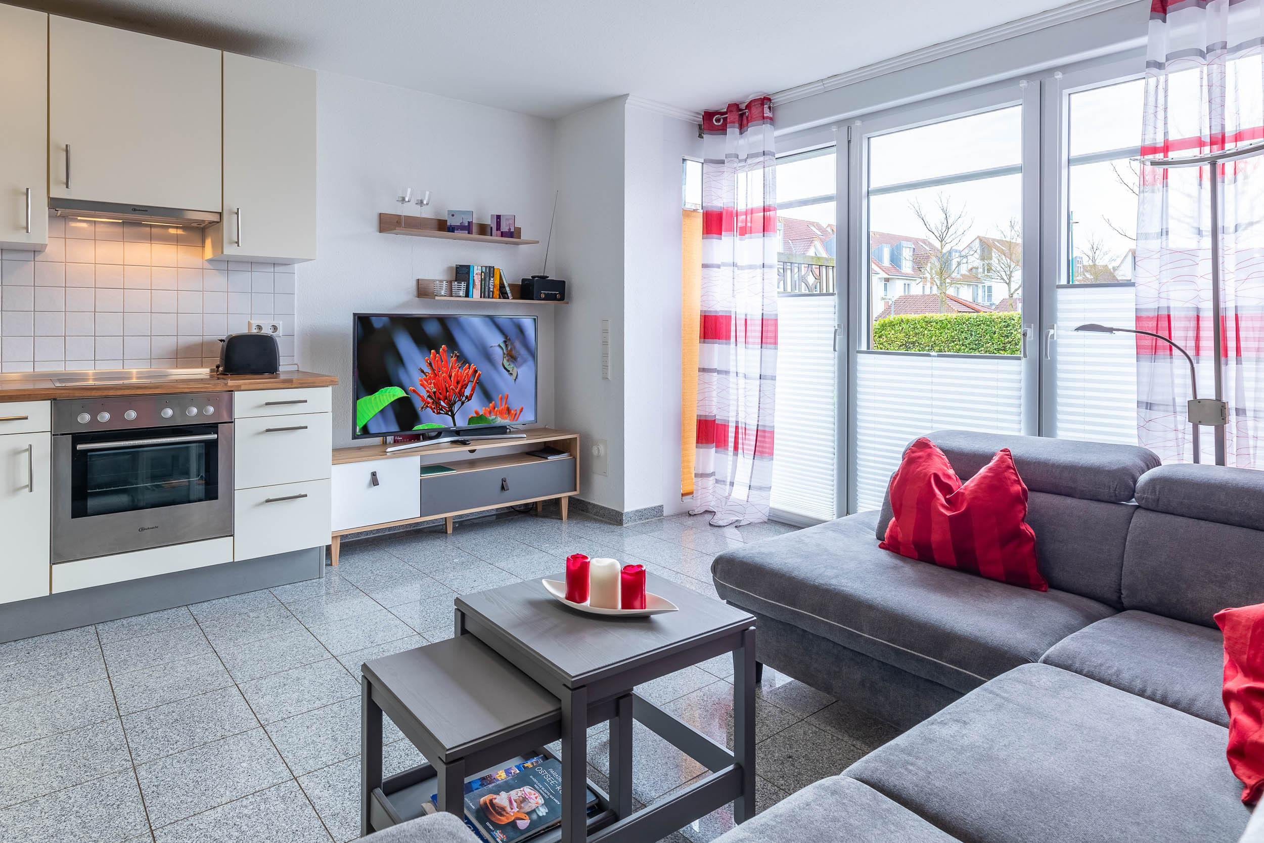 Im Wohnbereich ist eine komplett ausgestattete Wohnküche integriert. Die gemütliche Couch im Wohnzimmer lädt zum Relaxen ein. großer SAT-TV (55 Zoll Flatscreen), Stereoanlage, DVD-Player und ein kostenloser WLAN-Anschluss bieten die Grundlage, damit auch an einem Regentag in der Wohnung keine Langeweile aufkommt.