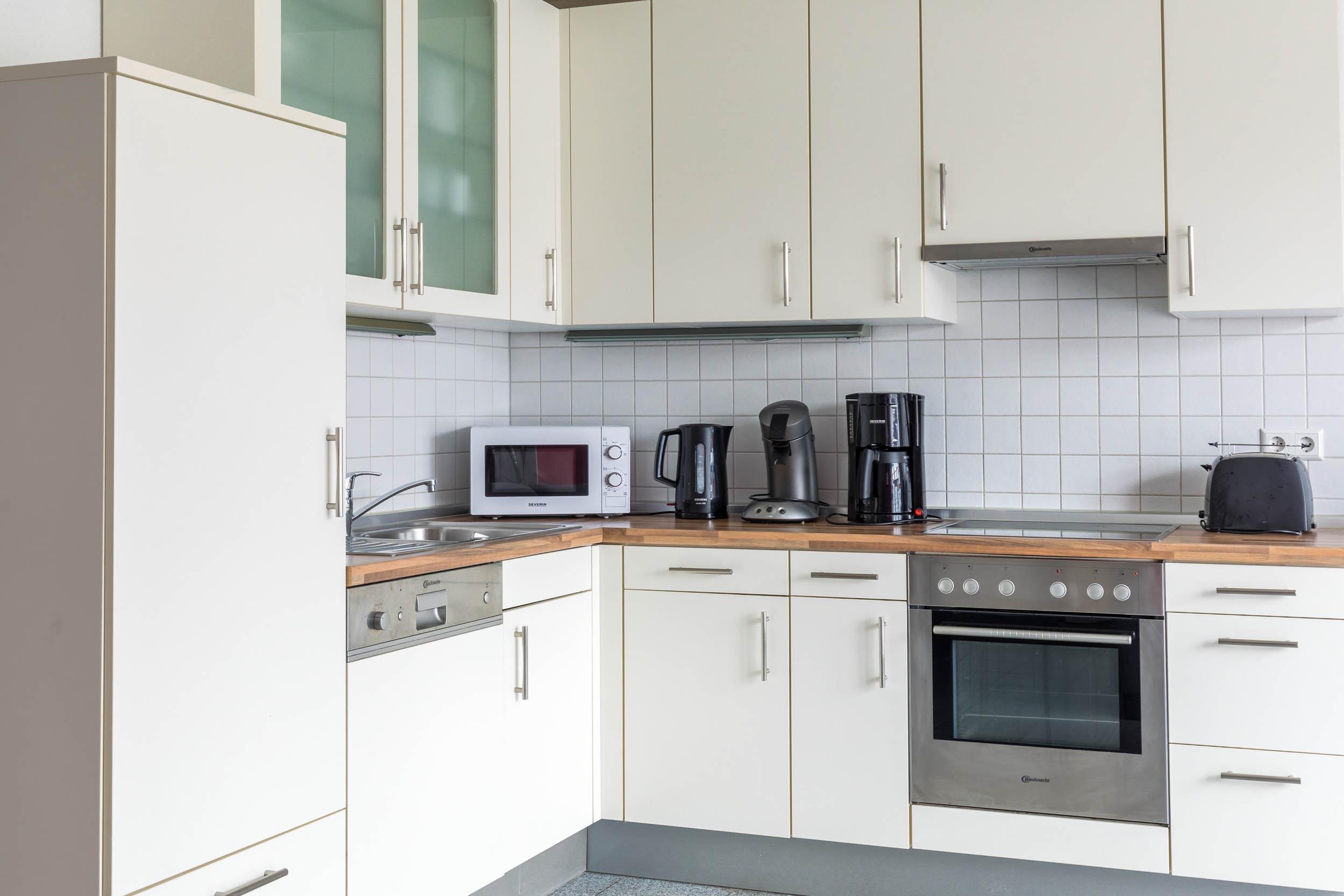 Ein Backofen mit Cerankochfeld, Geschirrspüler, Mikrowelle sowie ein Kühlschrank mit Gefrierfach erleichtern Ihnen das Kochen.