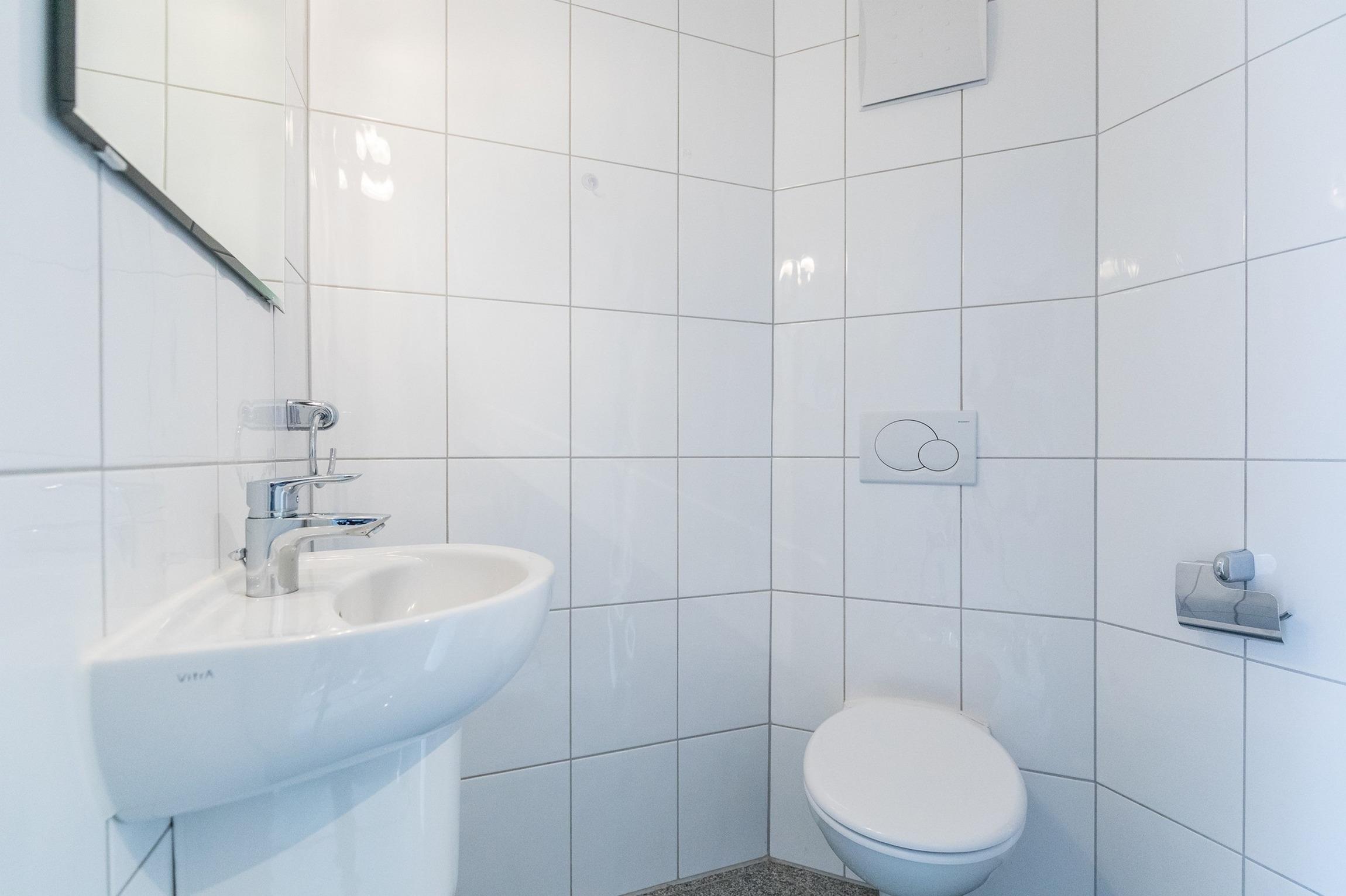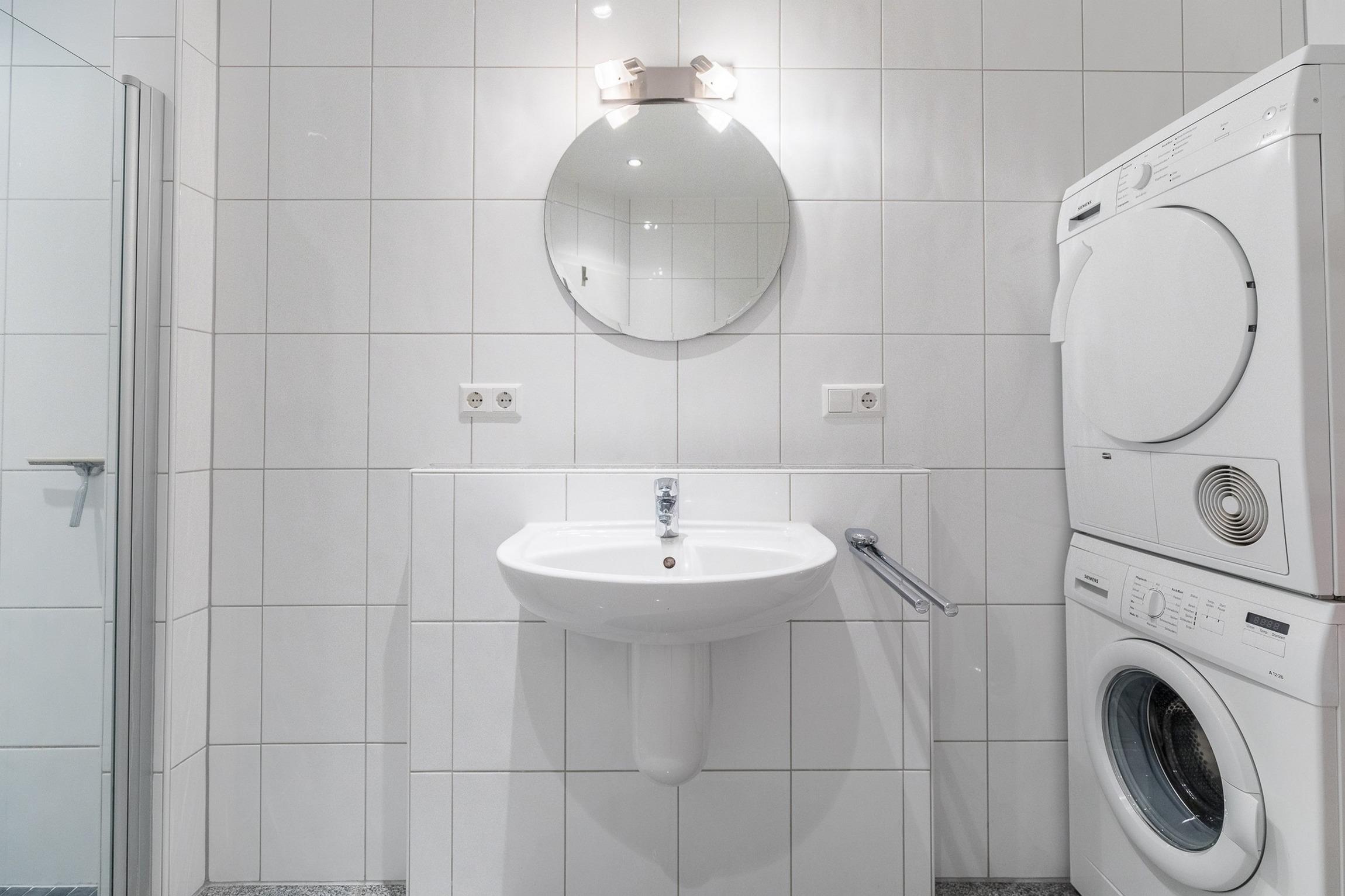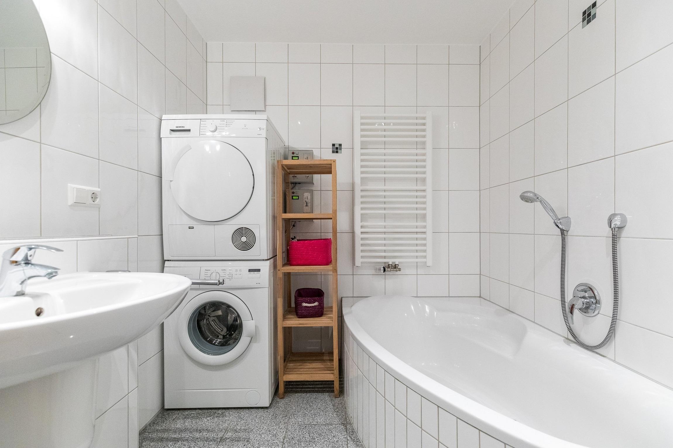 Das Bad ist mit zwei Waschbecken, Dusche und Badewanne eingerichtet. Hier finden Sie auch eine Waschmaschine und ein Trockner, die Sie gern gegen Gebühr nutzen können. Das WC ist separat.