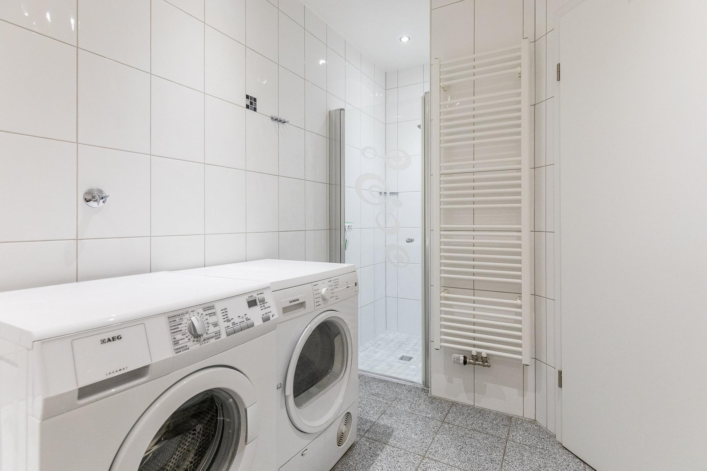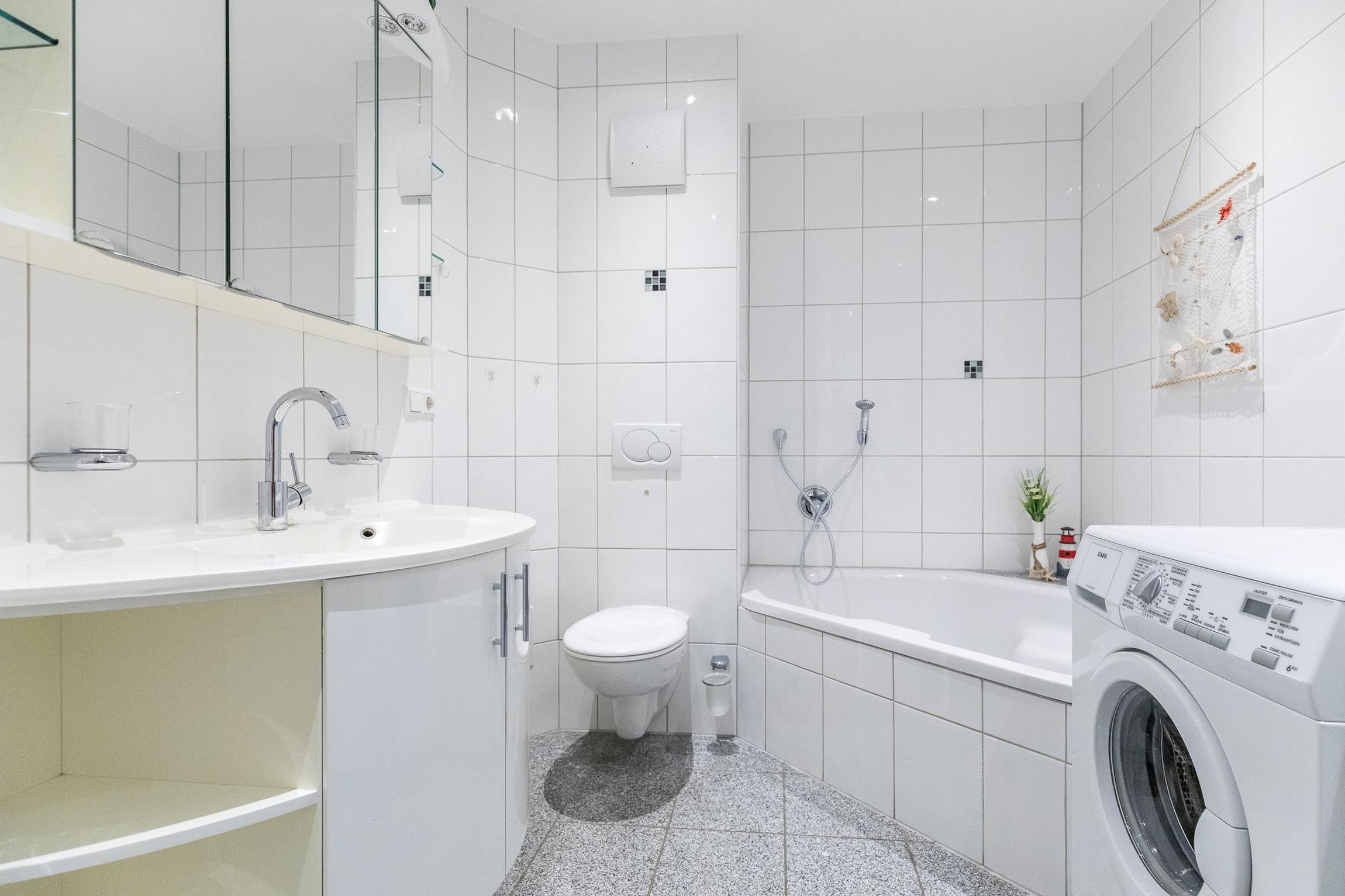 Das Bad ist sehr umfangreich eingerichtet. Sie finden hier neben der ebenerdigen Dusche und dem WC auch eine Eckbadewanne, einen großen Waschtisch, eine Waschmaschine und einen Trockner.