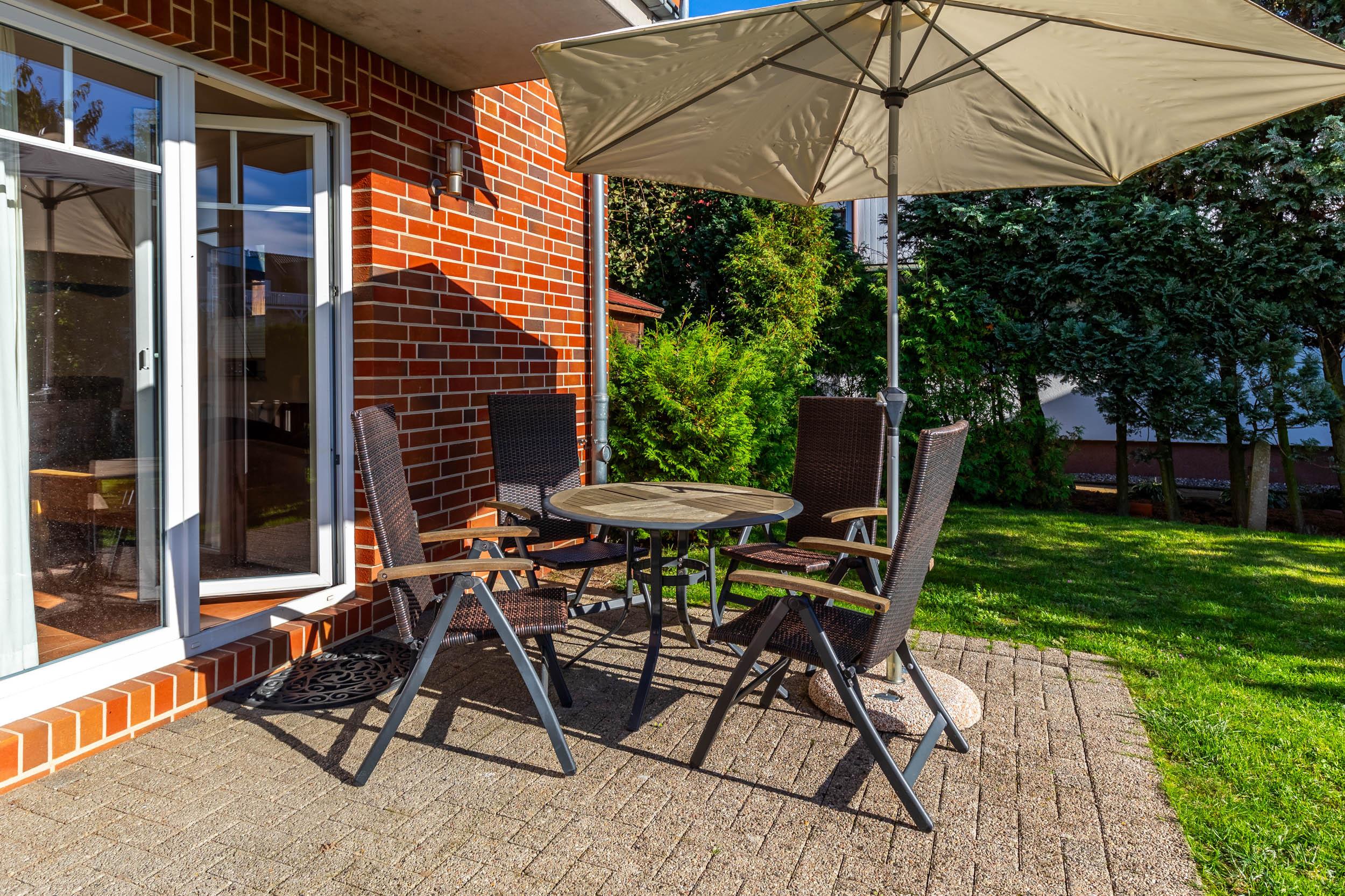 Die Wohnung verfügt weiterhin über eine möblierte Südterrasse sowie über ein eigenes Gartengrundstück, Sonnenschirm und Sonnenliegen.