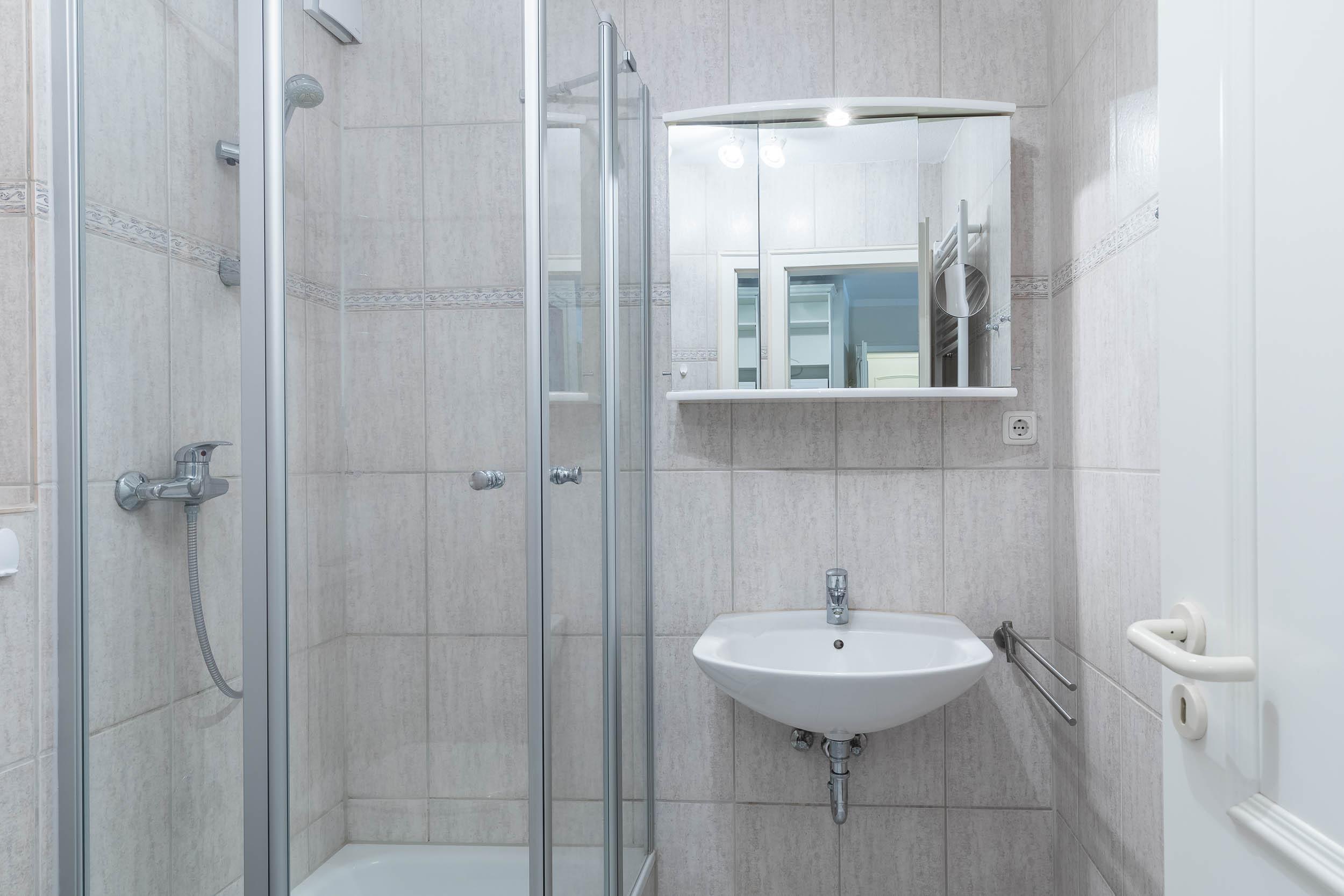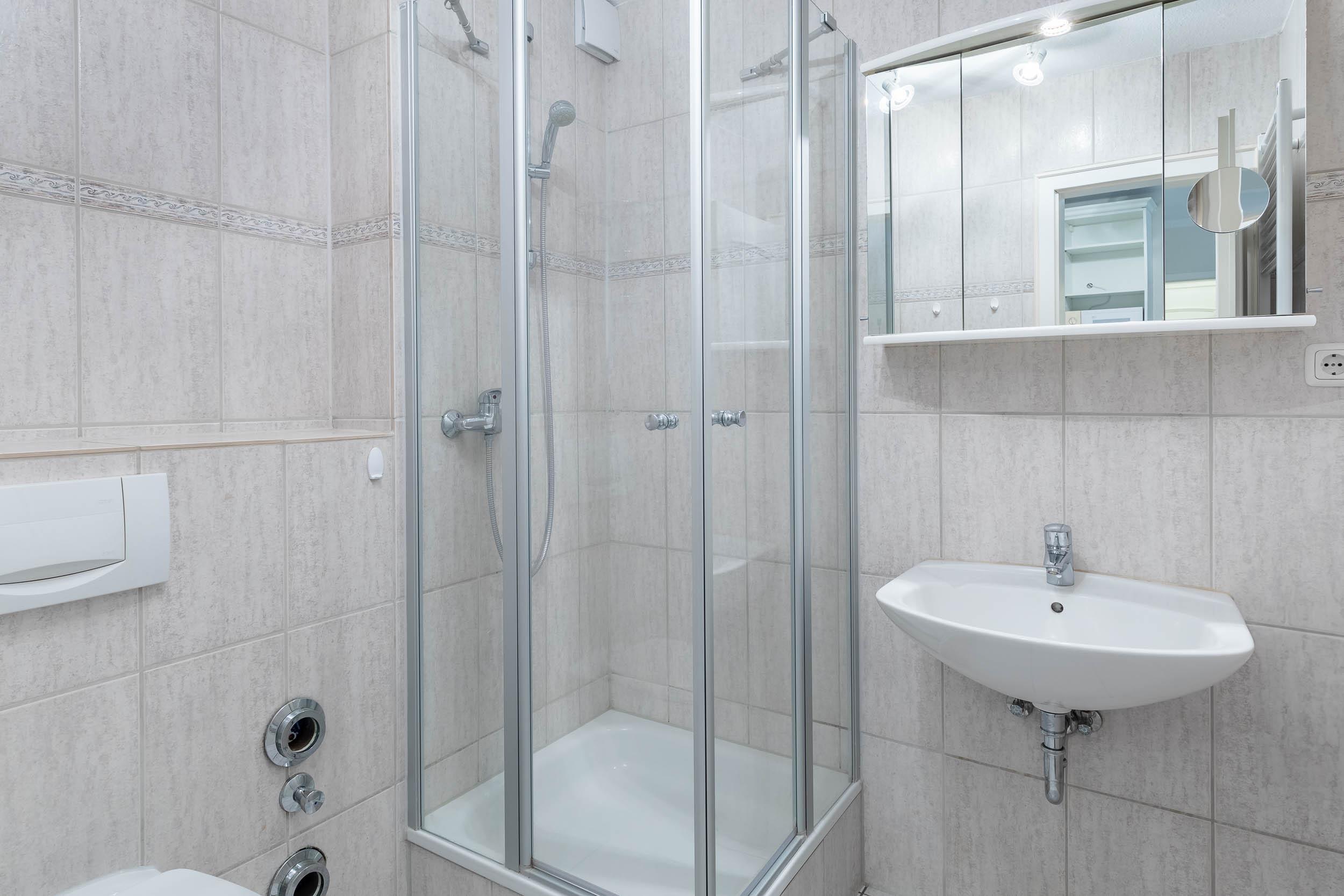 Das Duschbad ist mit Dusche und WC sowie Waschbecken konzipiert.