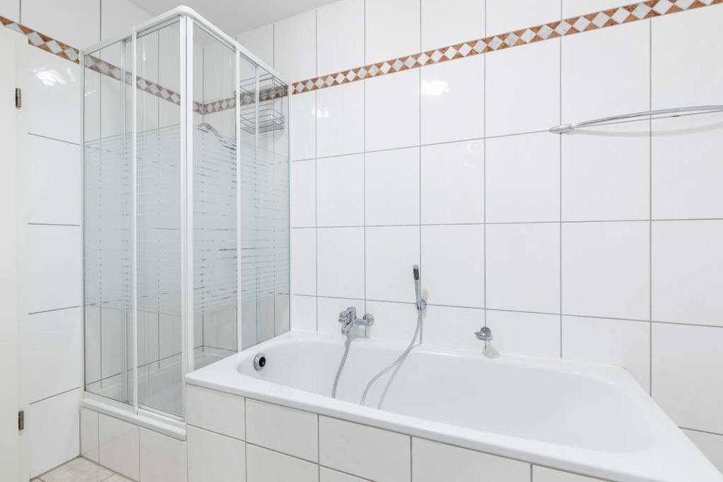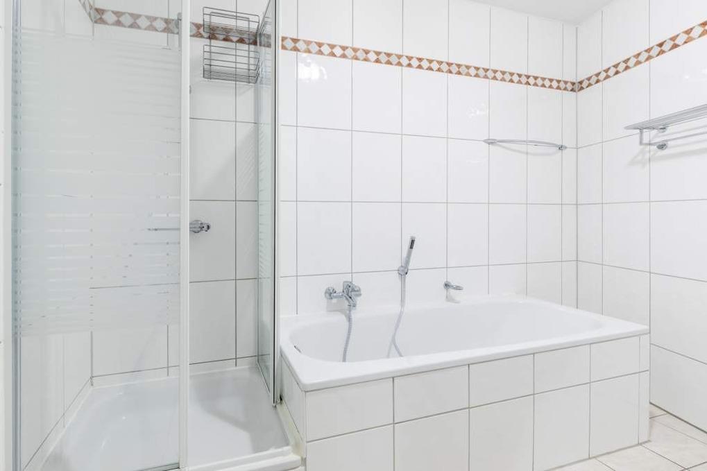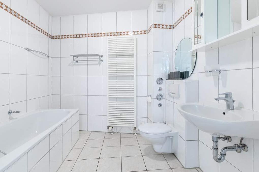 Das Badezimmer bietet eine Badewanne, separater Dusche und WC. Ein großer Handtuchhalter mit integrierter Heizung trocknet schnell Ihre Frotteeware und hält sie bei Bedarf schön warm.