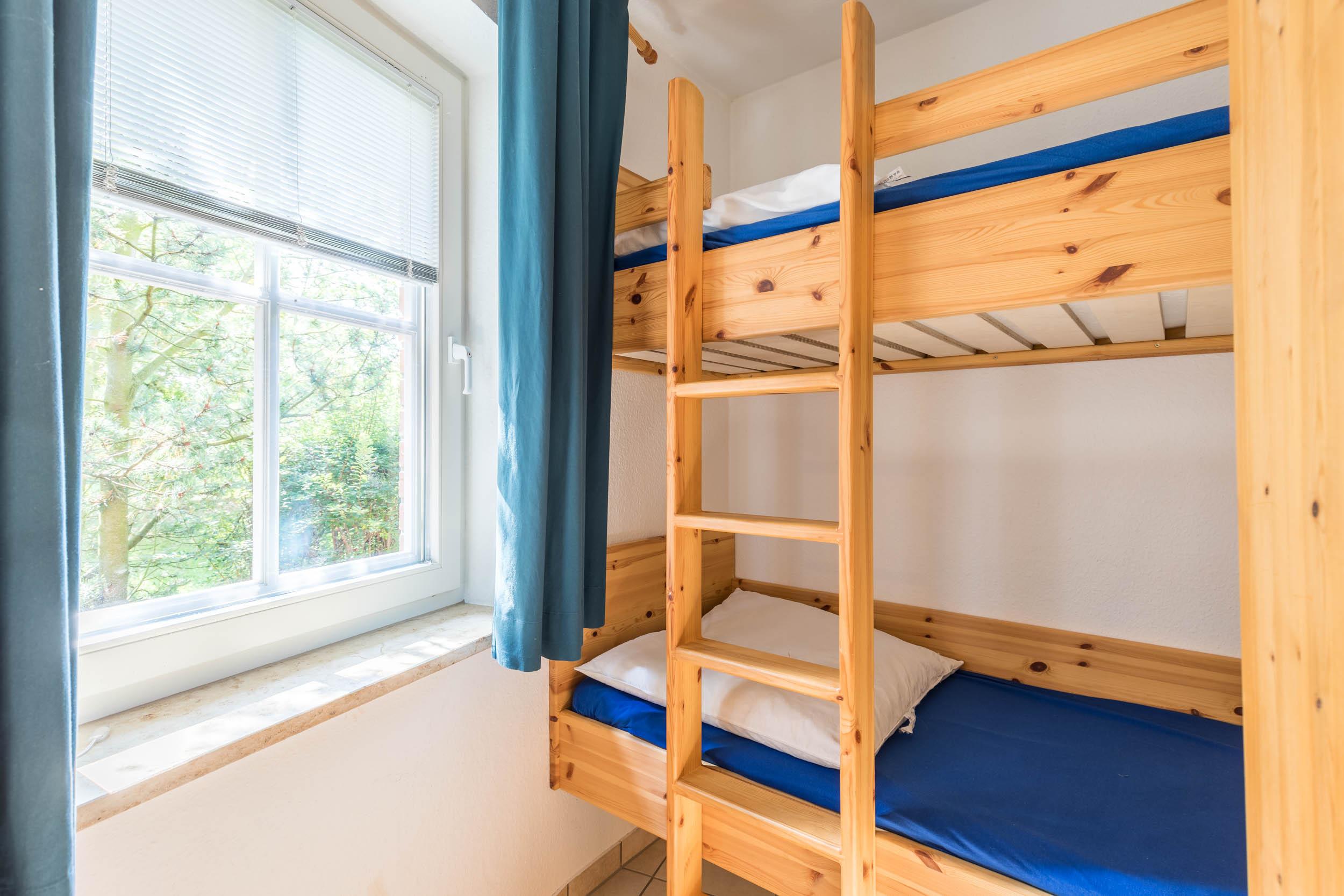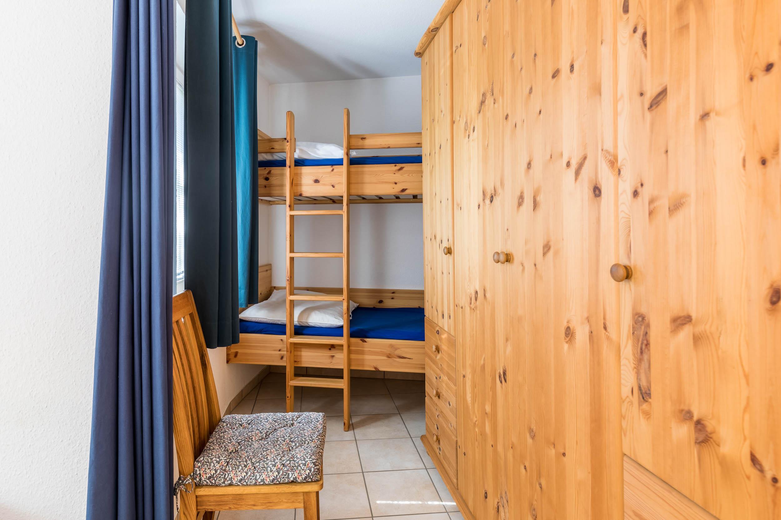 Im Schlafzimmer stehen sowohl ein Doppelbett mit TV als auch ein Etagenbett (aufgrund der Maße nur für Kinder geeignet) zur Verfügung. Ebenso bietet der Kleiderschrank reichlich Ablagemöglichkeiten.