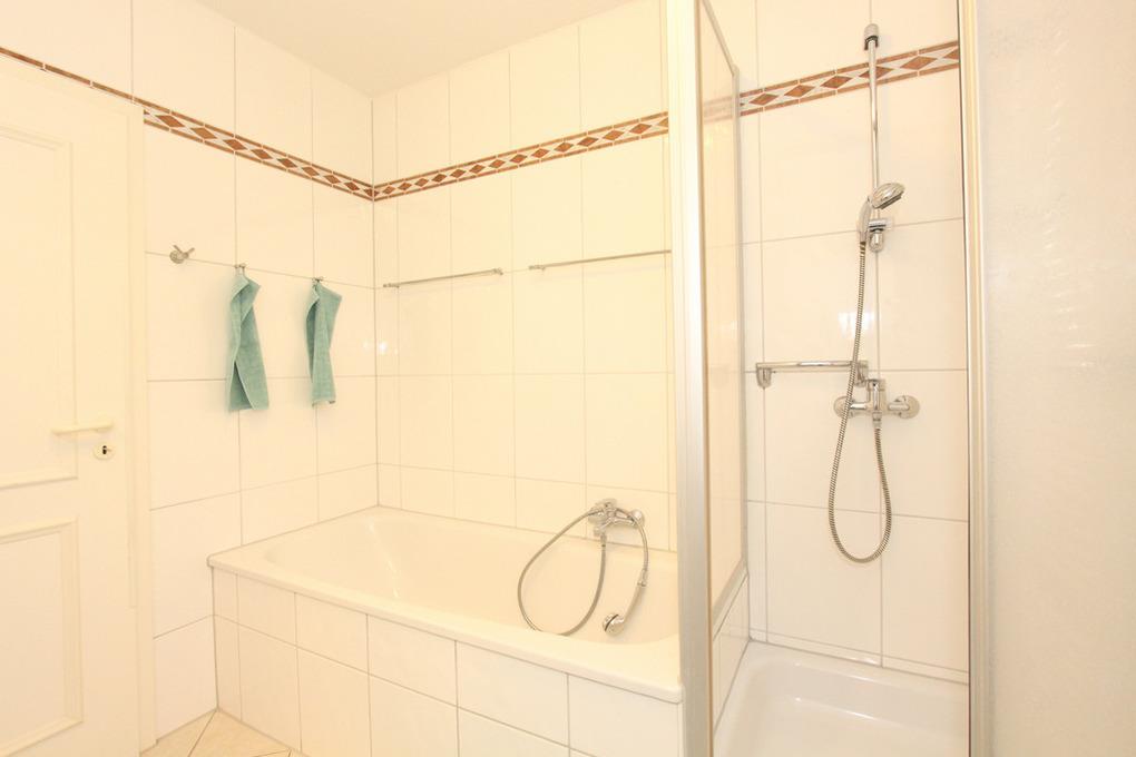 Das hell geflieste Bad besteht aus einer Dusche, Badewanne und einem WC.