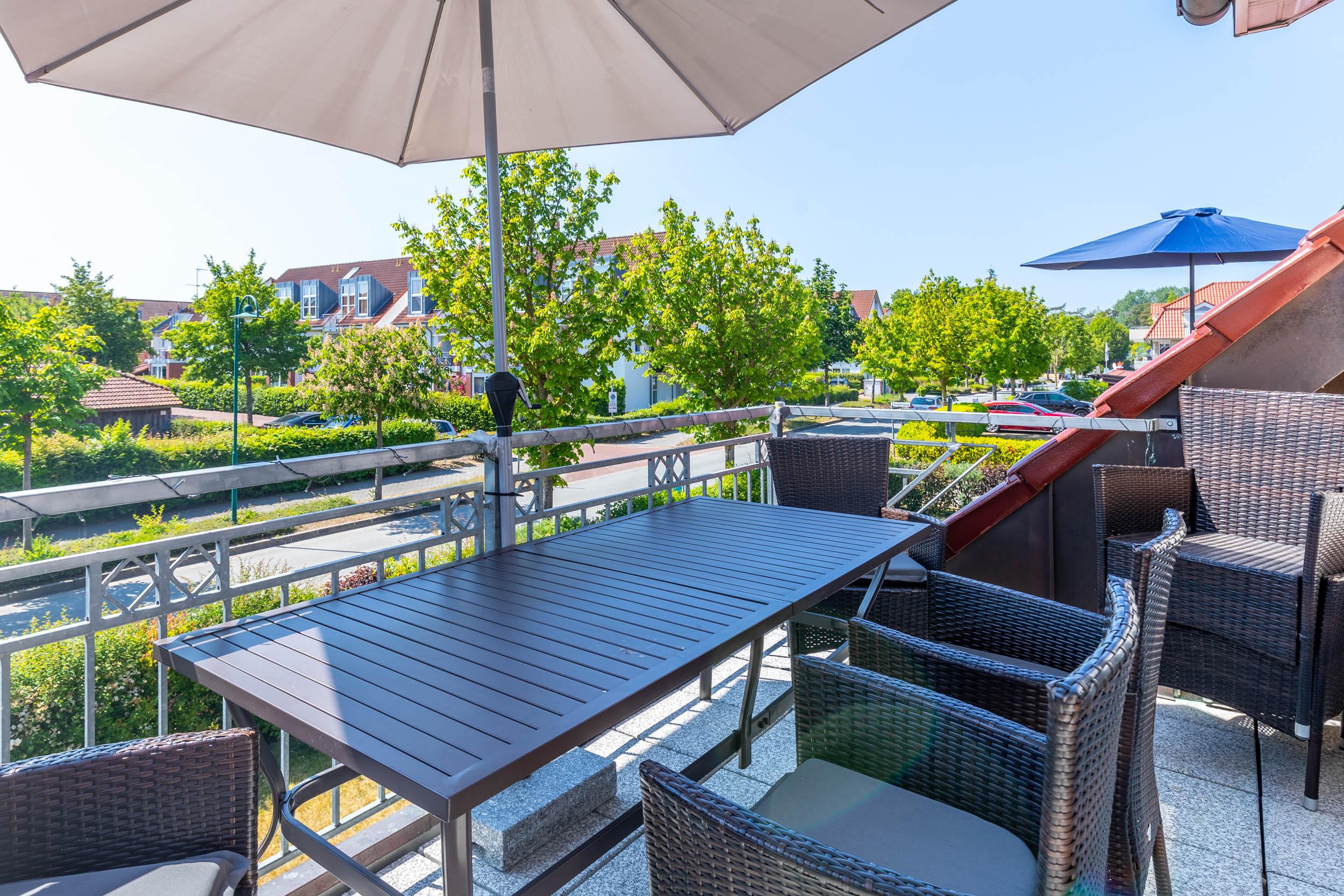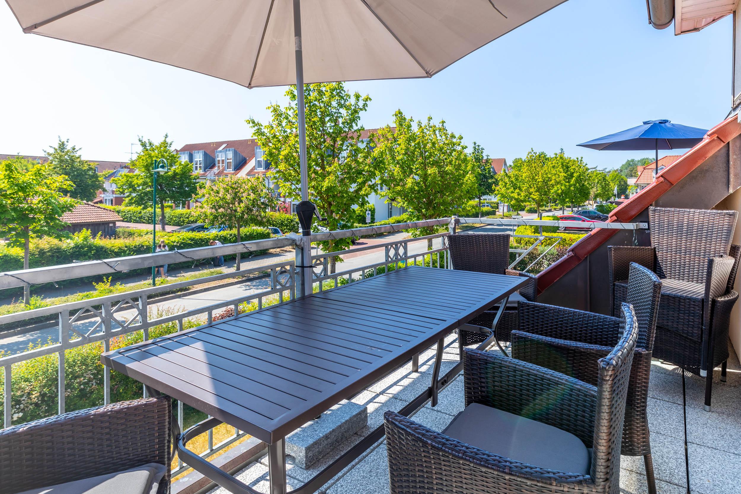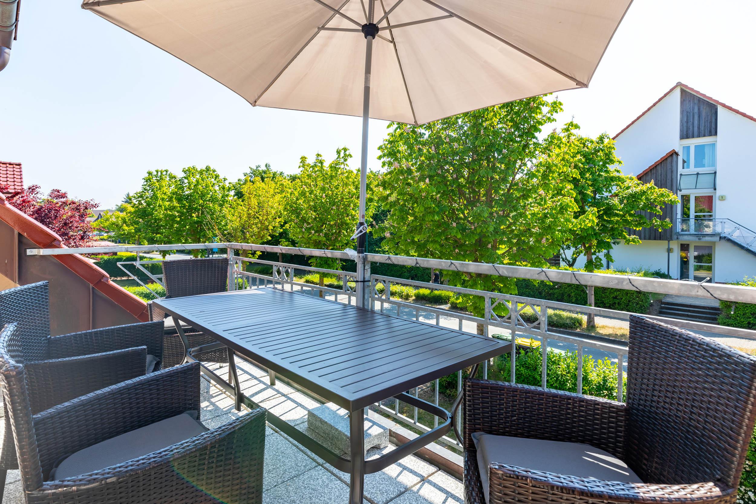 Auf dem möblierten Südwest-Balkon, welchen Sie vom Wohnzimmer aus erreichen, können Sie die Sonne bestens genießen.
