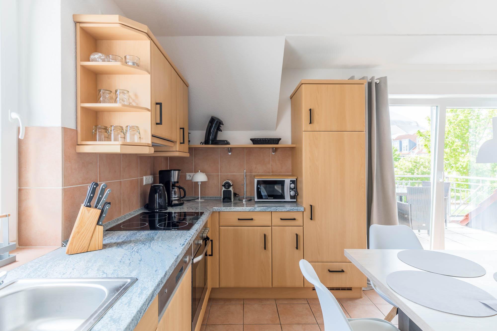 Die mit Spülmaschine, Herd und vielen weiteren Geräten ausgestattete Wohnküche bietet alles, um Mahlzeiten selbst zuzubereiten. Diese können Sie dann bequem an der separaten Essecke einnehmen.