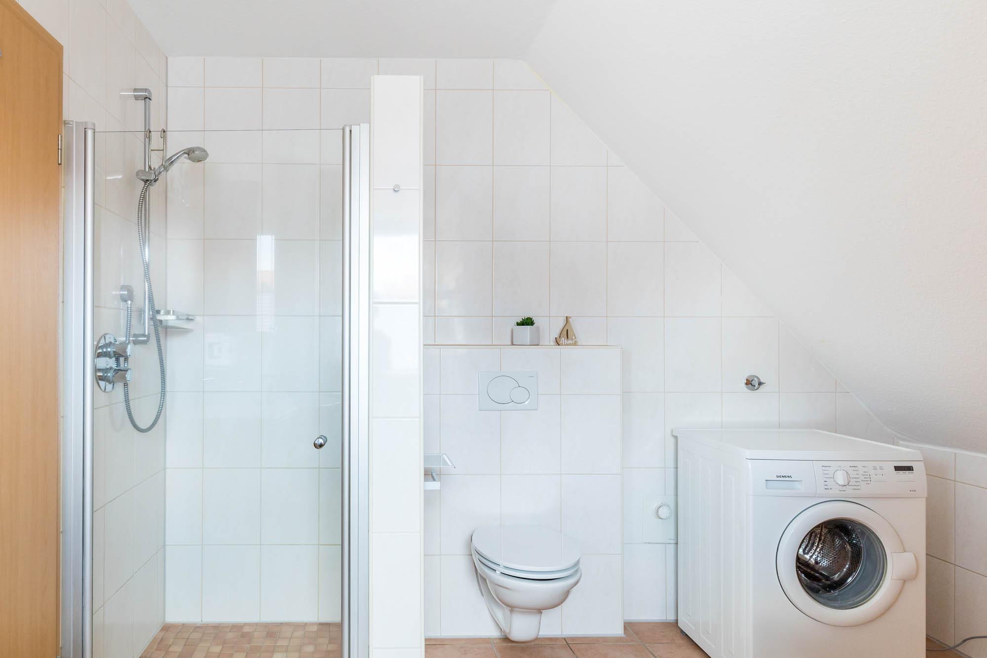 Das Bad mit Tageslicht bietet eine ebenerdige Dusche, WC, Münz-Waschmaschine und eine Sauna, die Sie gegen Gebühr jederzeit nutzen können.