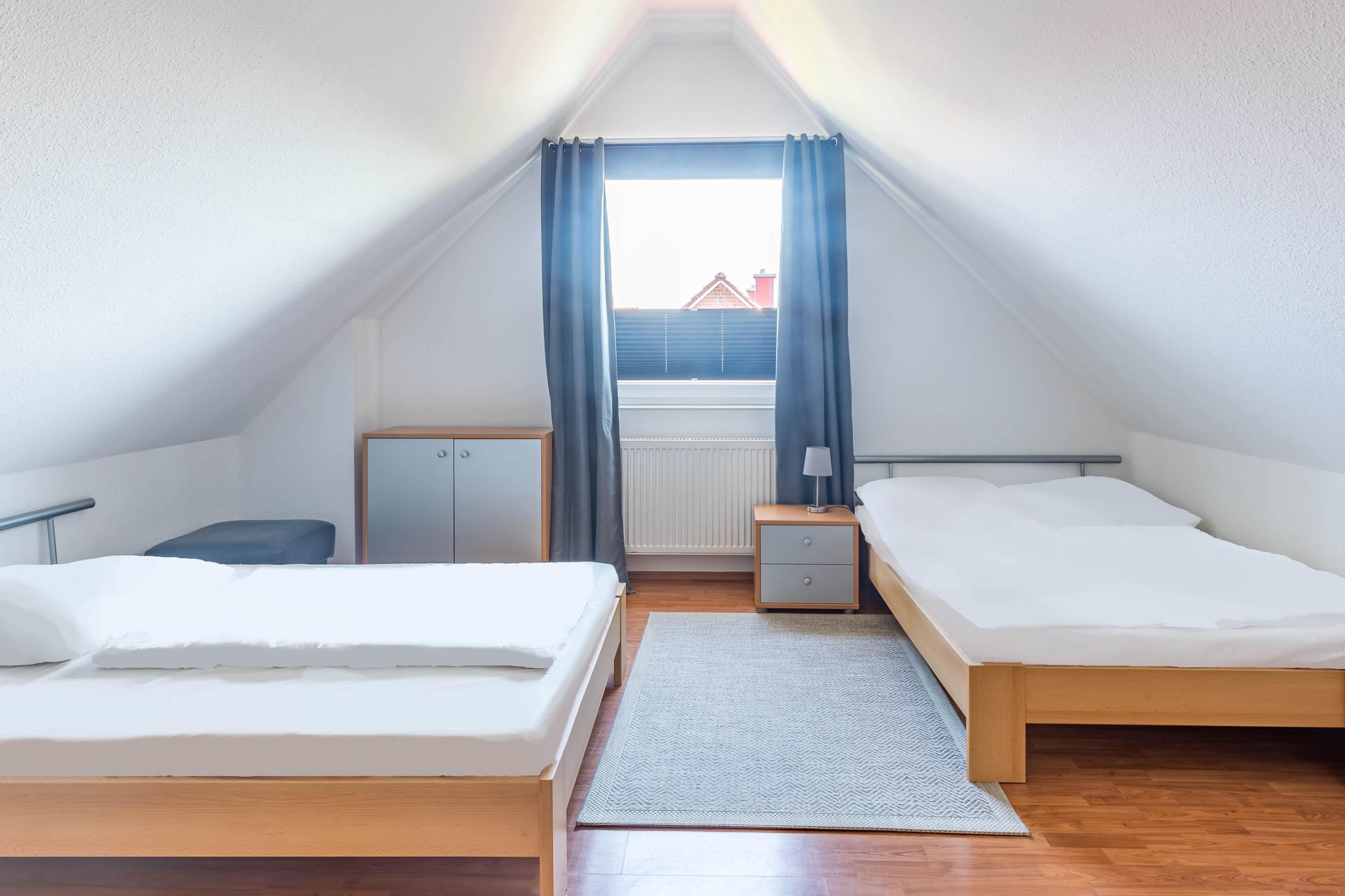 Die zweite Wohnebene, das Dachgeschoss bietet ein großzügiges Gäste-/ Kinderzimmer. Hier sind 2 französische Doppelbetten und zwei Kommoden eingerichtet. Des Weiteren gibt es hier einen weiteren Fernseher. Wer mit einem Kleinkind anreist, kann hier noch bequem ein Reisebettchen aufstellen.