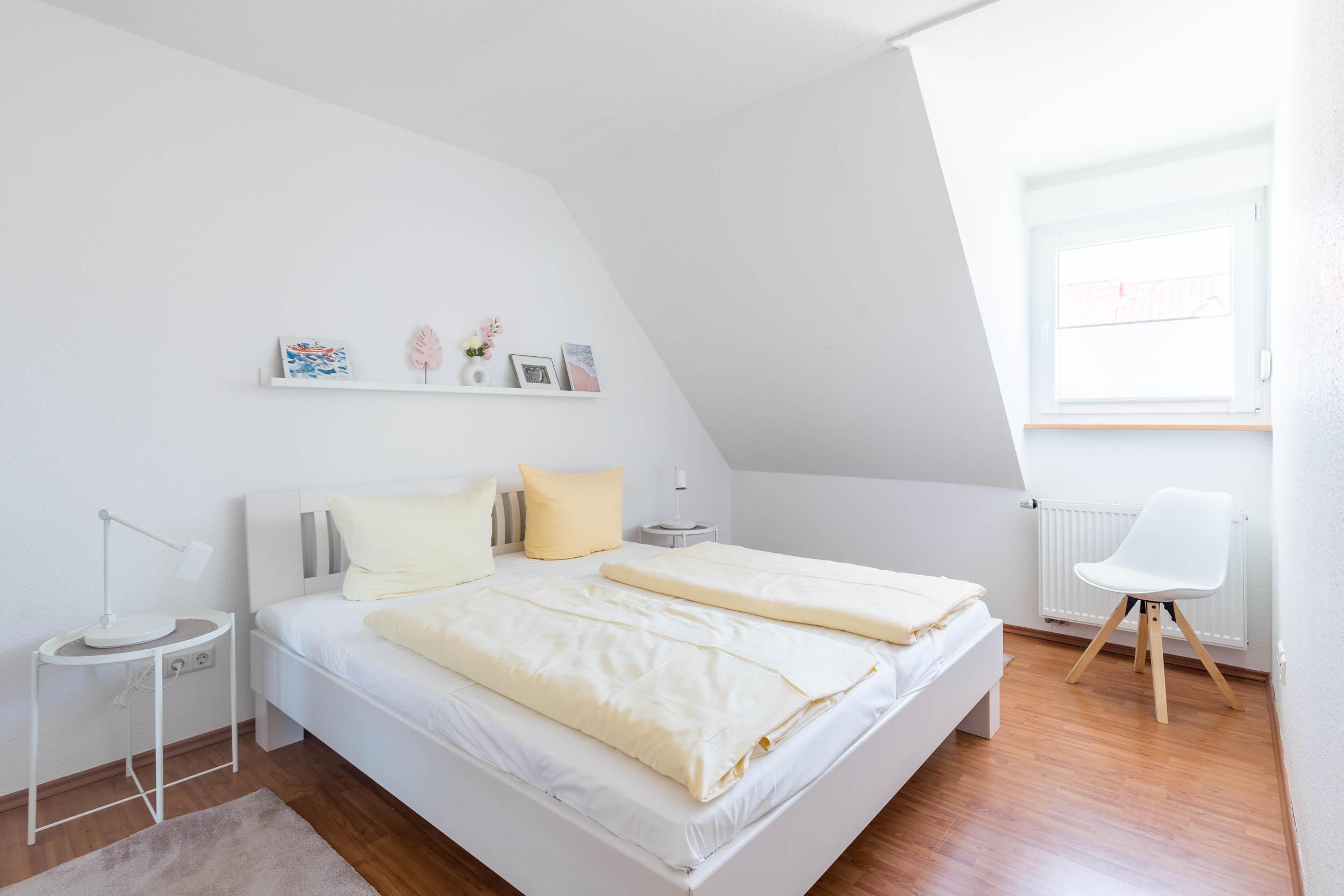 Ebenso befindet sich auf der 1. Etage das Schlafzimmer mit einem Doppelbett und Kleiderschrank für Ihre Garderobe.