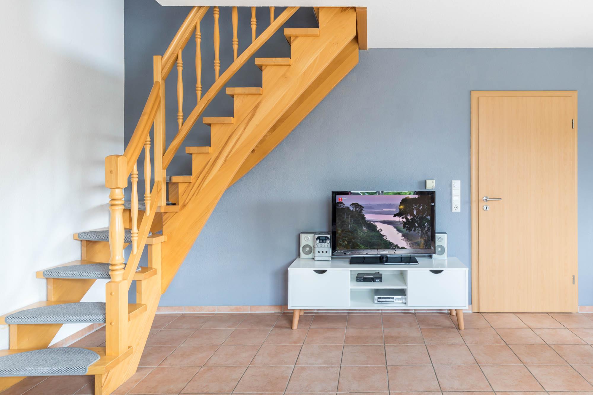 Die familienfreundliche 3-Zimmer-Wohnung liegt im 1.Obergeschoss des Hauses und verläuft über zwei Ebenen. Sie bietet auf ca. 85qm Wohnfläche eine Ausstattung für 6 Personen + Kleinkind.
