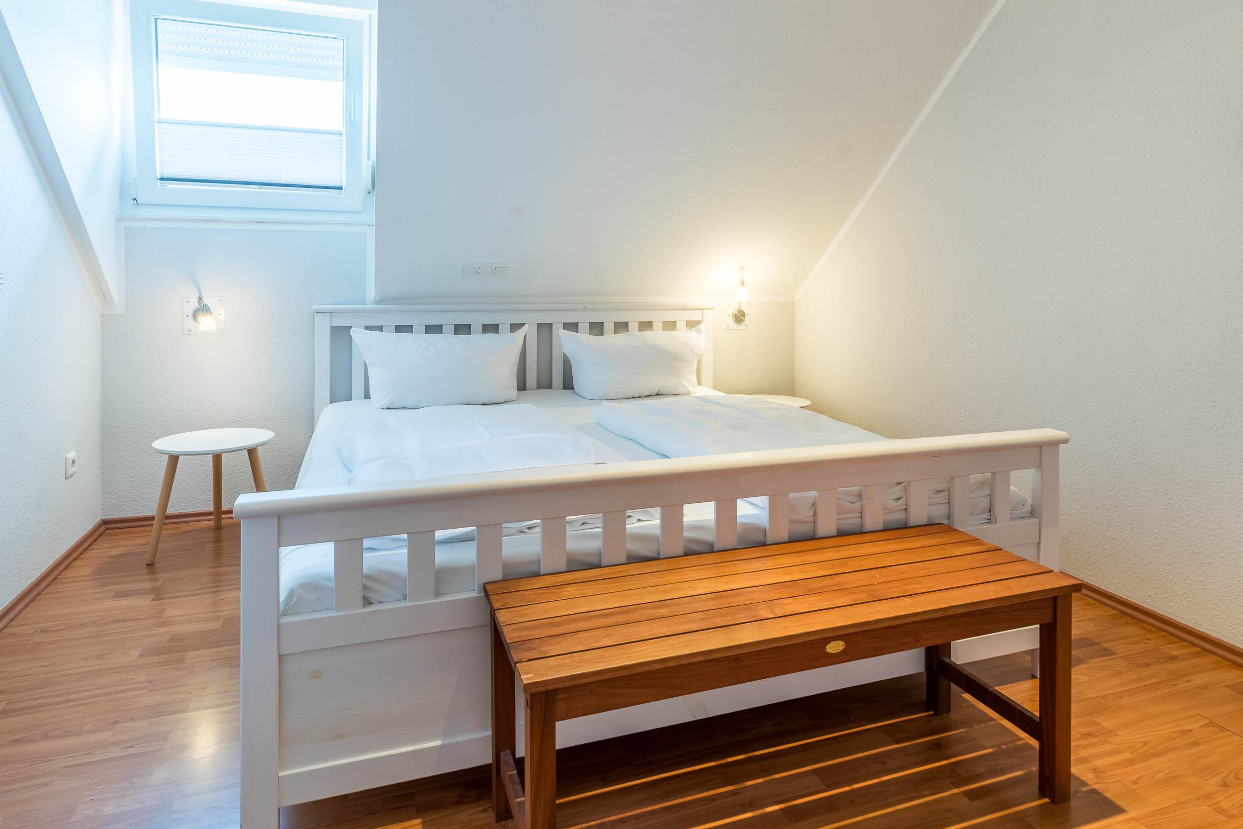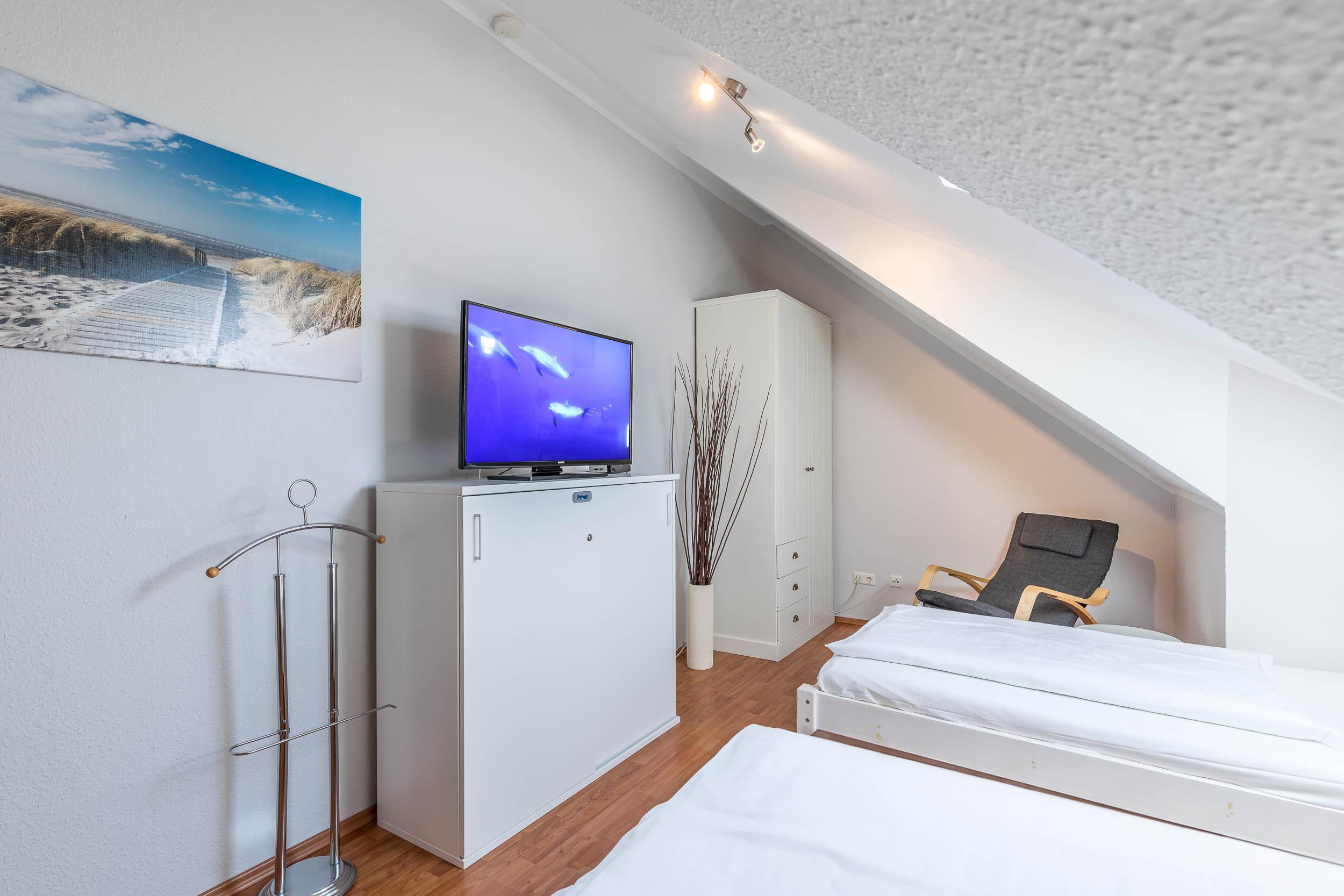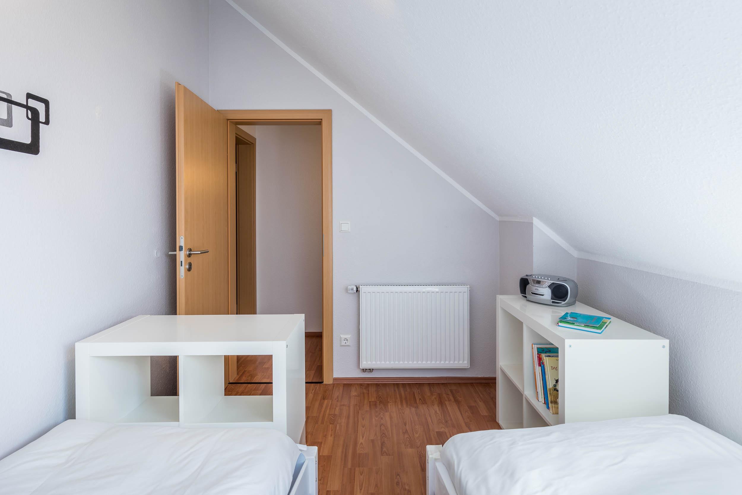 Die Ferienunterkunft verfügt über 3 Schlafzimmer. Während sich das Schlafzimmer mit einem Doppelbett und einem Kleiderschrank für Ihre Garderobe ebenfalls auf der ersten Ebene befindet, erwarten Sie im Dachgeschoss, der 2. Wohnebene die beiden Gäste-/ Kinderzimmer. Hier sind jeweils 2 Einzelbetten eingerichtet. In einem der beiden Zimmer ist zusätzlich ein kleiner Kleiderschrank, eine Kommode und ein weiterer Fernseher vorhanden.