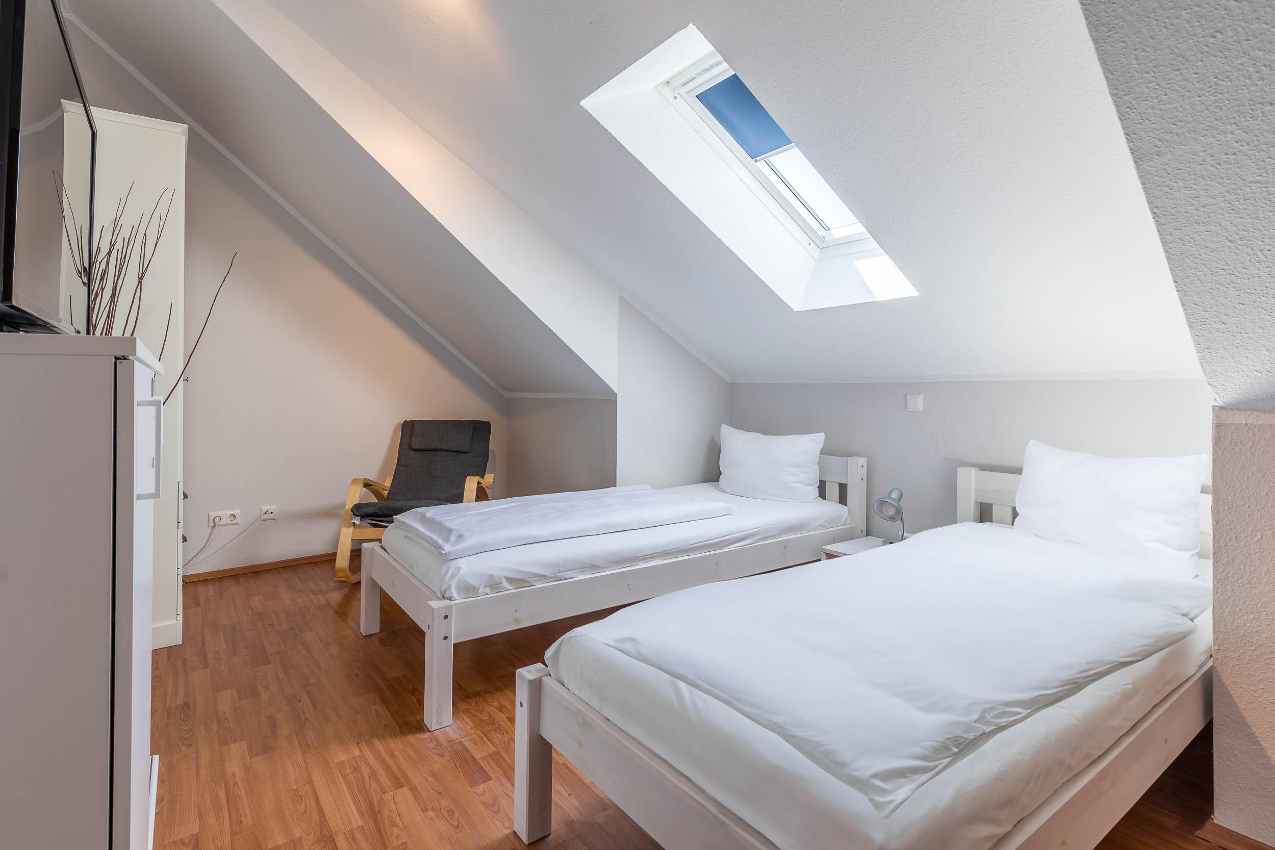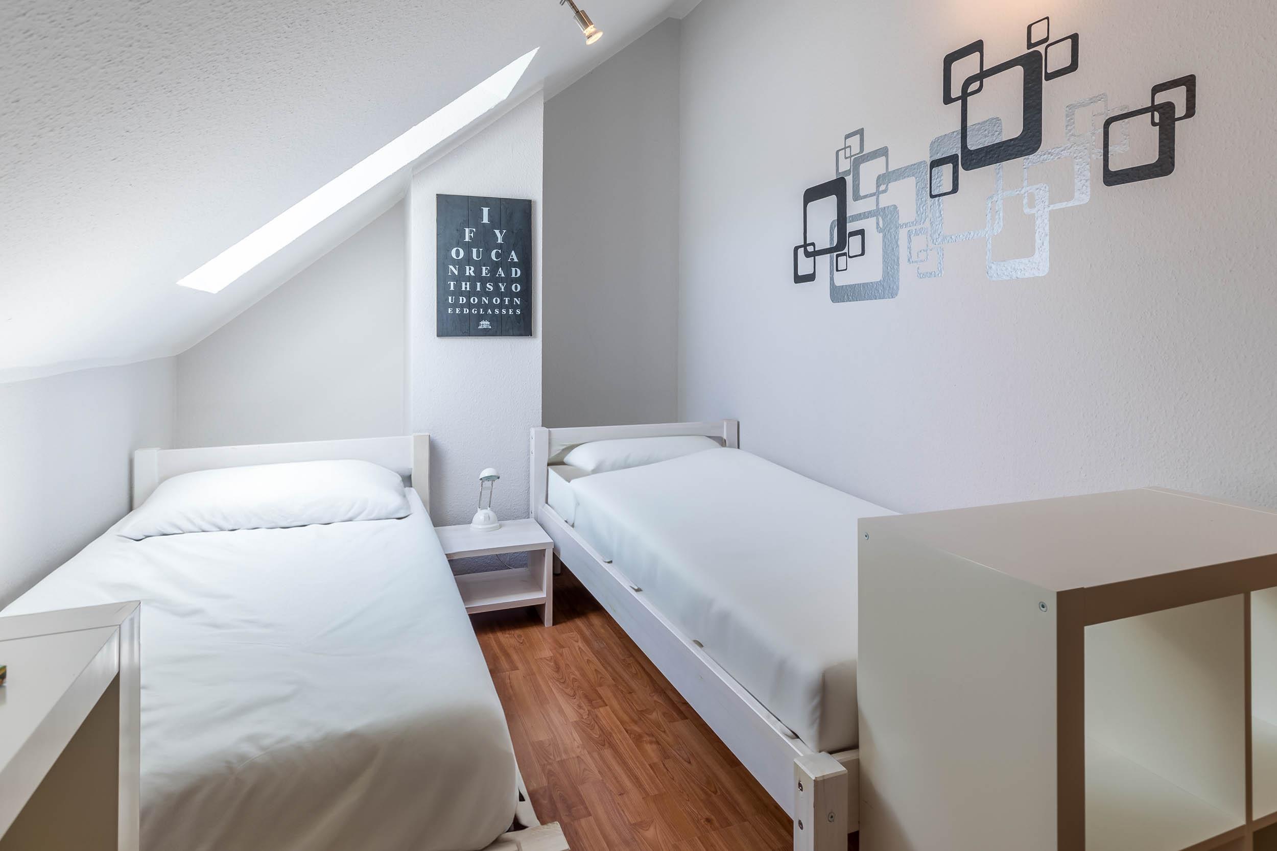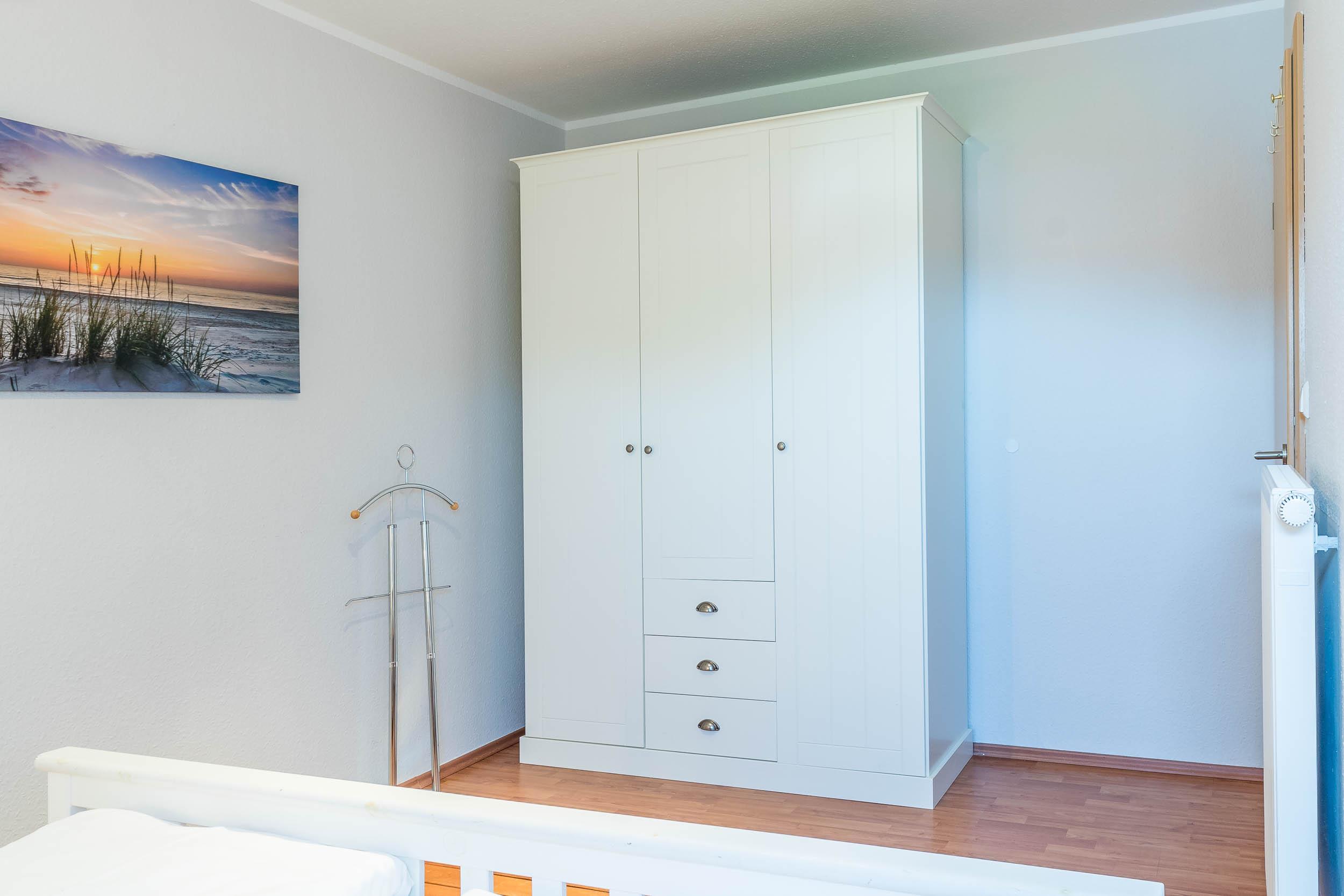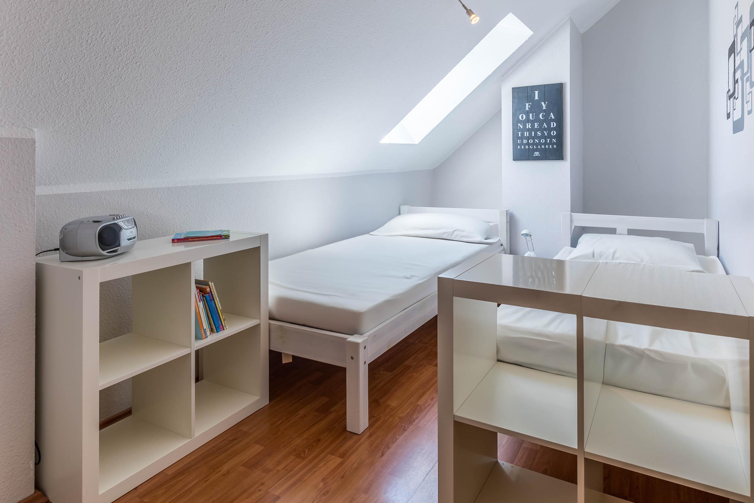 Die Ferienunterkunft verfügt über 3 Schlafzimmer. Während sich das Schlafzimmer mit einem Doppelbett und einem Kleiderschrank für Ihre Garderobe ebenfalls auf der ersten Ebene befindet, erwarten Sie im Dachgeschoss, der 2. Wohnebene die beiden Gäste-/ Kinderzimmer. Hier sind jeweils 2 Einzelbetten eingerichtet. In einem der beiden Zimmer ist zusätzlich ein kleiner Kleiderschrank, eine Kommode und ein weiterer Fernseher vorhanden.