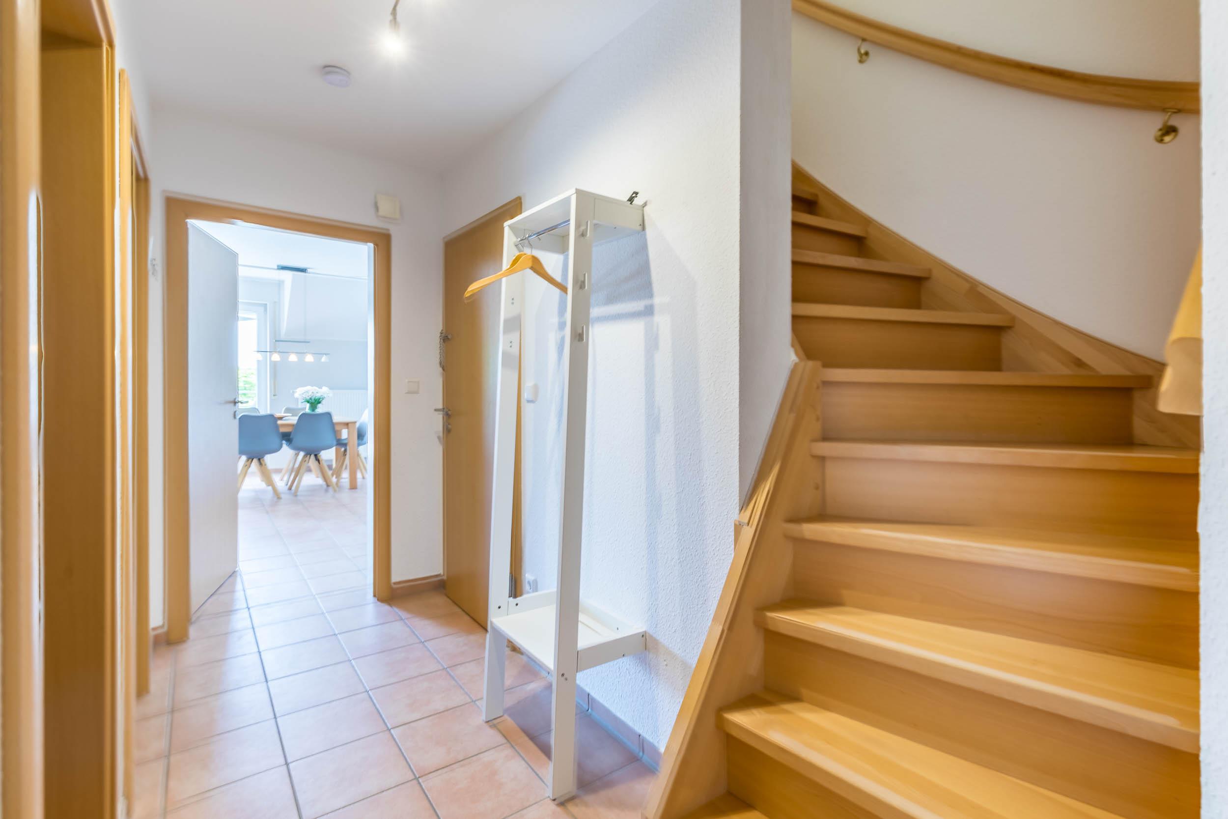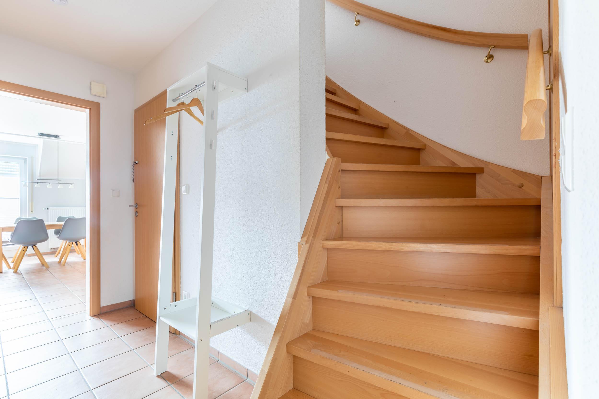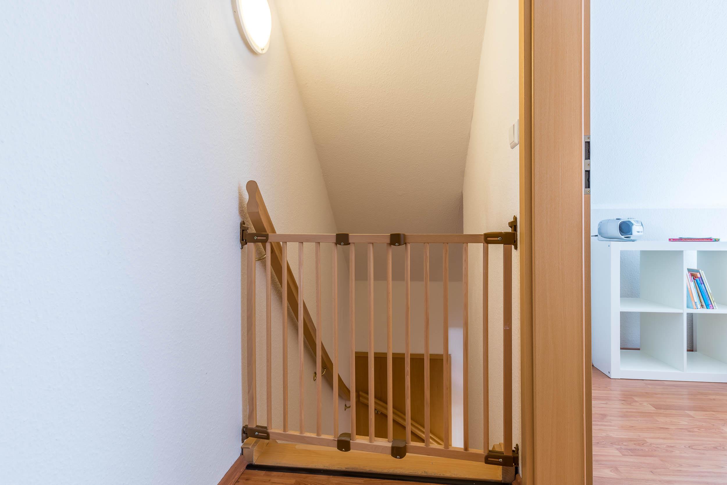 Vom Wohnungsflur aus führt eine Treppe ins Dachgeschoss. Am oberen Ende ist zur Sicherheit für unsere kleinen Gäste ein Treppenschutzgitter angebracht.