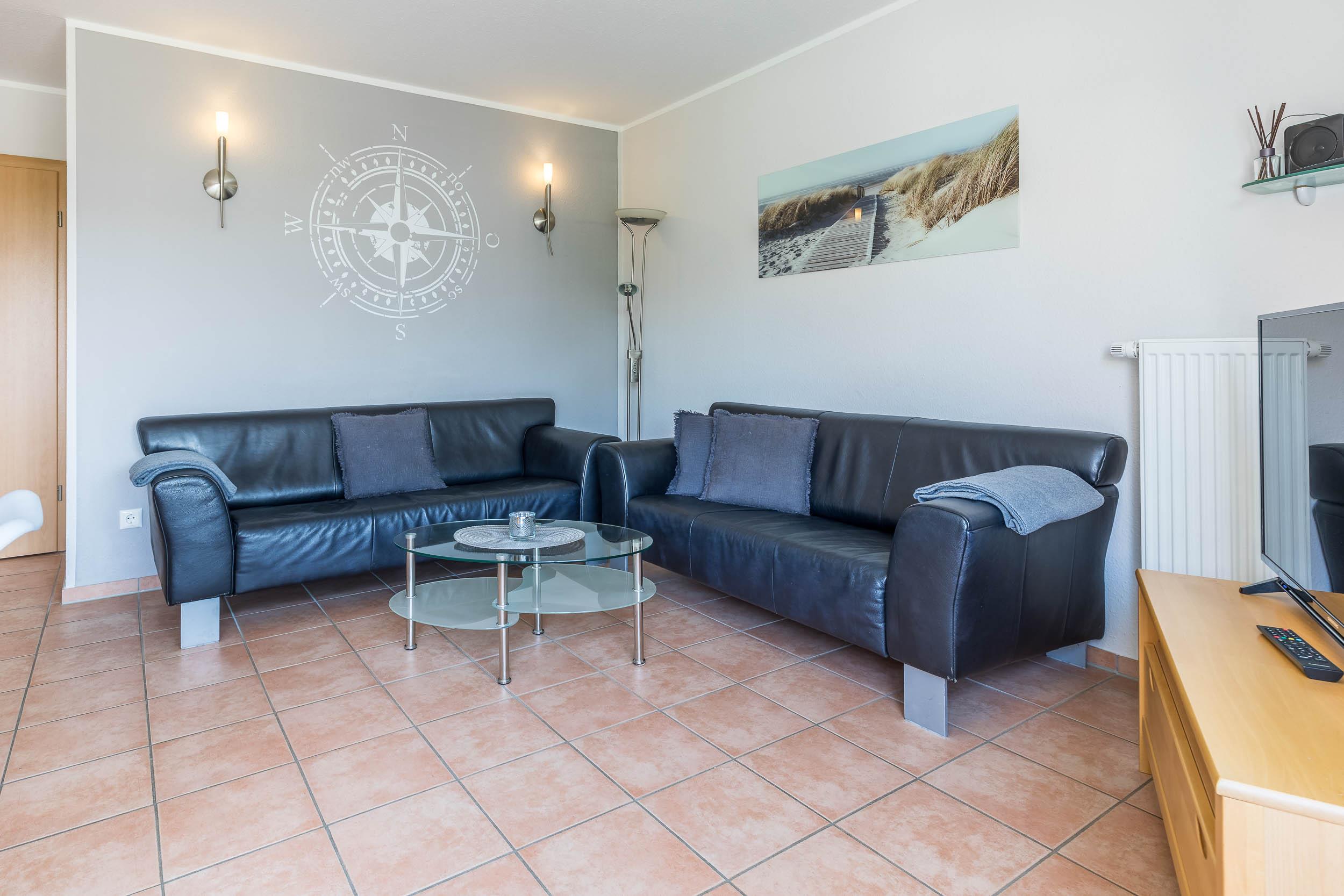 Auf der ersten Wohnebene dieser Ferienwohnung befindet sich der gemütliche Wohnbereich mit offener Küche. Flatscreen-TV, DVD-Player sowie CD-Player sorgen hier für Unterhaltung, die beiden großen Sofas für Gemütlichkeit. Von hier aus gelangen Sie auch auf den möblierten Balkon.