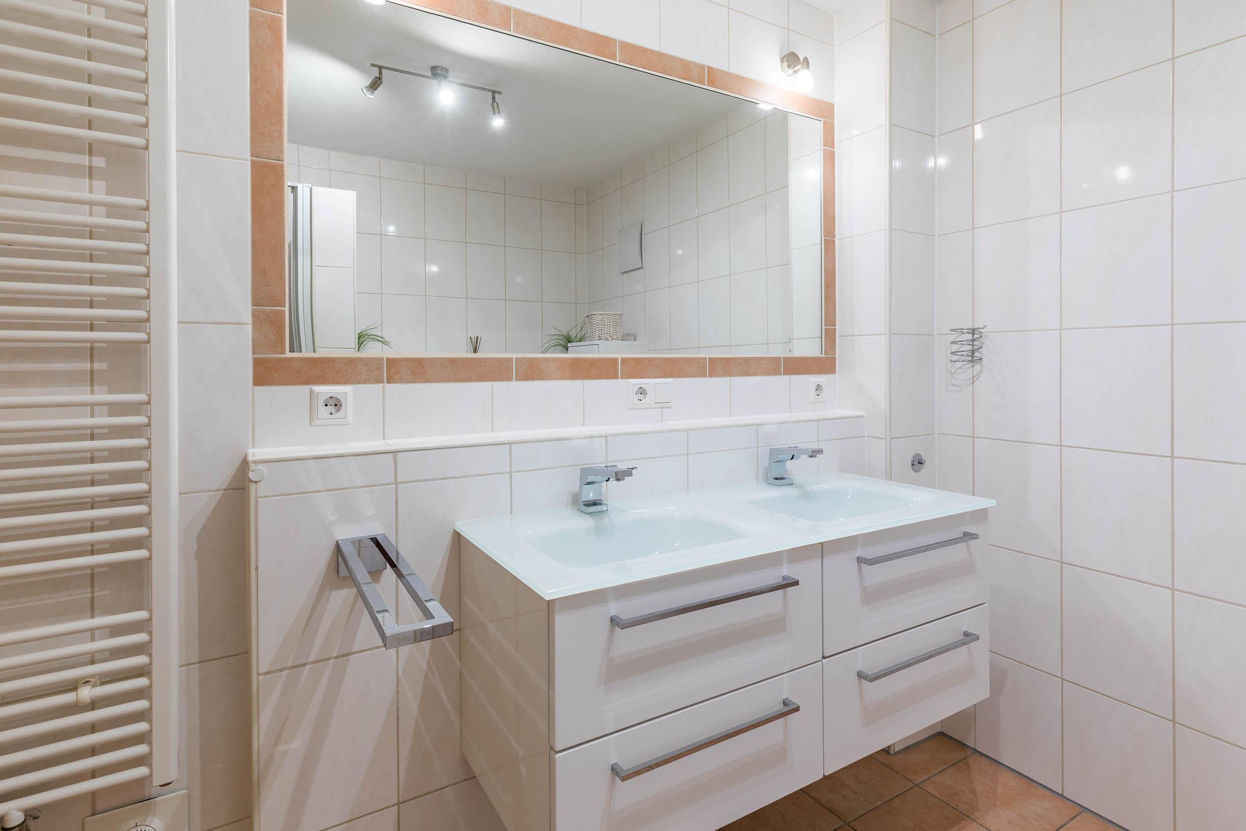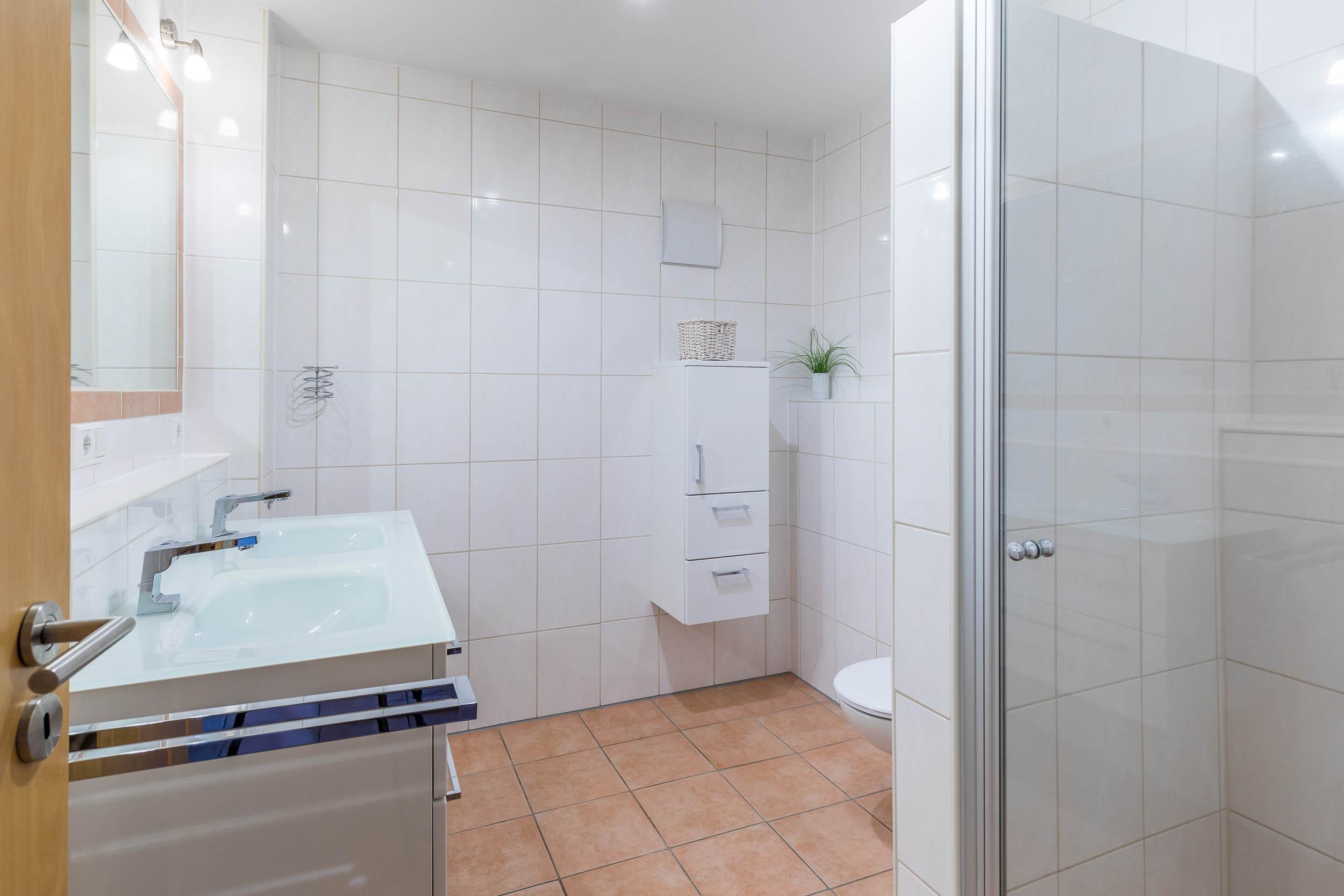 Auch das Bad mit ebenerdiger Dusche, WC und 2 Waschbecken befindet sich auf dieser Wohnebene.