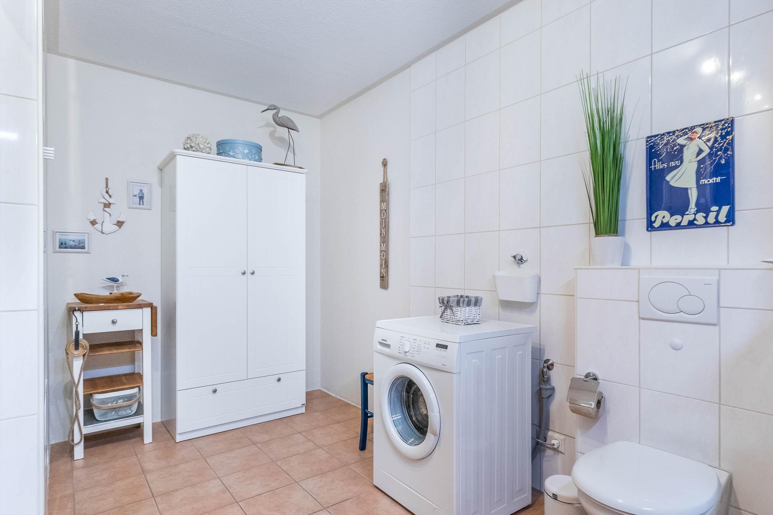 Das große modern geflieste Bad bietet eine ebenerdige Dusche und WC. Auch die vorhandene Waschmaschine kann bei Bedarf kostenfrei benutzt werden.