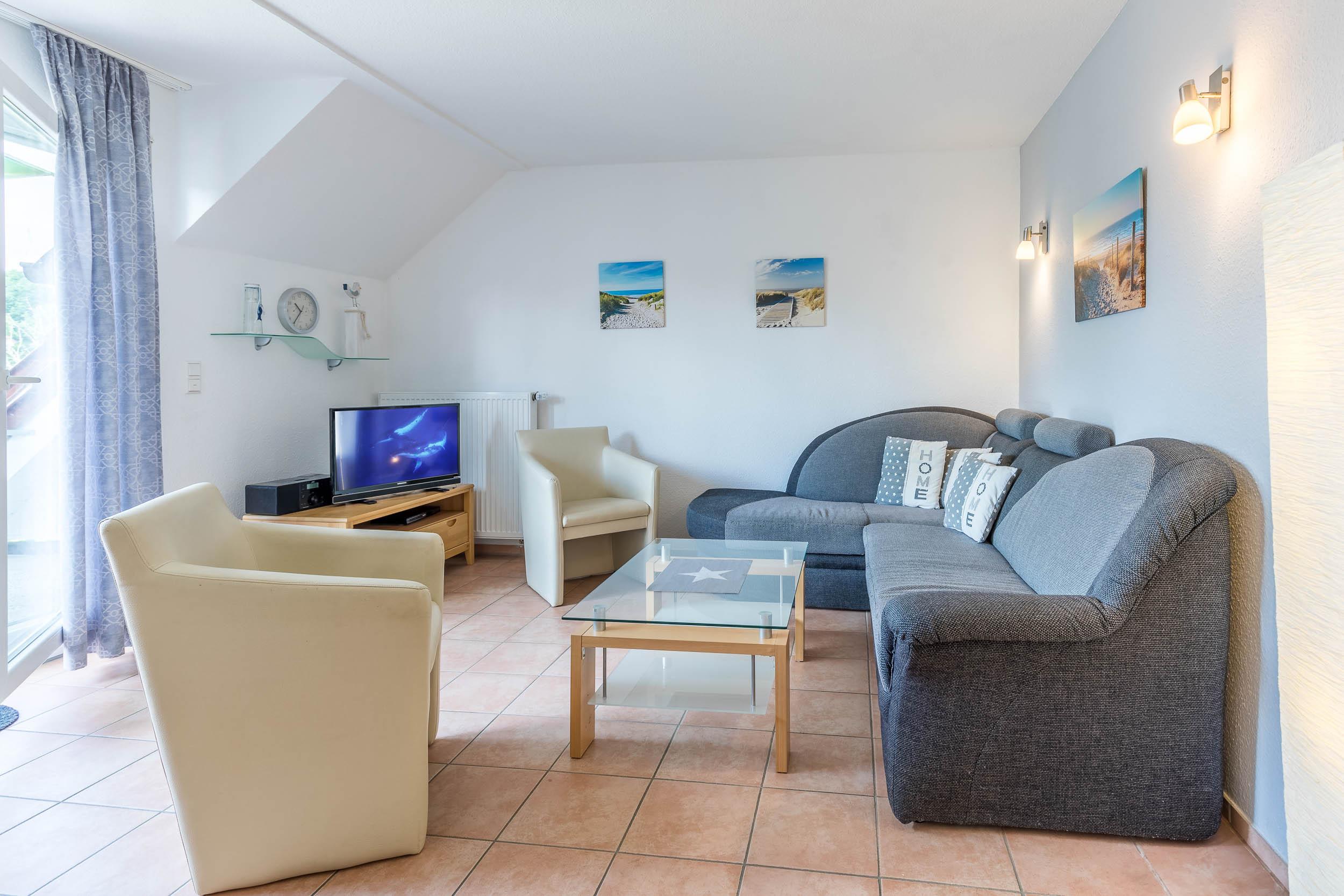 Die bequeme Wohnlandschaft im offenen Wohnbereich in der ersten Wohnebene und der Flatscreen-TV und DVD-Player laden zum gemütlichen Beisammensein ein.