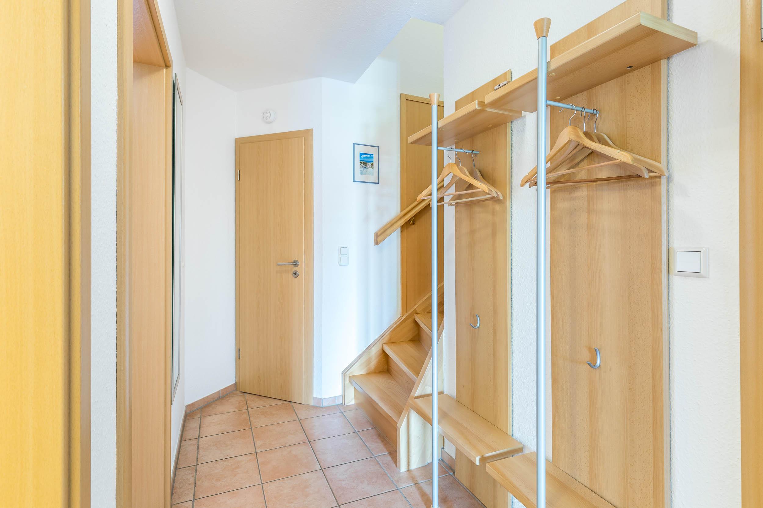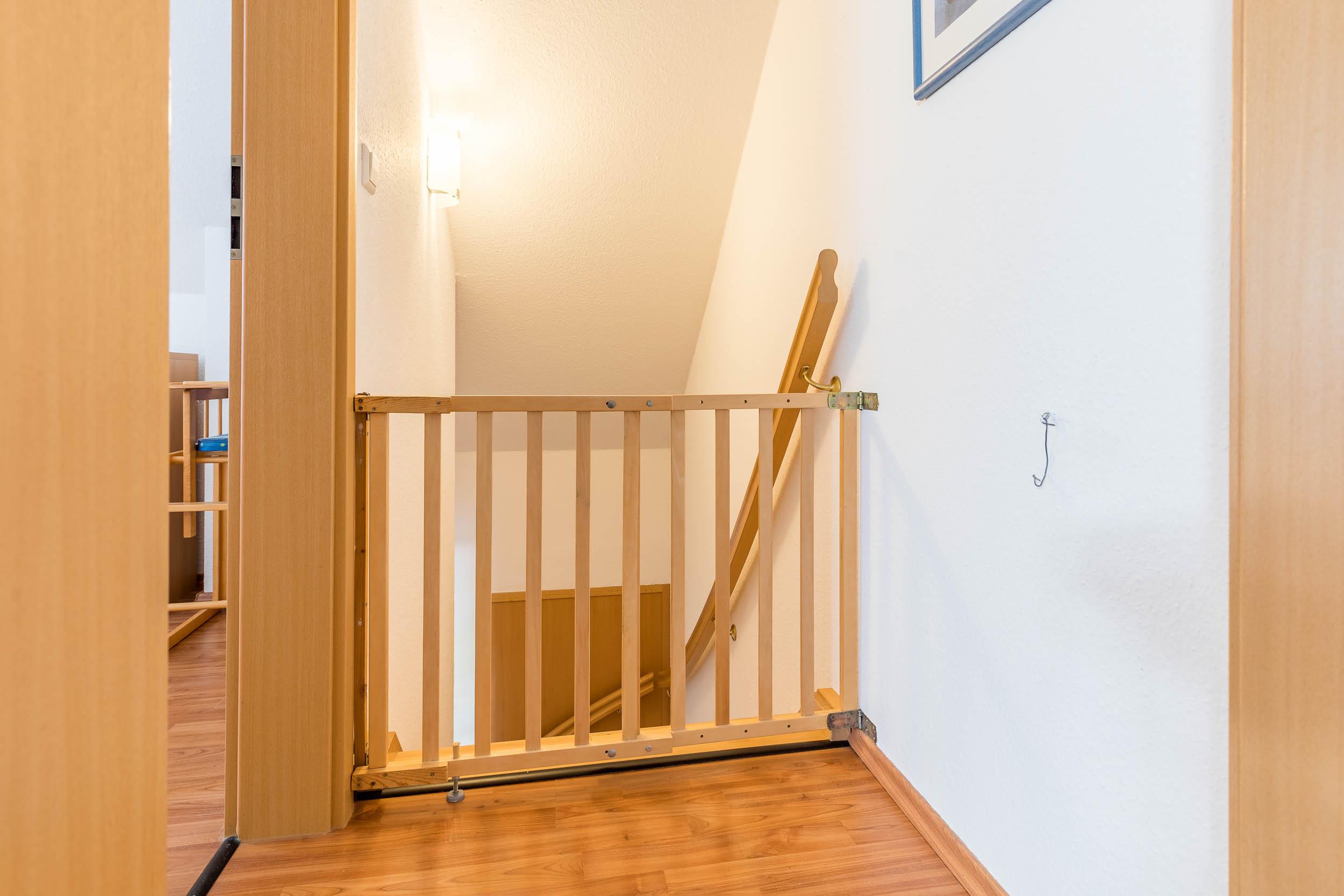 Vom Wohnungsflur aus führt eine Treppe ins Dachgeschoss. Am oberen Ende ist zur Sicherheit für unsere kleinen Gäste ein Treppenschutzgitter angebracht.