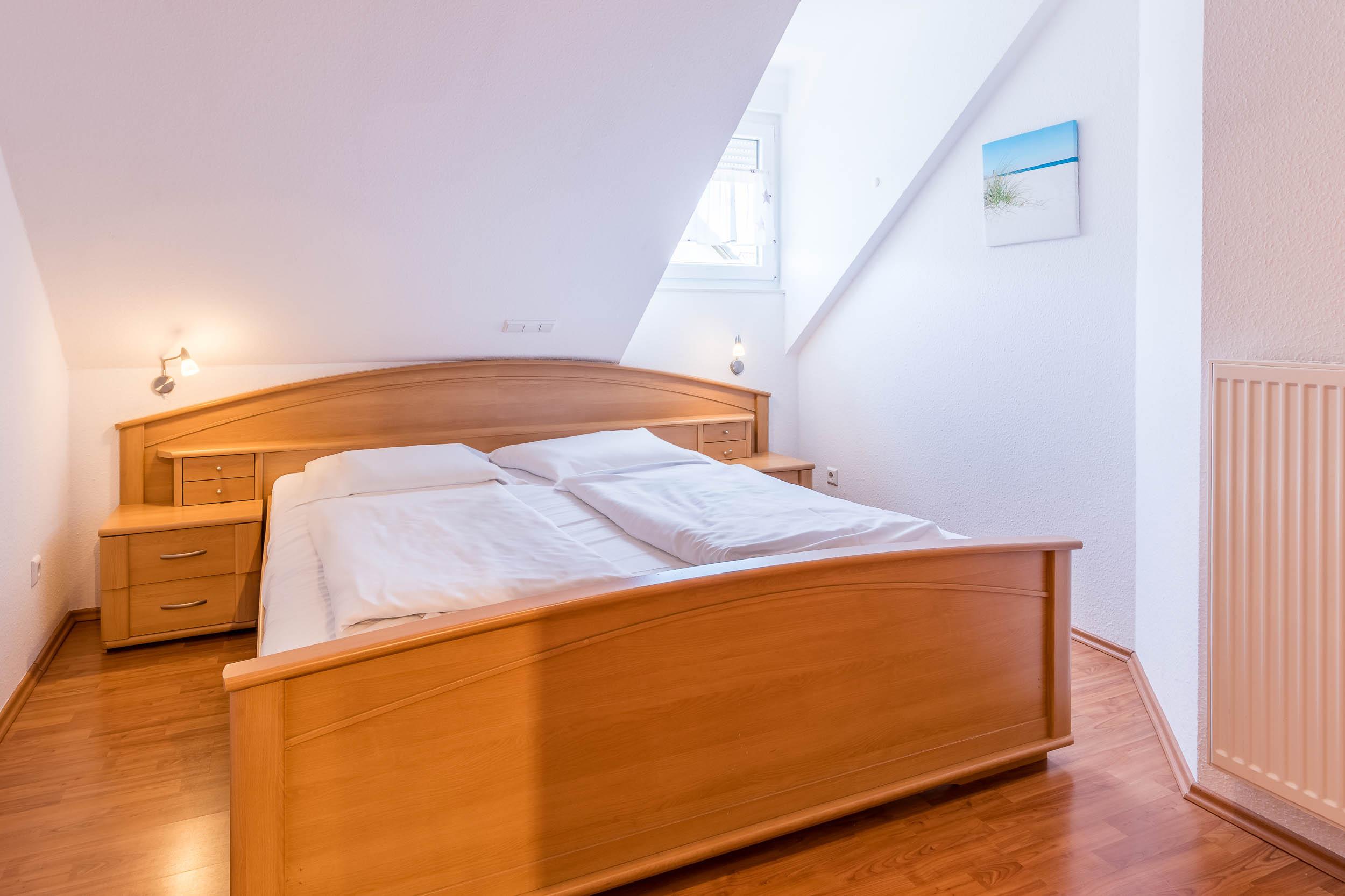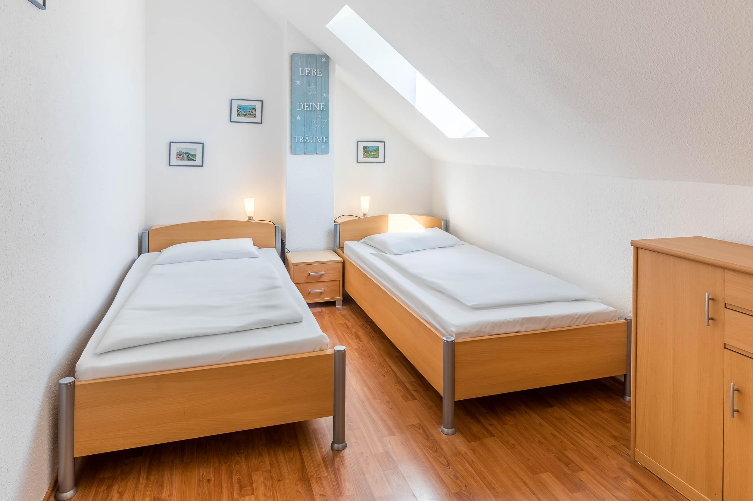 Diese Ferienwohnung verfügt über 3 Schlafzimmer. Während sich das Schlafzimmer mit dem Doppelbett und einem Kleiderschrank für Ihre Garderobe ebenfalls auf der ersten Ebene befindet, erwarten Sie im Dachgeschoss, der 2. Wohnebene die beiden Gäste-/ Kinderzimmer. Hier sind jeweils 2 Einzelbetten eingerichtet. In einem der beiden Zimmer ist zusätzlich ein kleiner Kleiderschrank, eine Kommode und ein weiterer Fernseher vorhanden. Auch für ein Reisebettchen ist hier noch genügend Platz.
