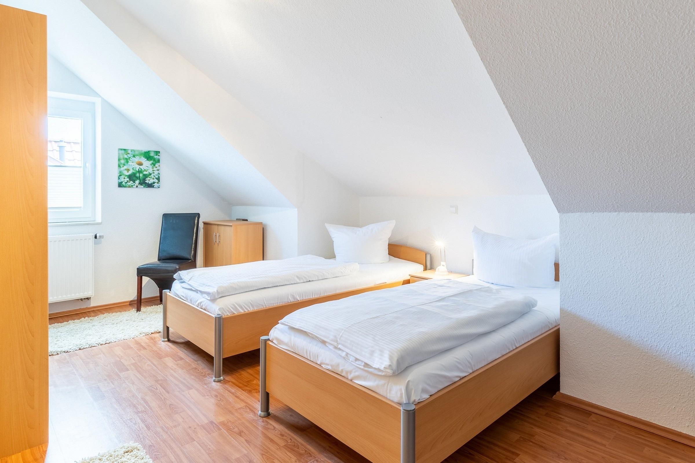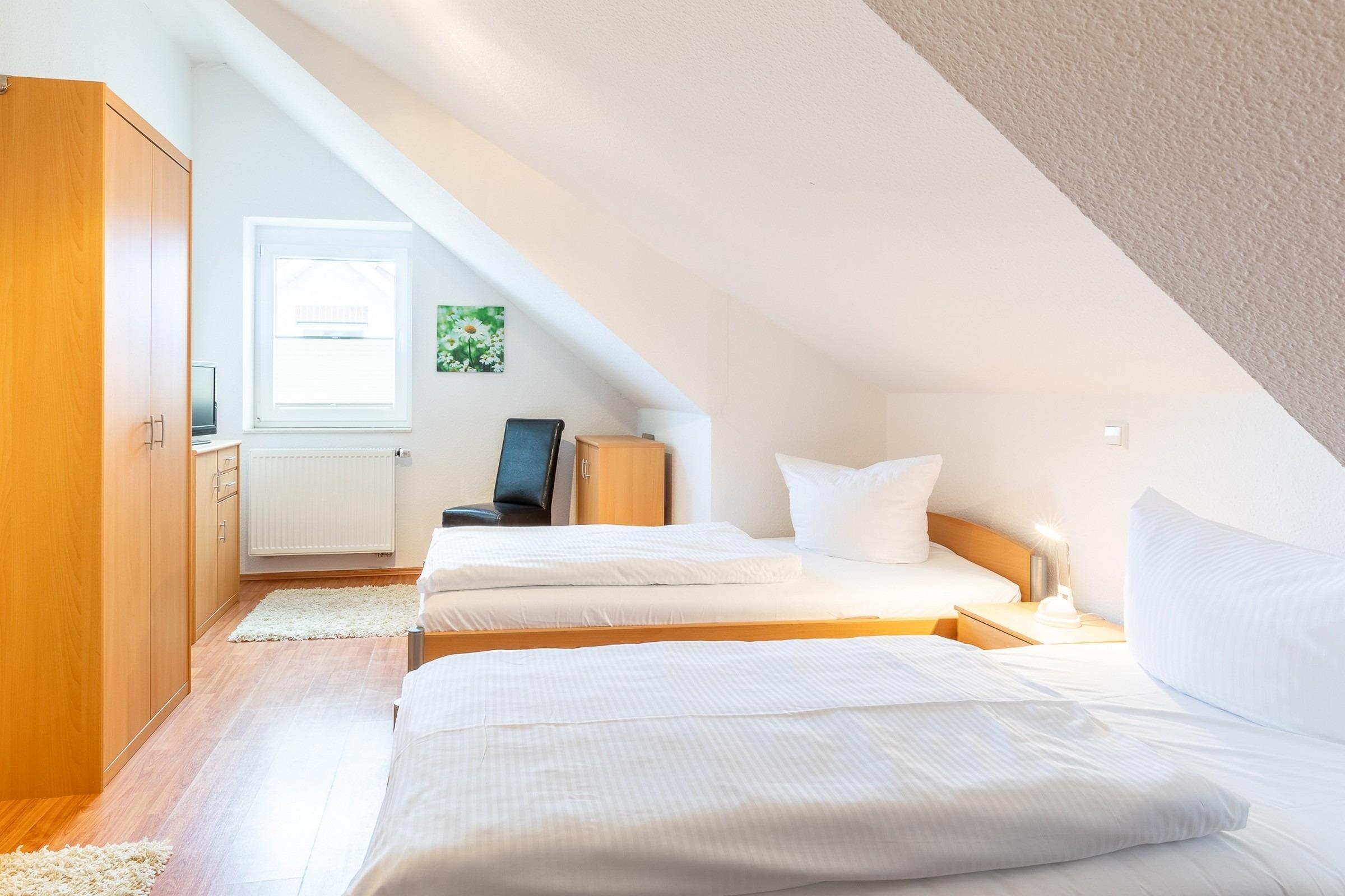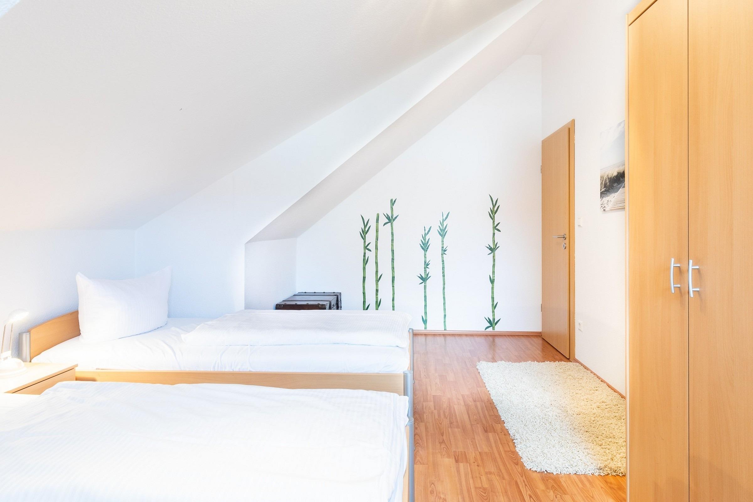 Im Dachgeschoss, der 2. Wohnebene sind die beiden Kinder-/ Gästezimmer eingerichtet. Eines davon ist mit einem Etagenbett und Kommode eingerichtet, das etwas größere Zimmer bietet 2 Einzelbetten, einen Kleiderschrank, Kommode und einen weiteren Fernseher. Hier ist auch Platz, um ein Reisebettchen aufzubauen.