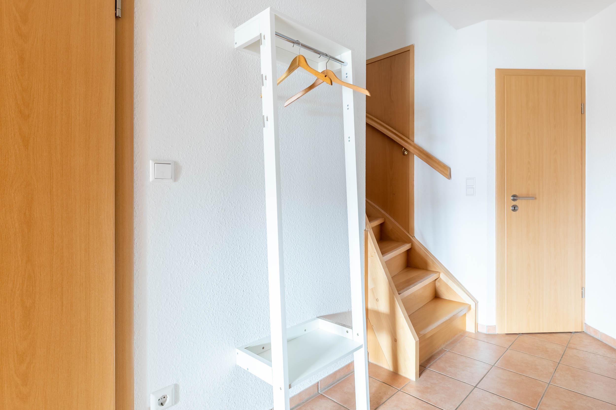 Vom Wohnungsflur aus führt eine Treppe ins Dachgeschoss. Am oberen Ende ist zur Sicherheit für unsere kleinen Gäste ein Treppenschutzgitter angebracht.