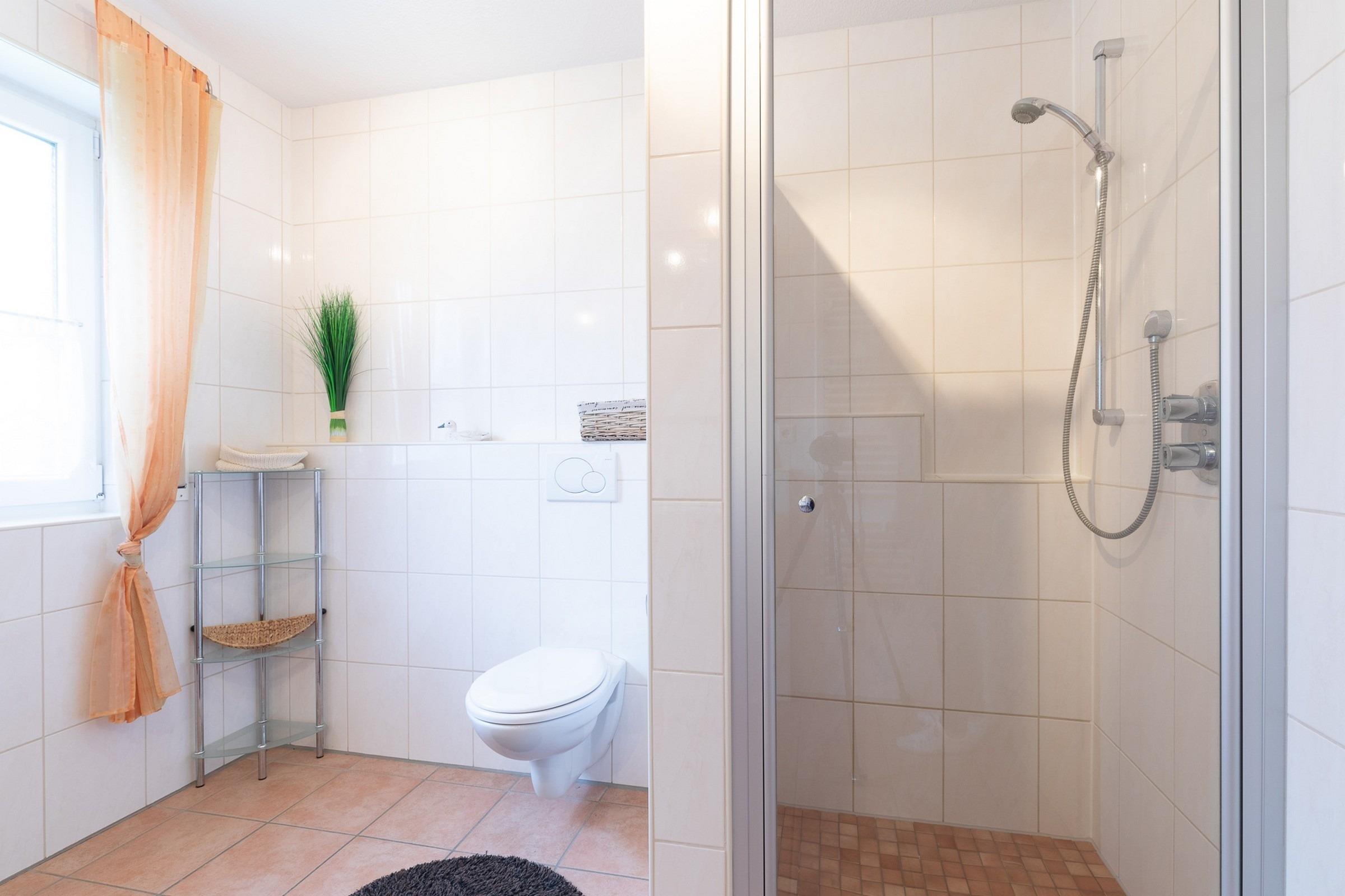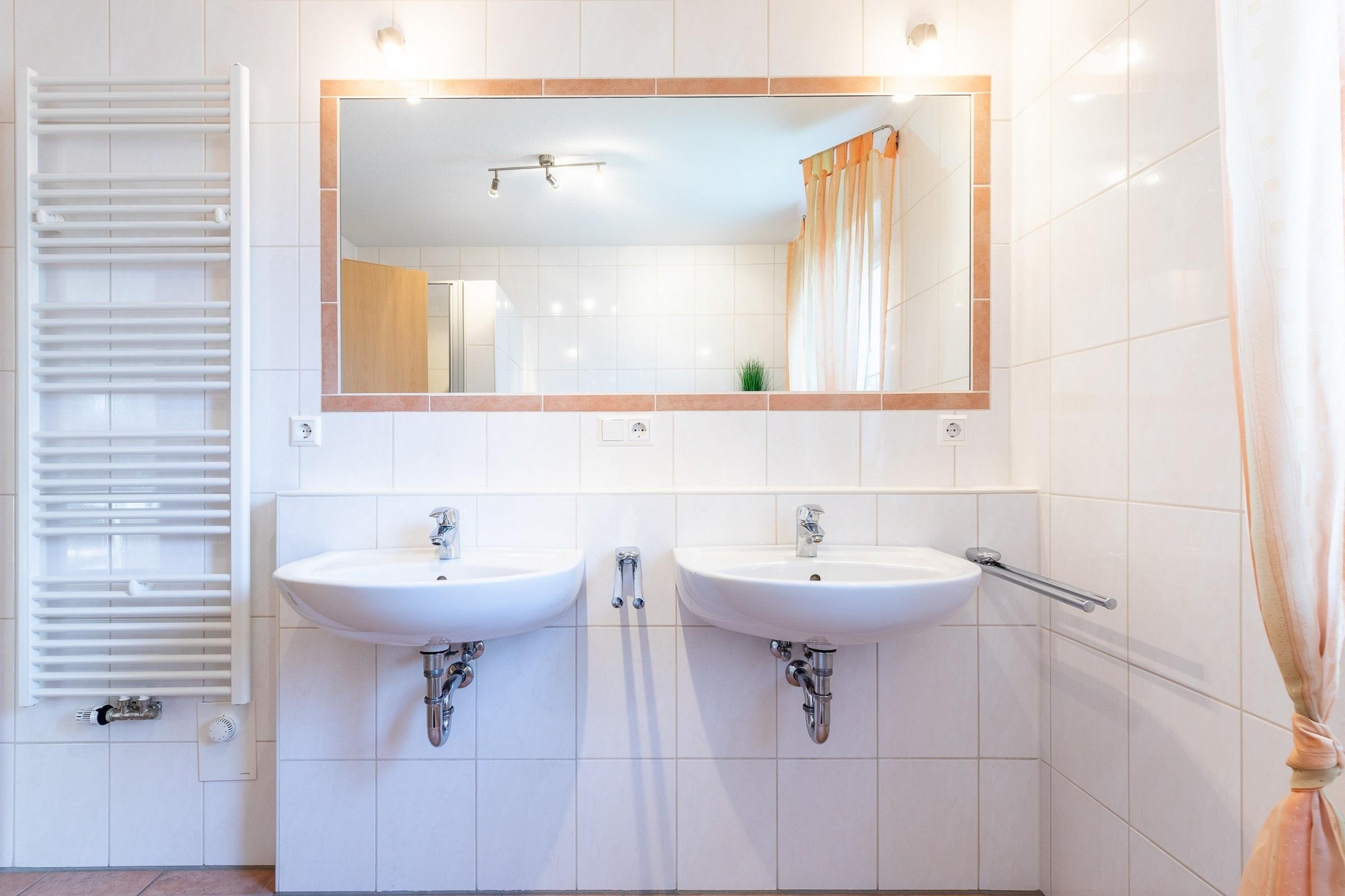 Auch das geräumige Duschbad mit Tageslicht, welches mit einer ebenerdigen Dusche, 2 Waschbecken und WC ausgestattet ist, finden Sie im unteren Bereich der Wohnung.