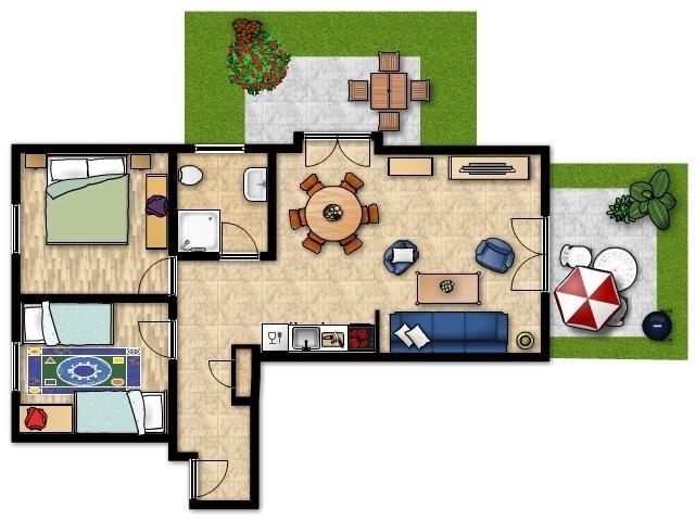 2 Schlafzimmer bieten bequeme Rückzugsmöglichkeiten. Sie sind mit einem Doppelbett in dem einen bzw. zwei Einzelbetten in dem anderen Zimmer ausgestattet. Zudem bieten beide Zimmer einen Kleiderschrank für Ihre Garderobe.