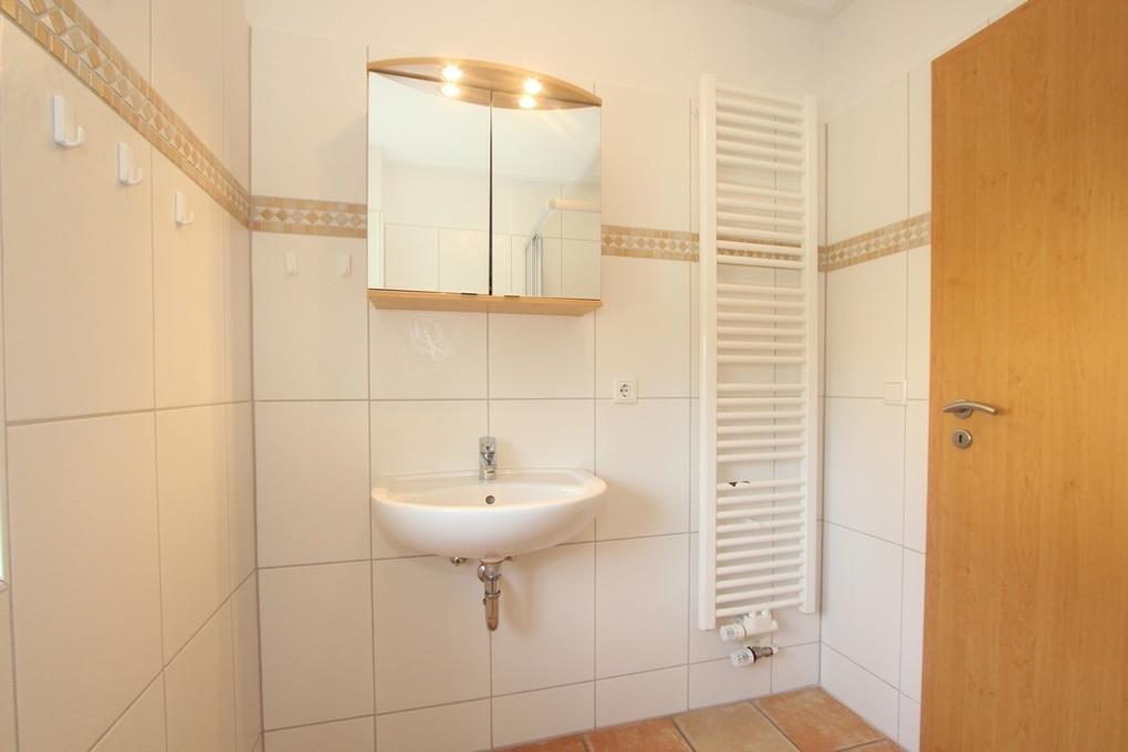 Ein helles Bad mit Tageslicht bietet Dusche, Waschbecken und WC.