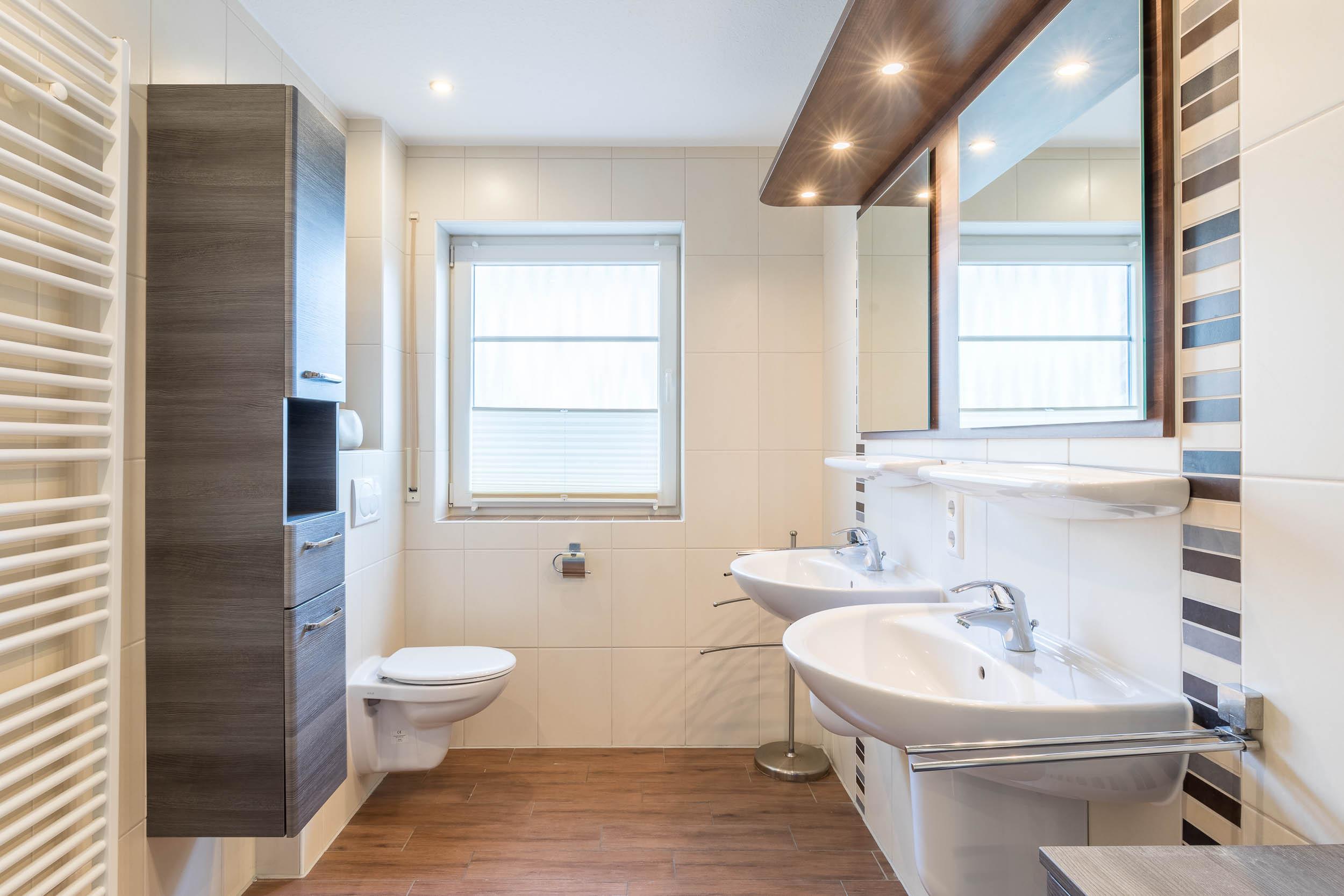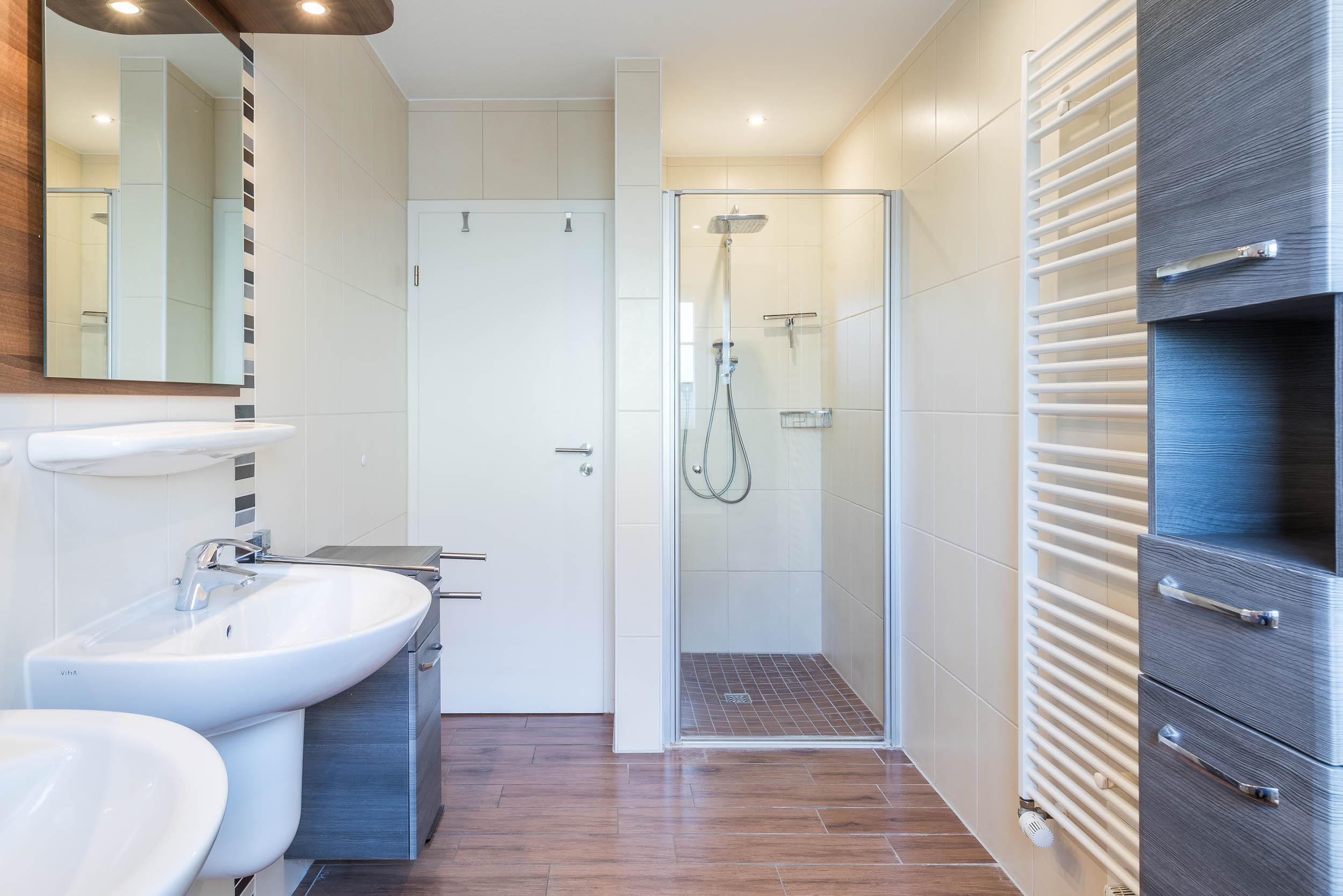 Freuen Sie sich des Weiteren auf ein großes Bad mit ebenerdiger Dusche, 2 Waschbecken und WC und ein weiteres separates Gäste-WC.