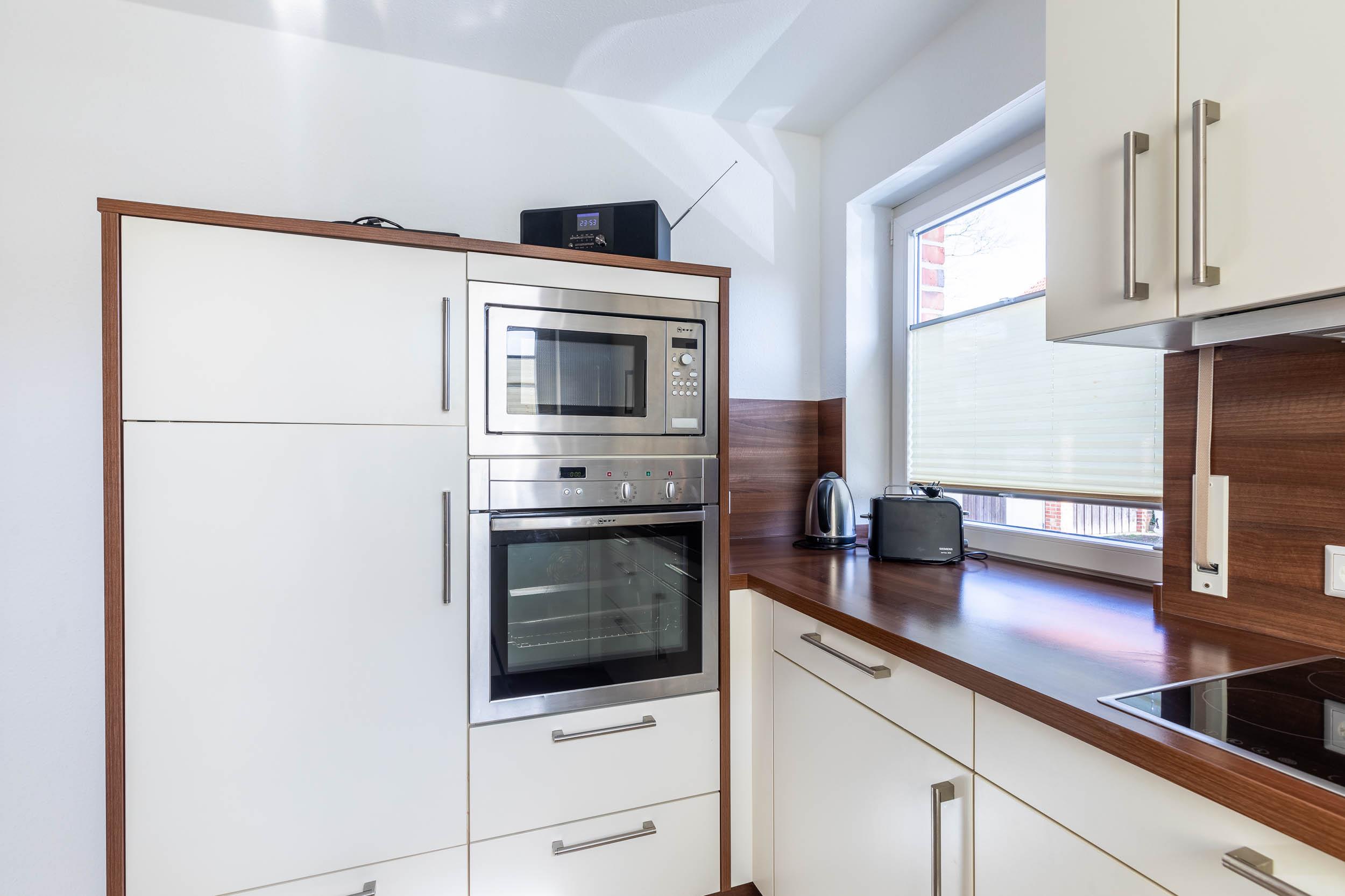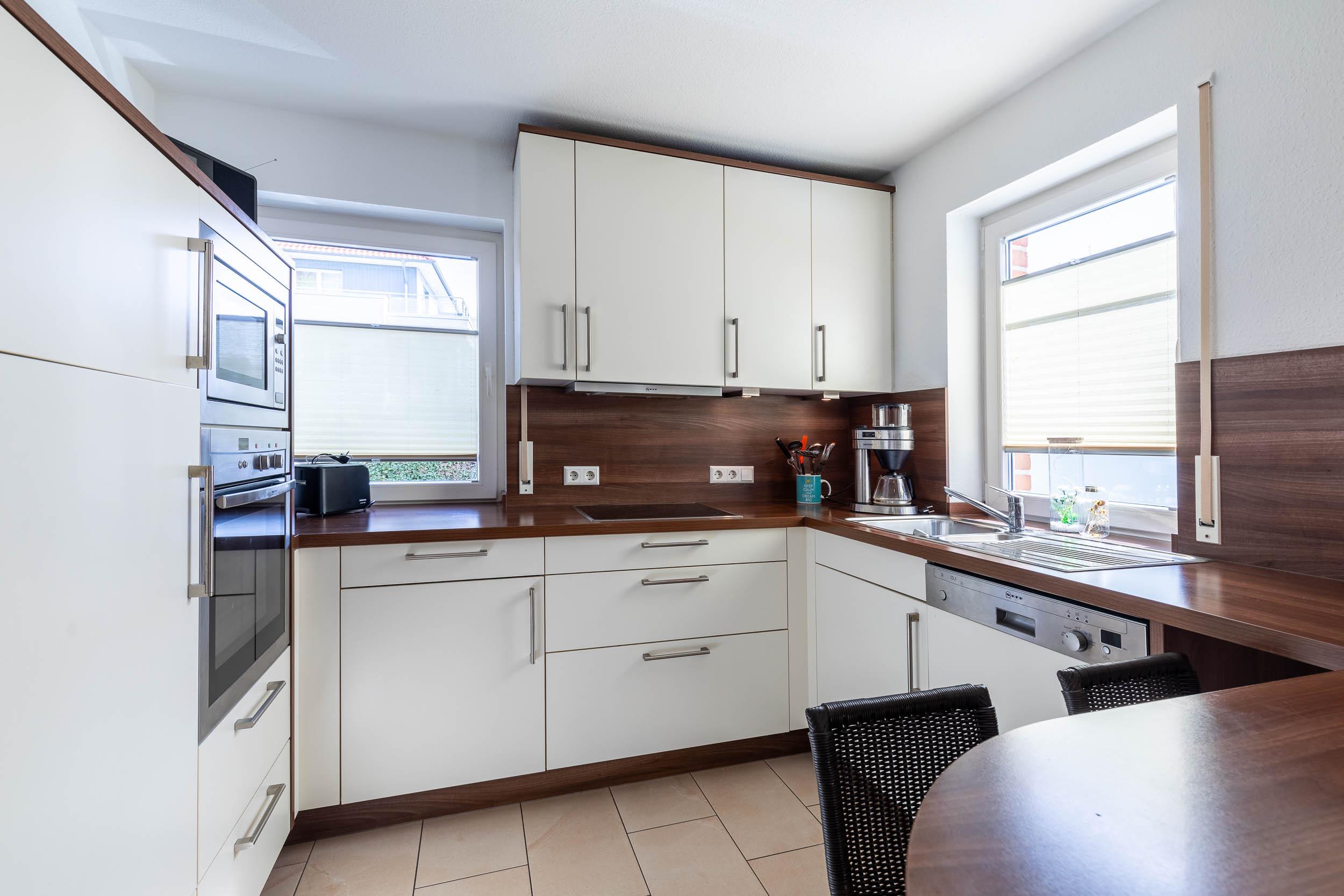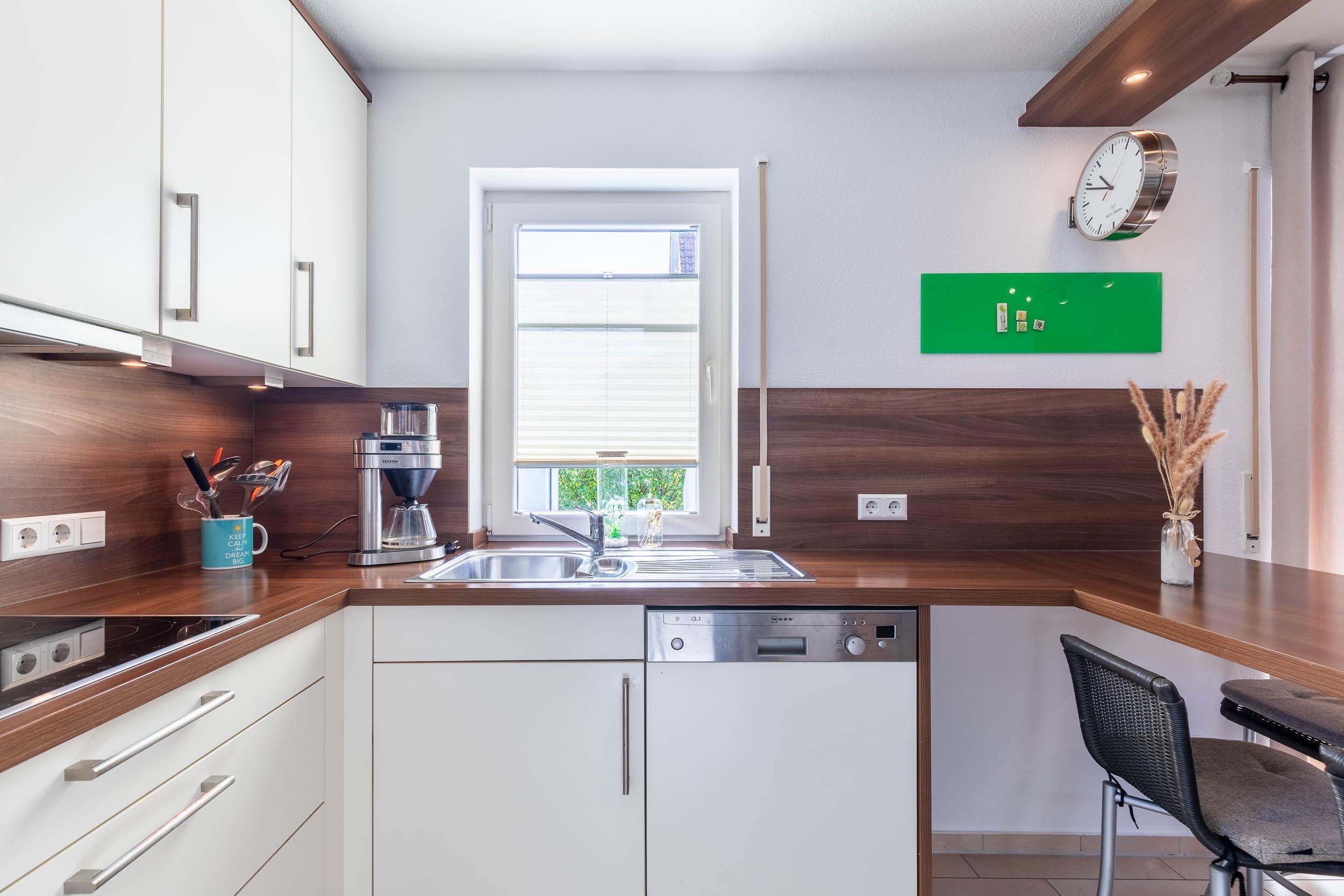 Die offene, moderne Küchenzeile mit angeschlossenem Essbereich ist voll ausgestattet. Auch eine Spülmaschine ist vorhanden.