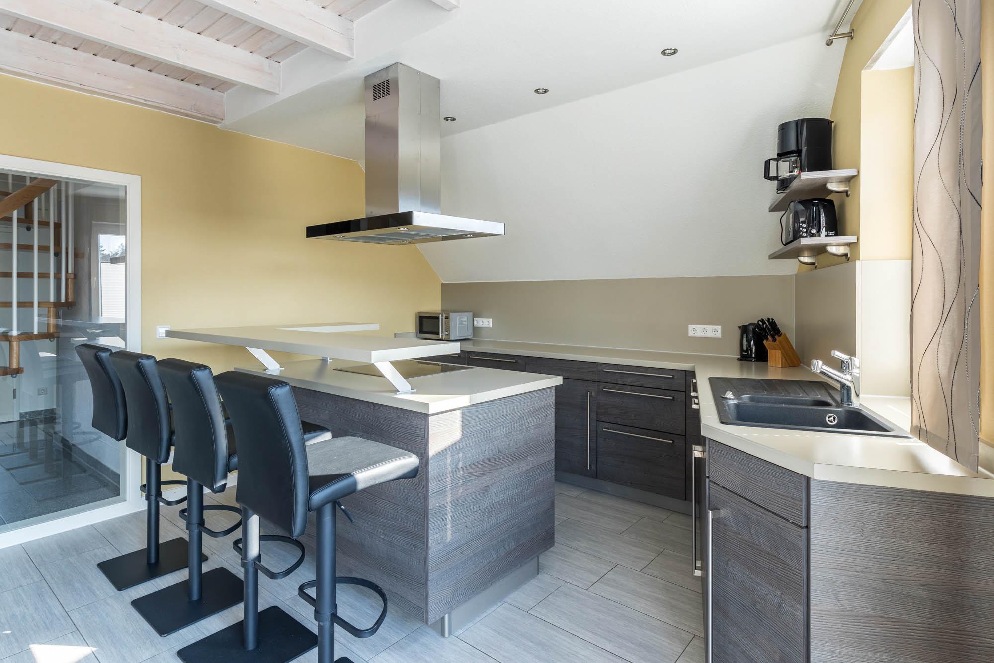 Ein absolutes Highlight ist die offene, exklusiv eingerichtete Küche, in der Sie unter anderem ein Cerankochfeld, einen Geschirrspüler, eine Mikrowelle vorfinden. Toben Sie sich an der großen Kochinsel gern kreativ aus. "Zuschauer" können derweil an der Bar Platz nehmen. Ob Sie dann anschließend direkt an der Bar oder doch lieber an der Essecke Ihre Mahlzeiten einnehmen, entscheiden Sie selbst.