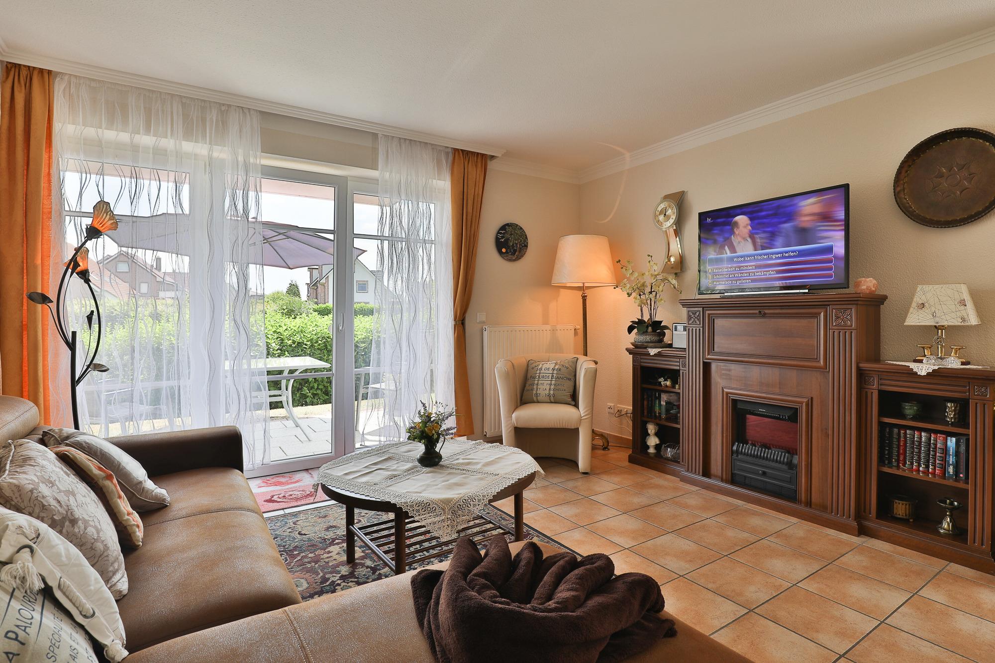 Vom Wohnbereich mit SAT/WLAN-TV und DAB Radio gelangen Sie sowohl auf die möblierte Südterrasse als auch auf die zweite, in östlicher Richtung gelegene möblierte Terrasse, auf denen Sie den ganzen Tag über sonnenverwöhnte Stunden genießen können.
