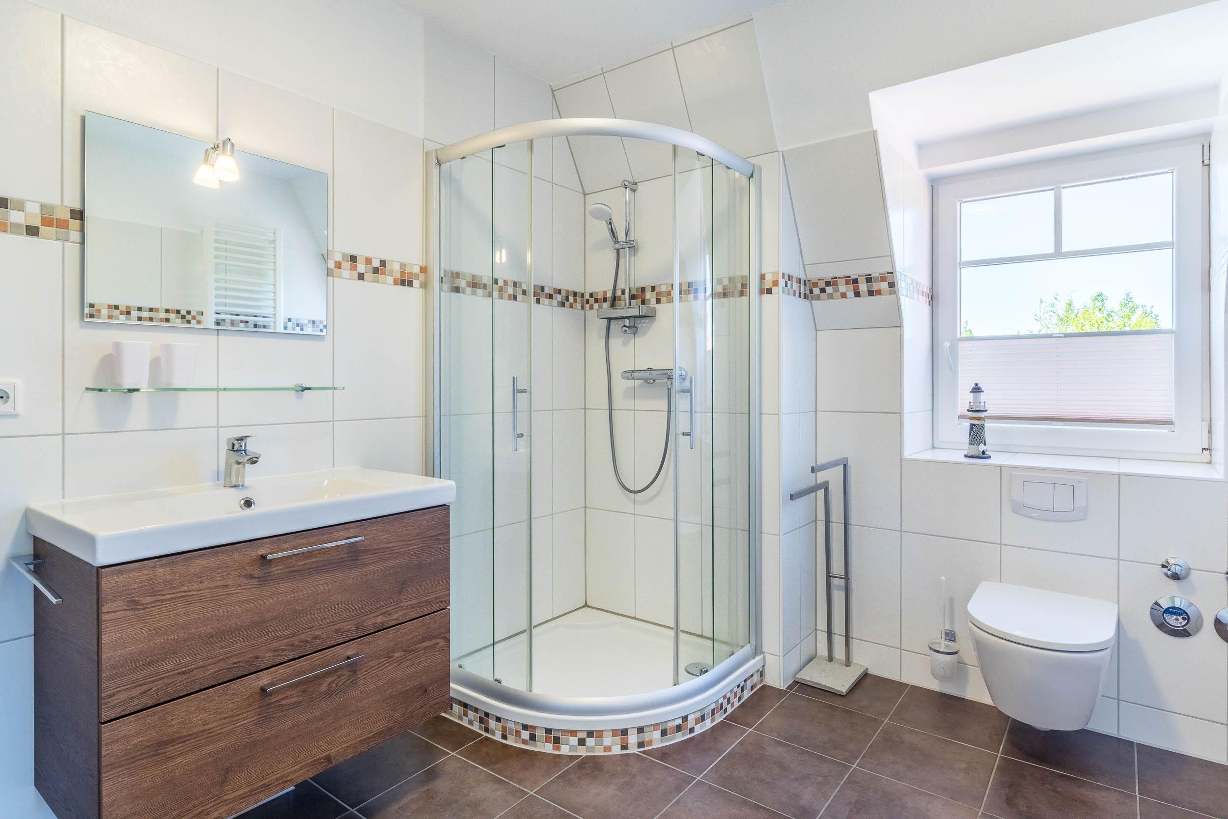 Das schick geflieste Bad bietet Dusche und WC. Eine große Handtuchheizung sorgt zusätzlich für wohlige Wärme. Das Fenster spendet angenehmes Tageslicht und hilft beim Lüften nach dem Duschen.