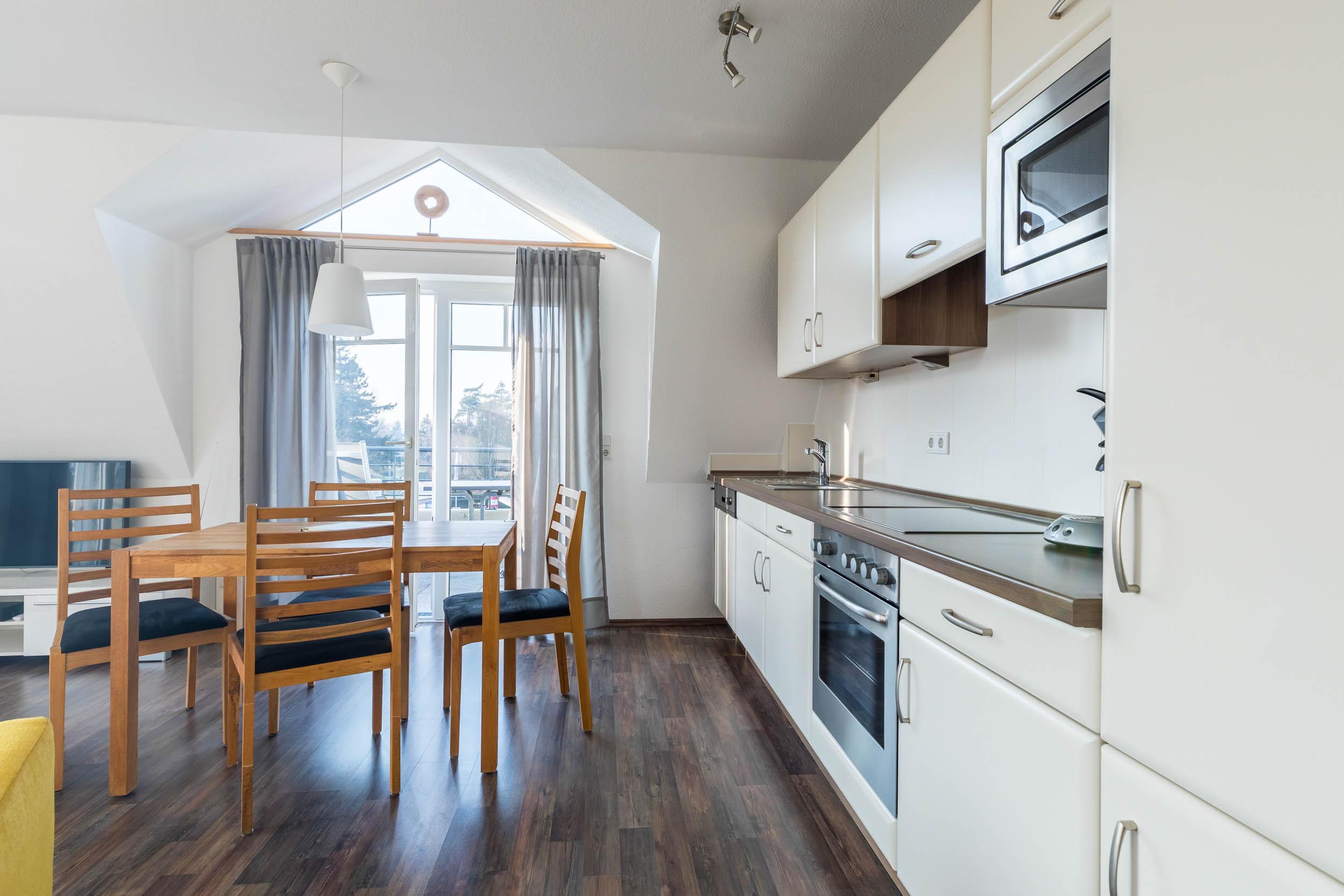Die Wohnküche mit offener Küchenzeile und bequemer Essecke lädt zu gemütlichen Mahlzeiten ein. Zu den hilfreichen Haushaltsgeräten gehören u.a. eine Mikrowelle und ein Geschirrspüler.