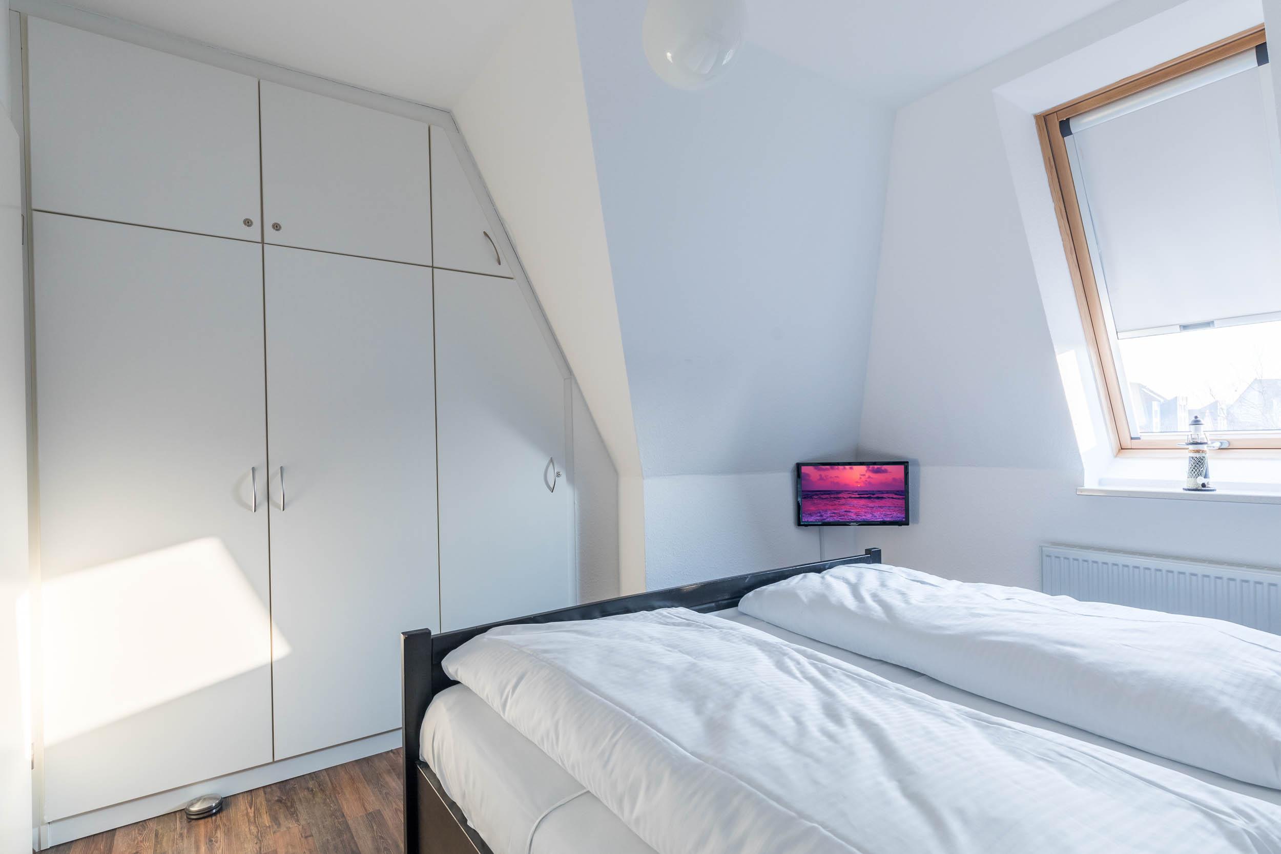 Ein TV-Gerät befindet sich ebenfalls im Schlafzimmer, in dem ein bequemes Doppelbett sowie ein Kleiderschrank stehen.