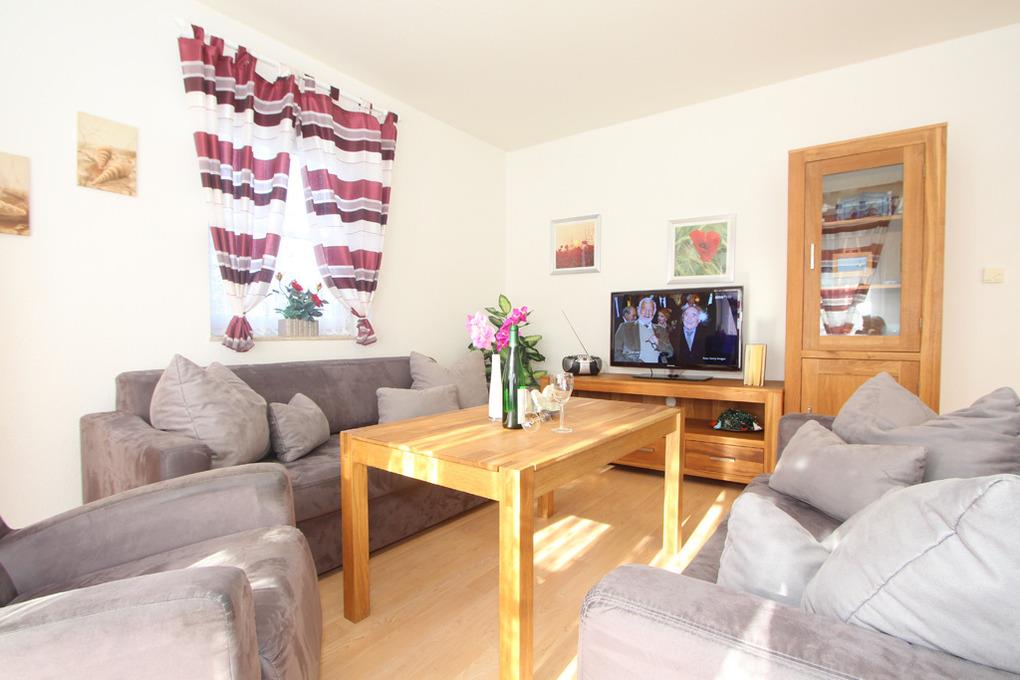 Zur Einrichtung des Wohnzimmers gehört neben einer gemütlichen Sitzecke, Holzmöbeln natürlich auch ein Flatscreen-TV (Sat).