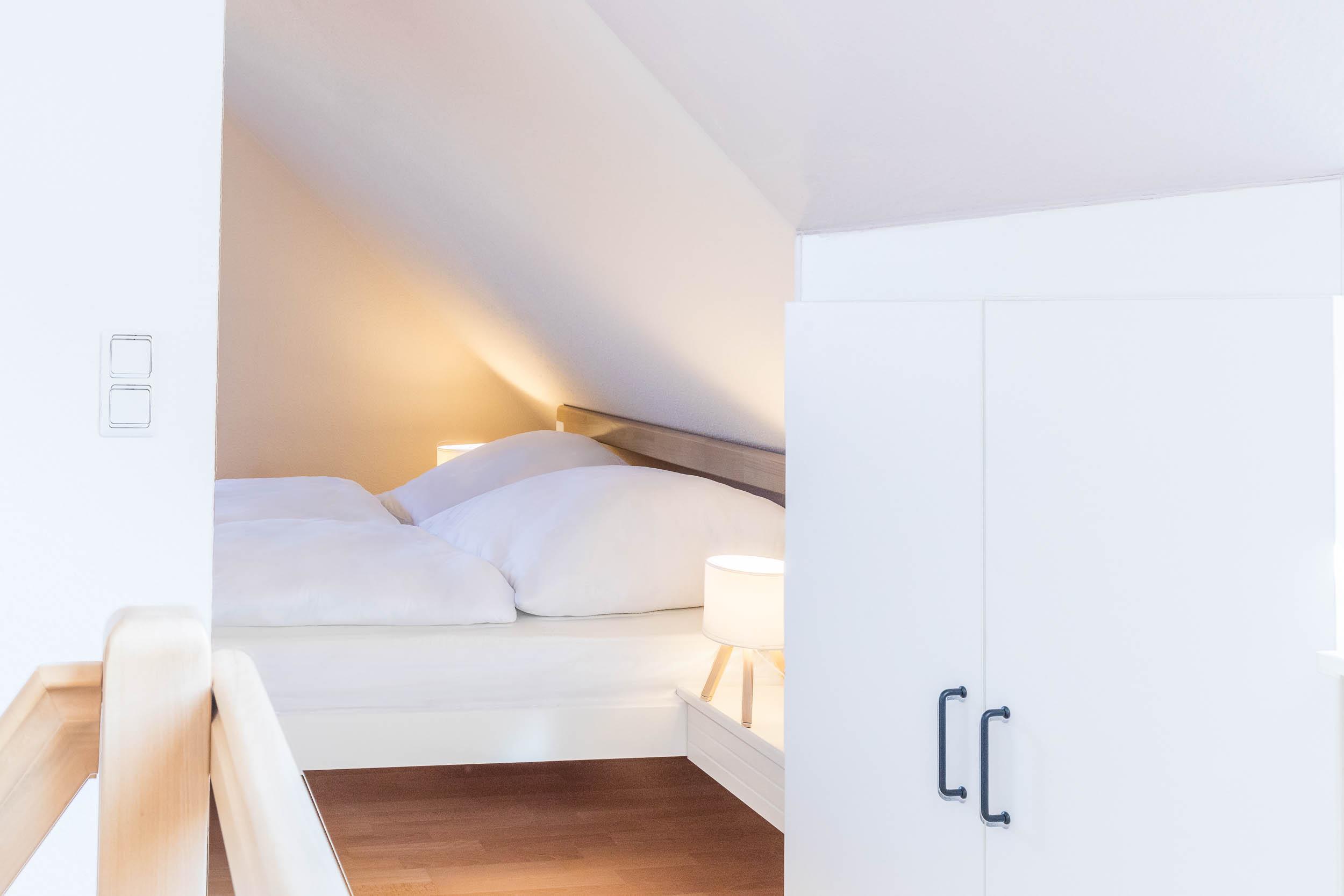 Die offene Galerie in der zweiten Wohnebene, im DG ist mit einem weiteren Doppelbett ( 180x200 ) sowie einer Kommode für die Ablage ausgestattet. Hier wäre auch Platz für ein Kinderreisebettchen.
